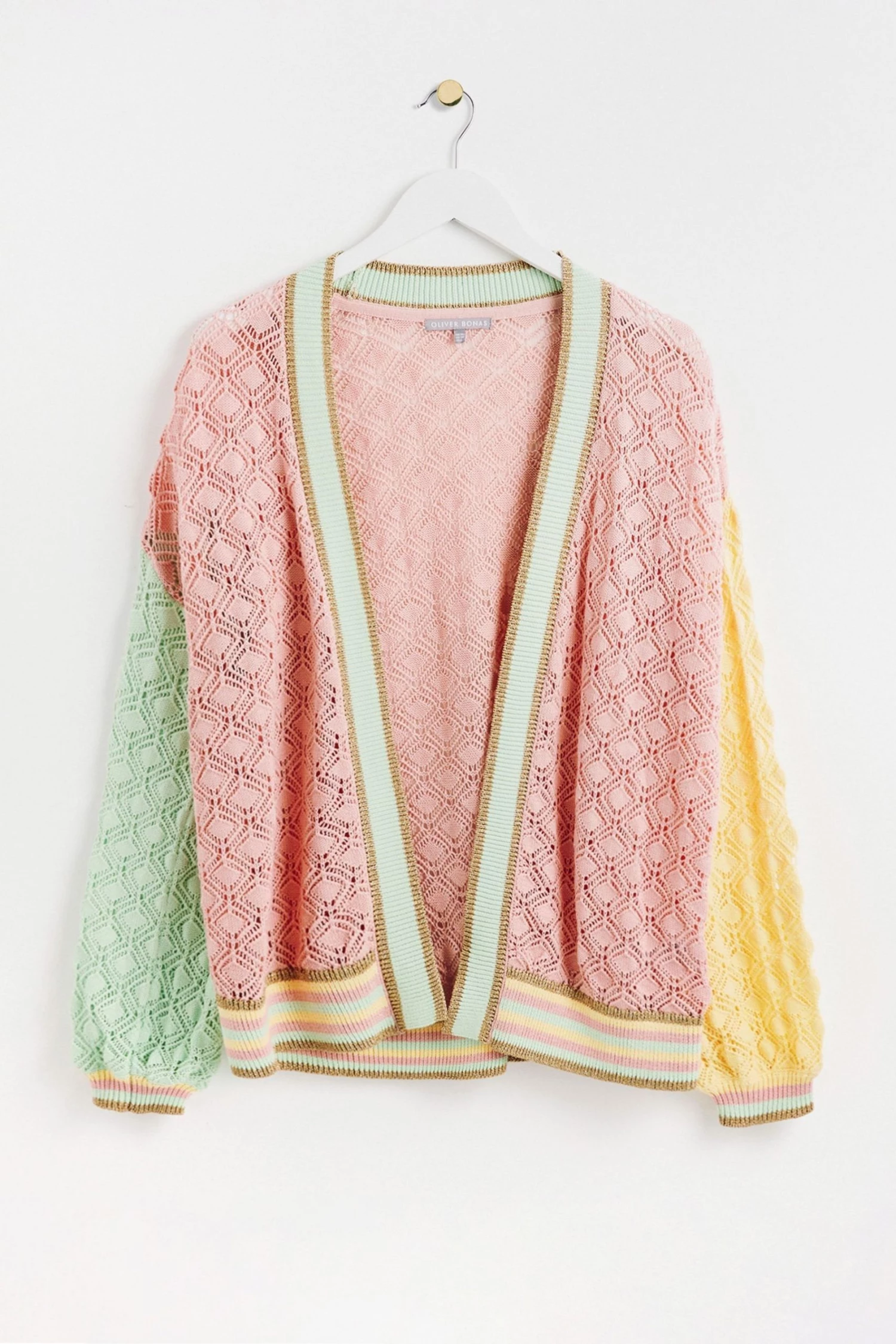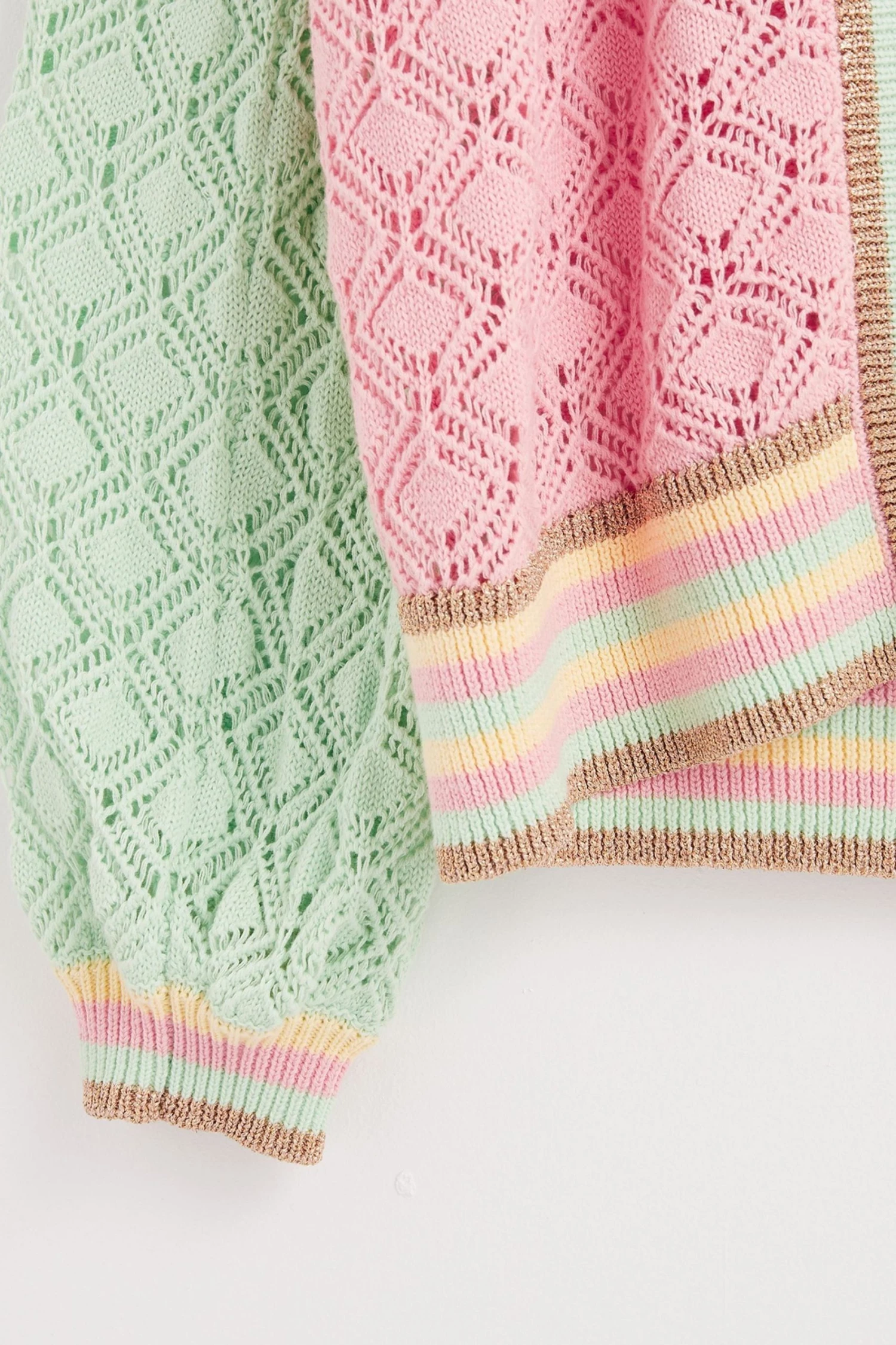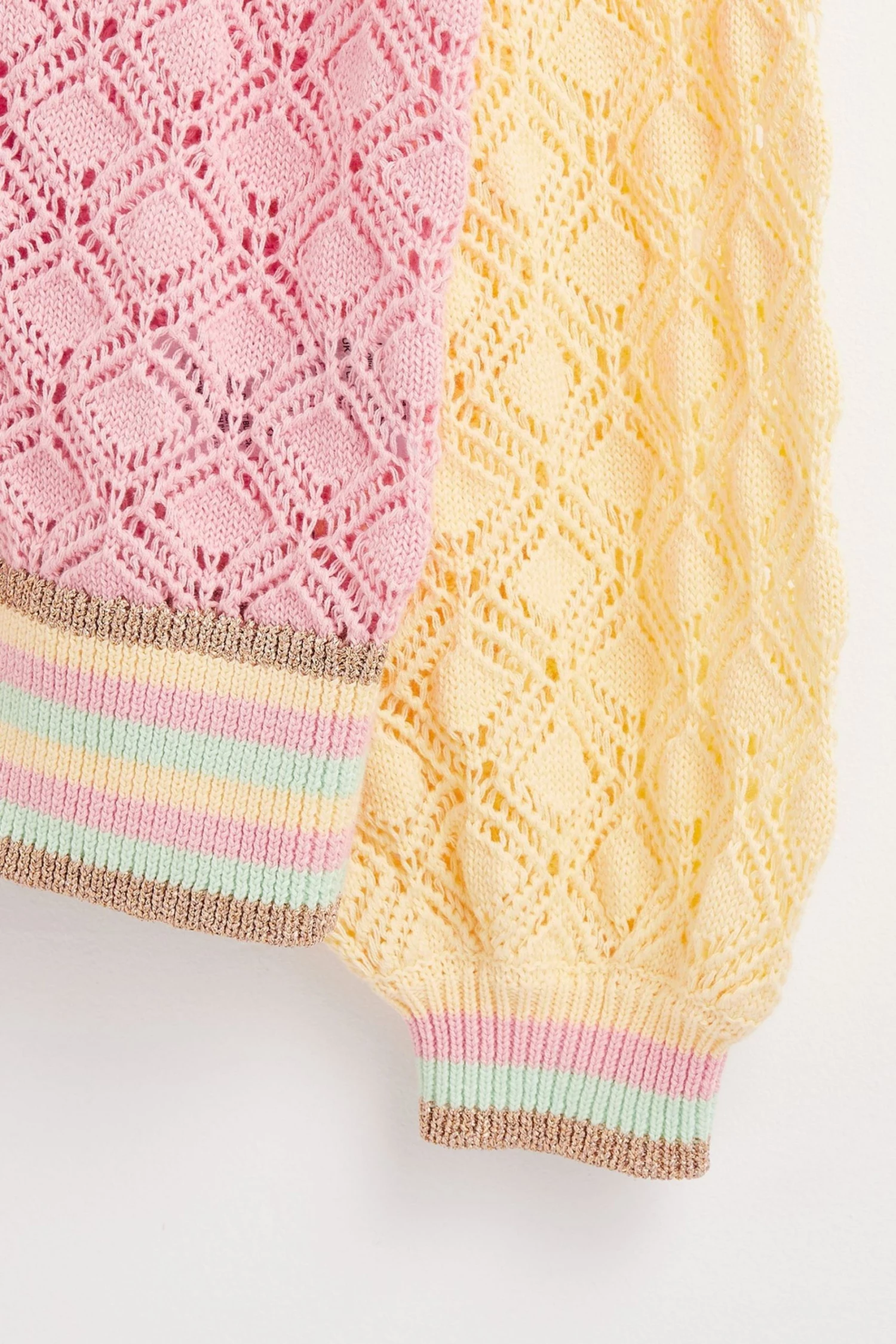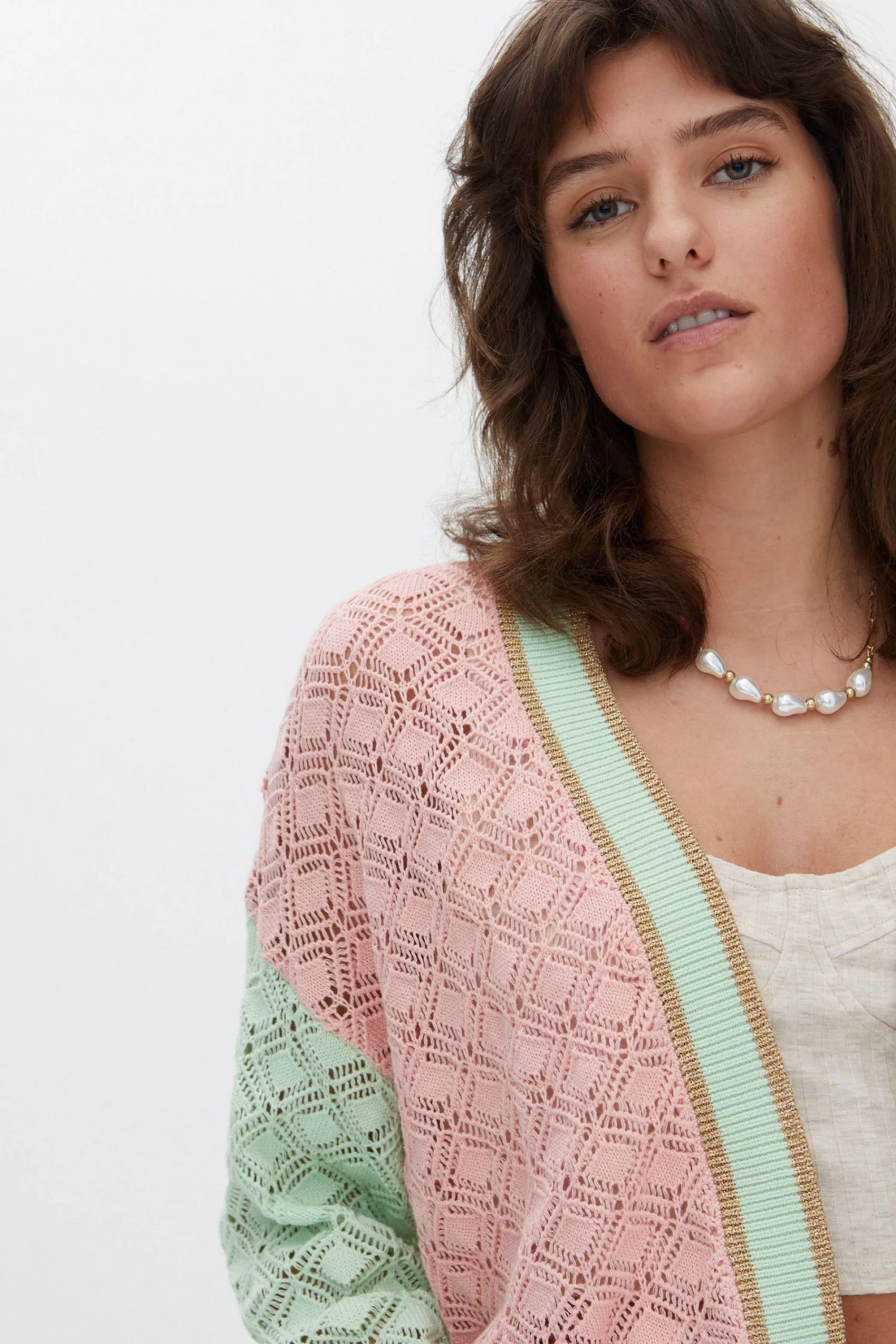 Bring a pop of pastels to your knitwear collection with this colour block cardigan. In pink, mint green and yellow hues, it features an all over pointelle stitch pattern with shimmering metallic gold details and an oversized fit.