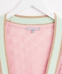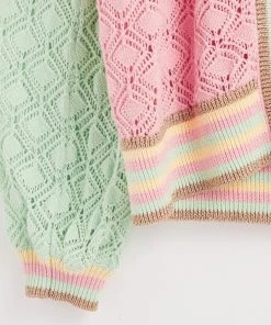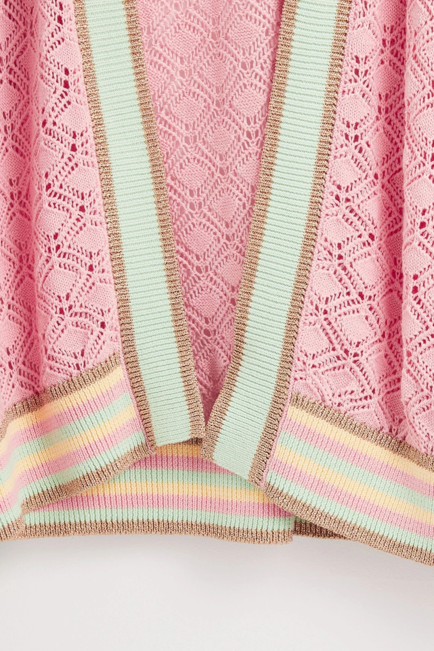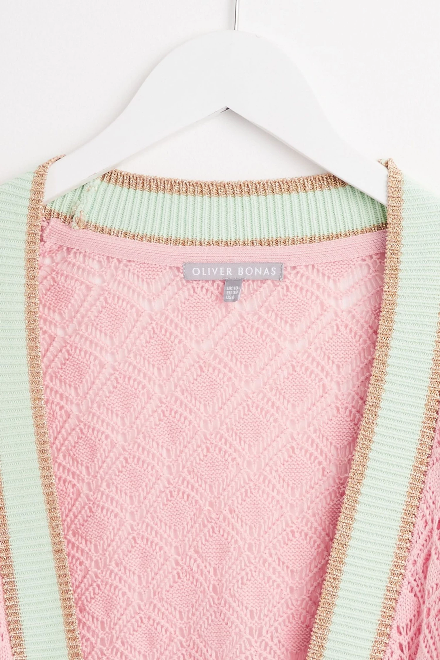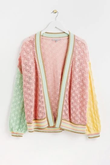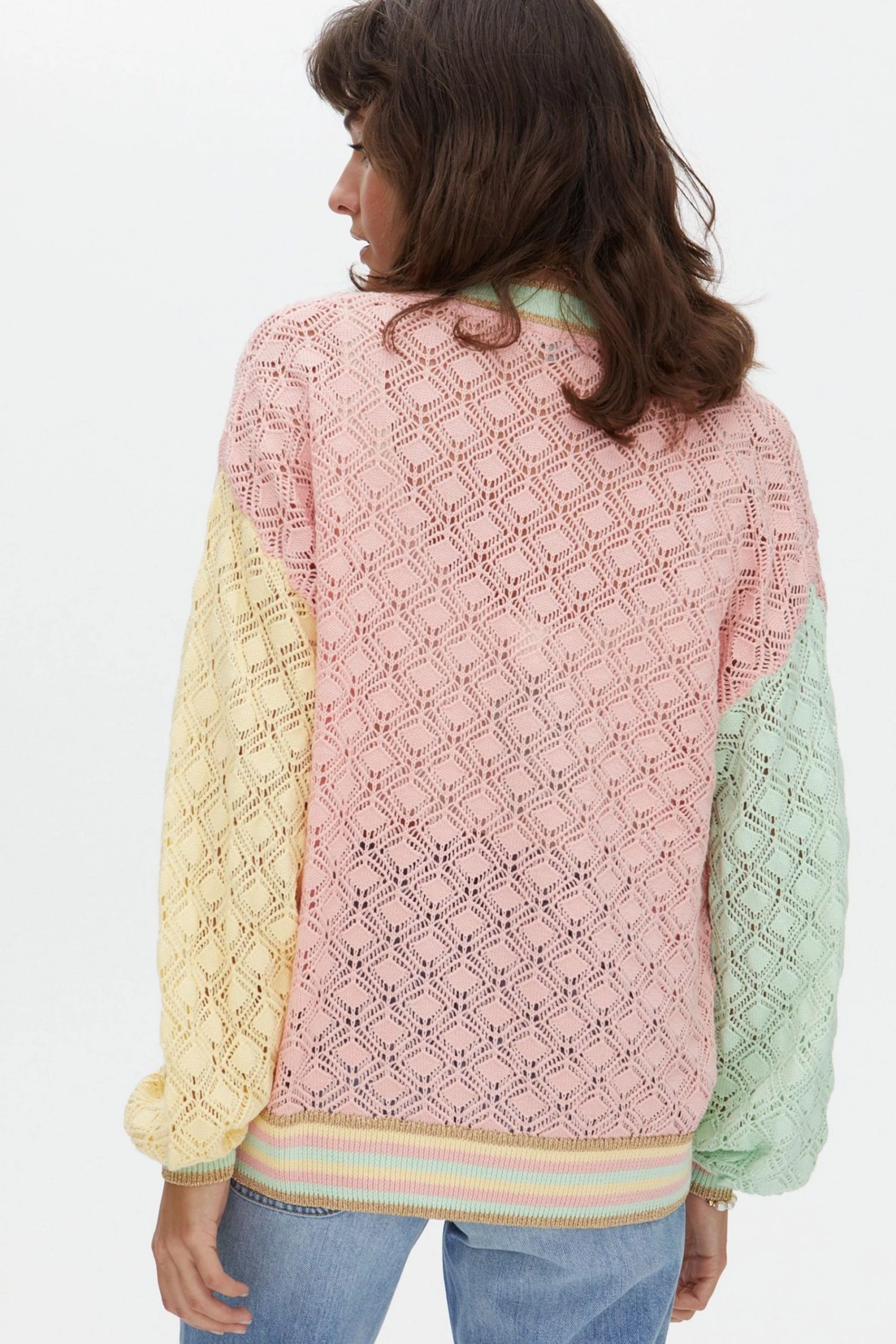 Bring a pop of pastels to your knitwear collection with this colour block cardigan. In pink, mint green and yellow hues, it features an all over pointelle stitch pattern with shimmering metallic gold details and an oversized fit.