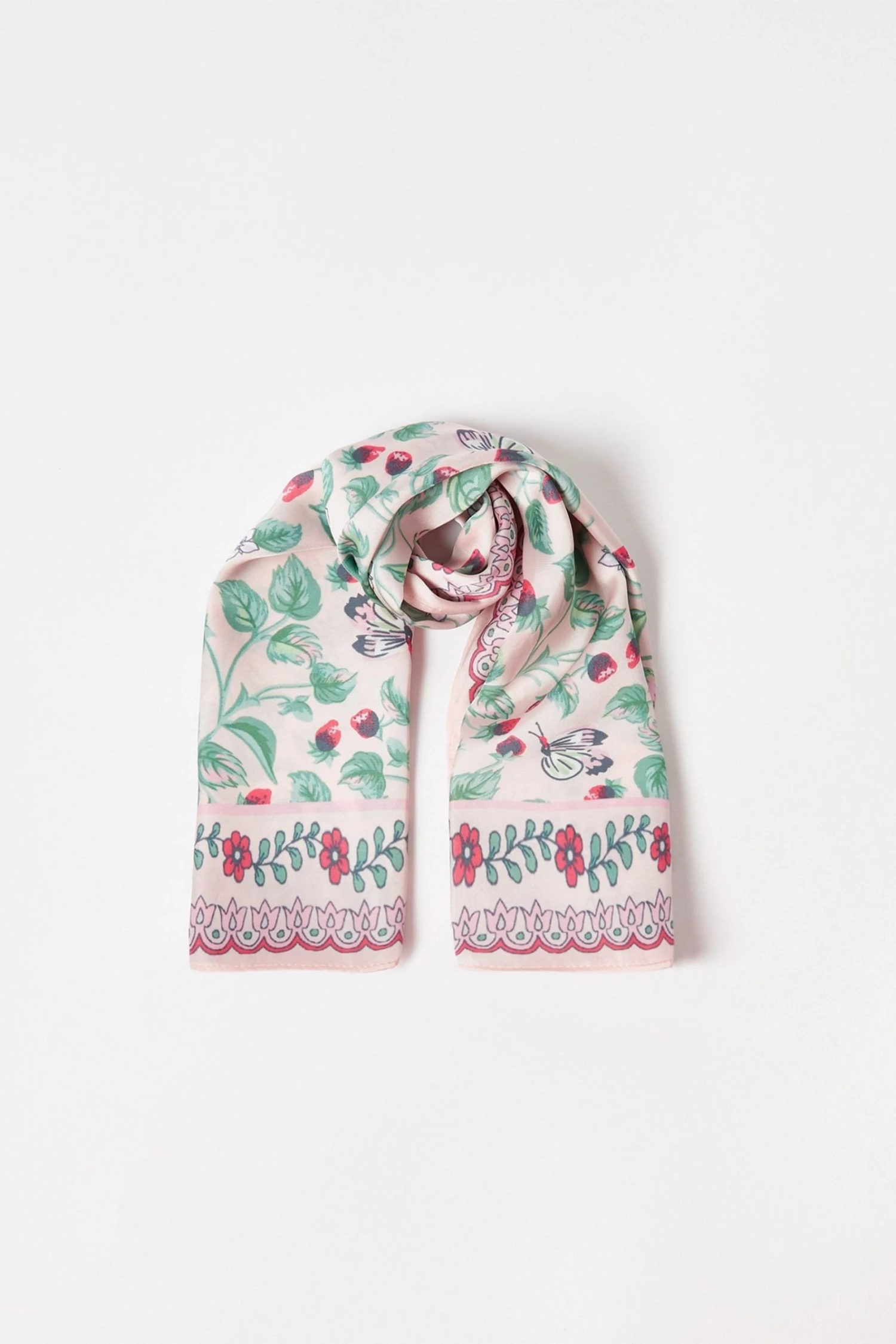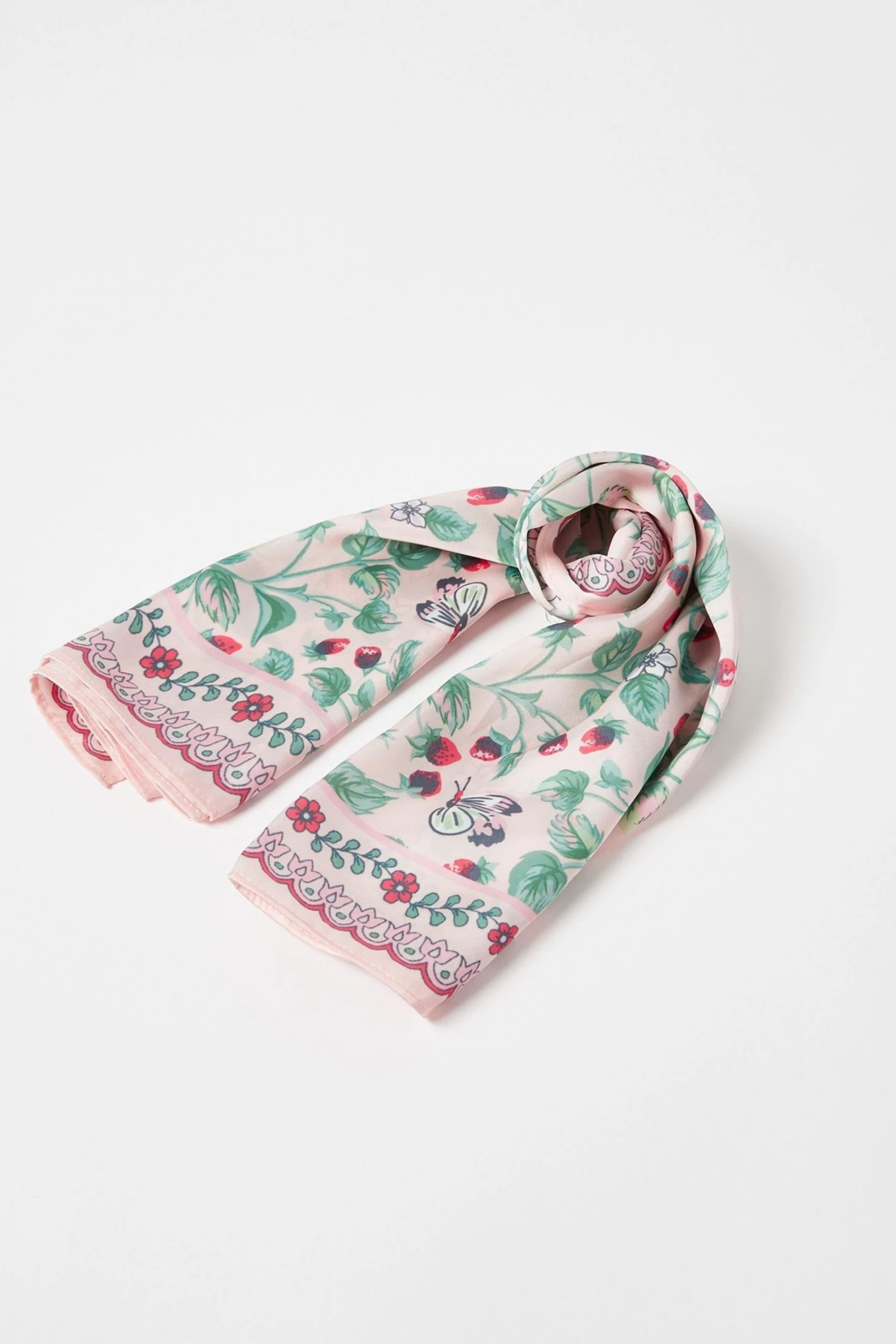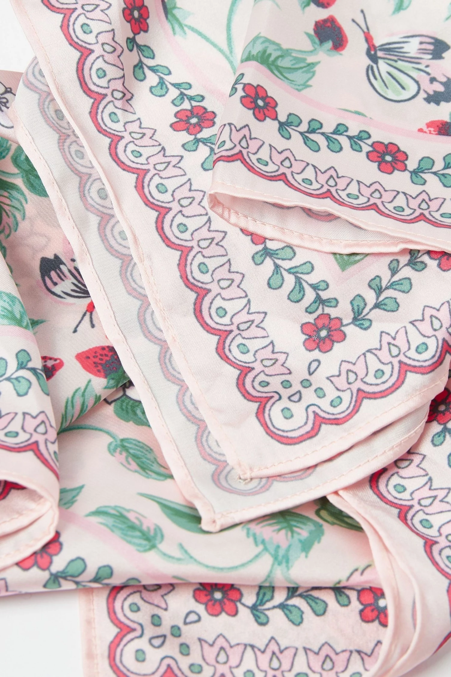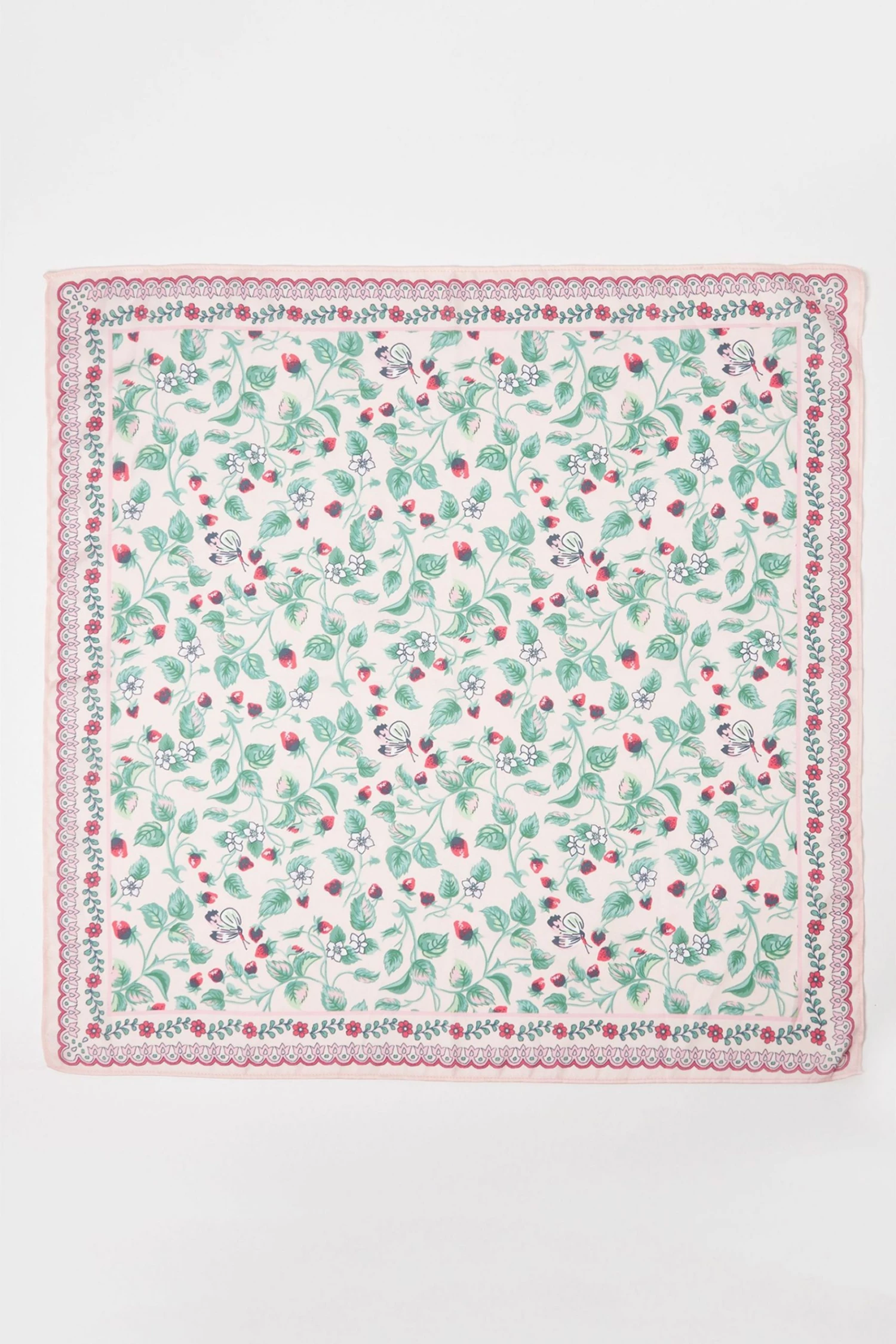 Combining a fresh strawberry and floral pattern with scallop print detailing, this square light weight scarf with bursts of red and green is made for the spring season.