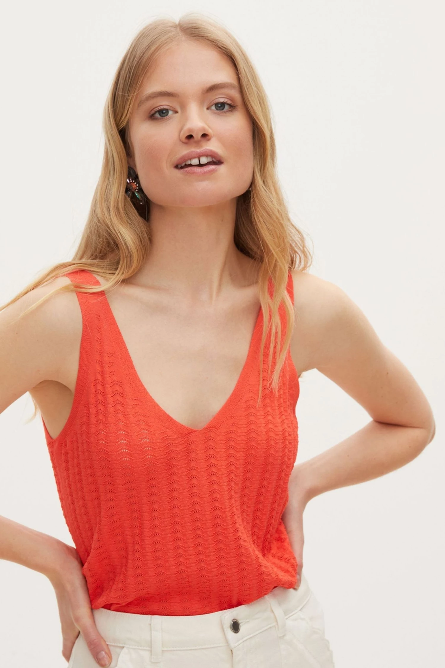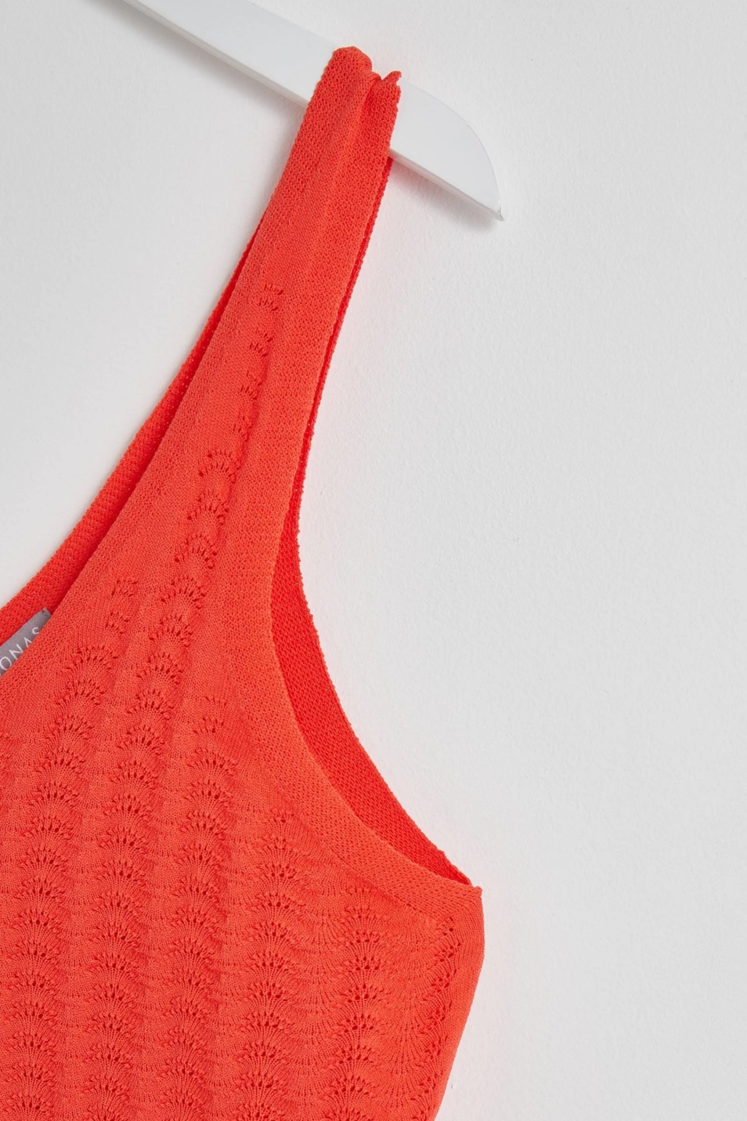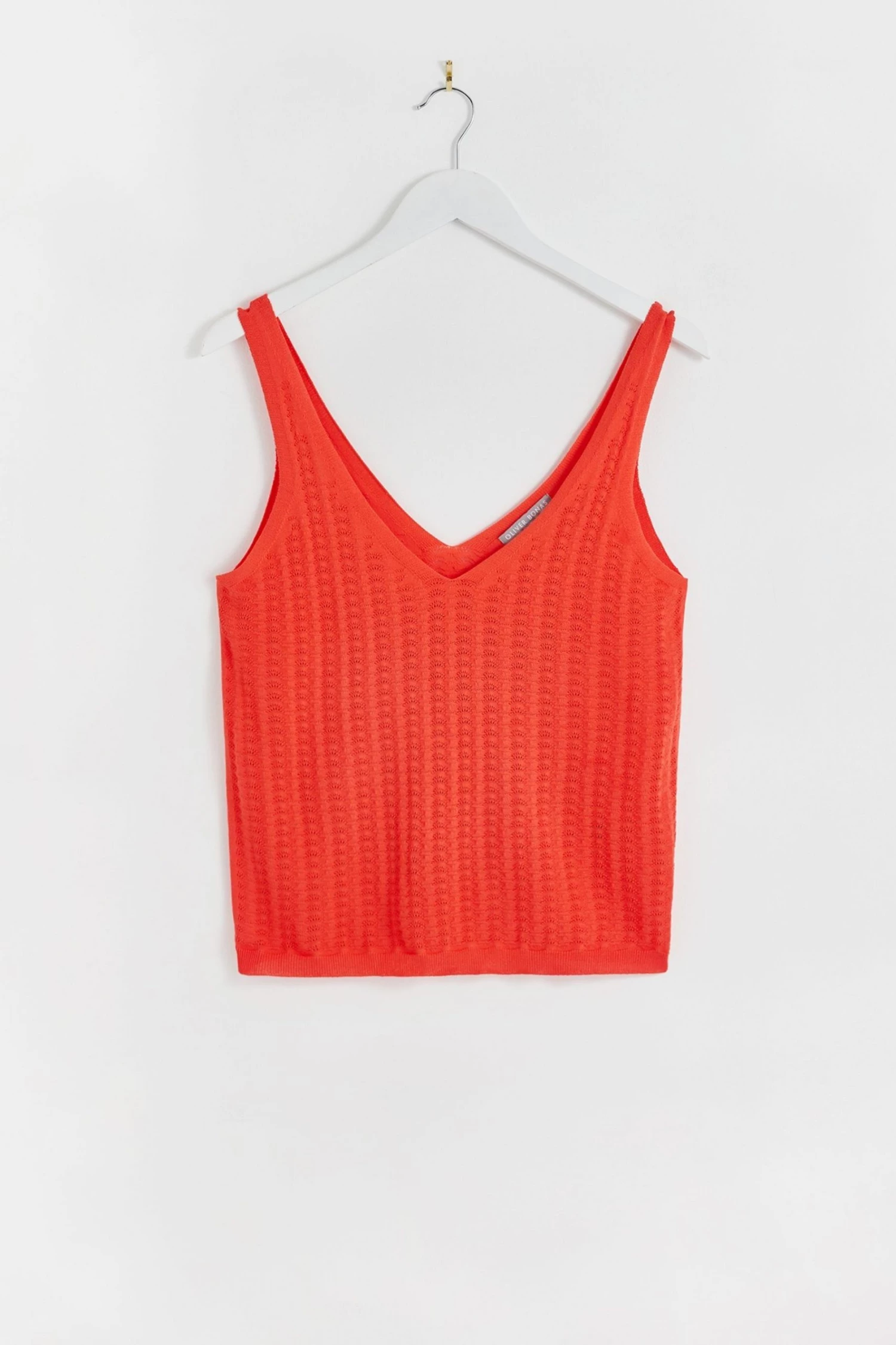 Another addition to your summer staple wardrobe, this knit tank top in a coral colour is ideal for brightening up your fits. This pointelle top has a V-neckline which is mirrored at the back and is complete in a fitted silhouette.