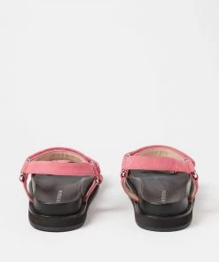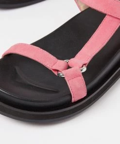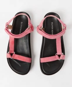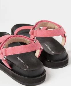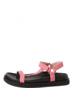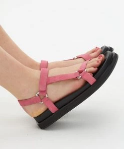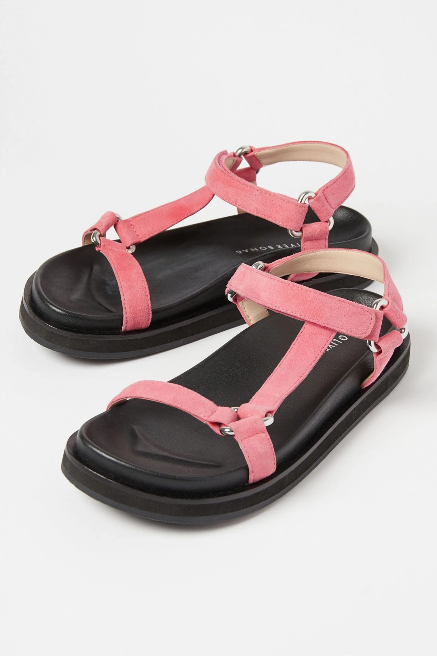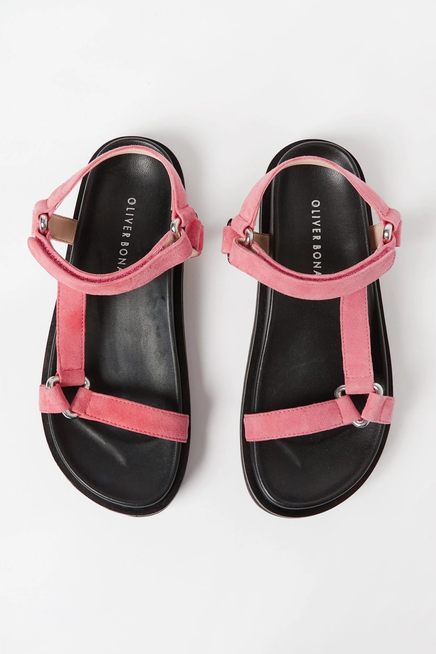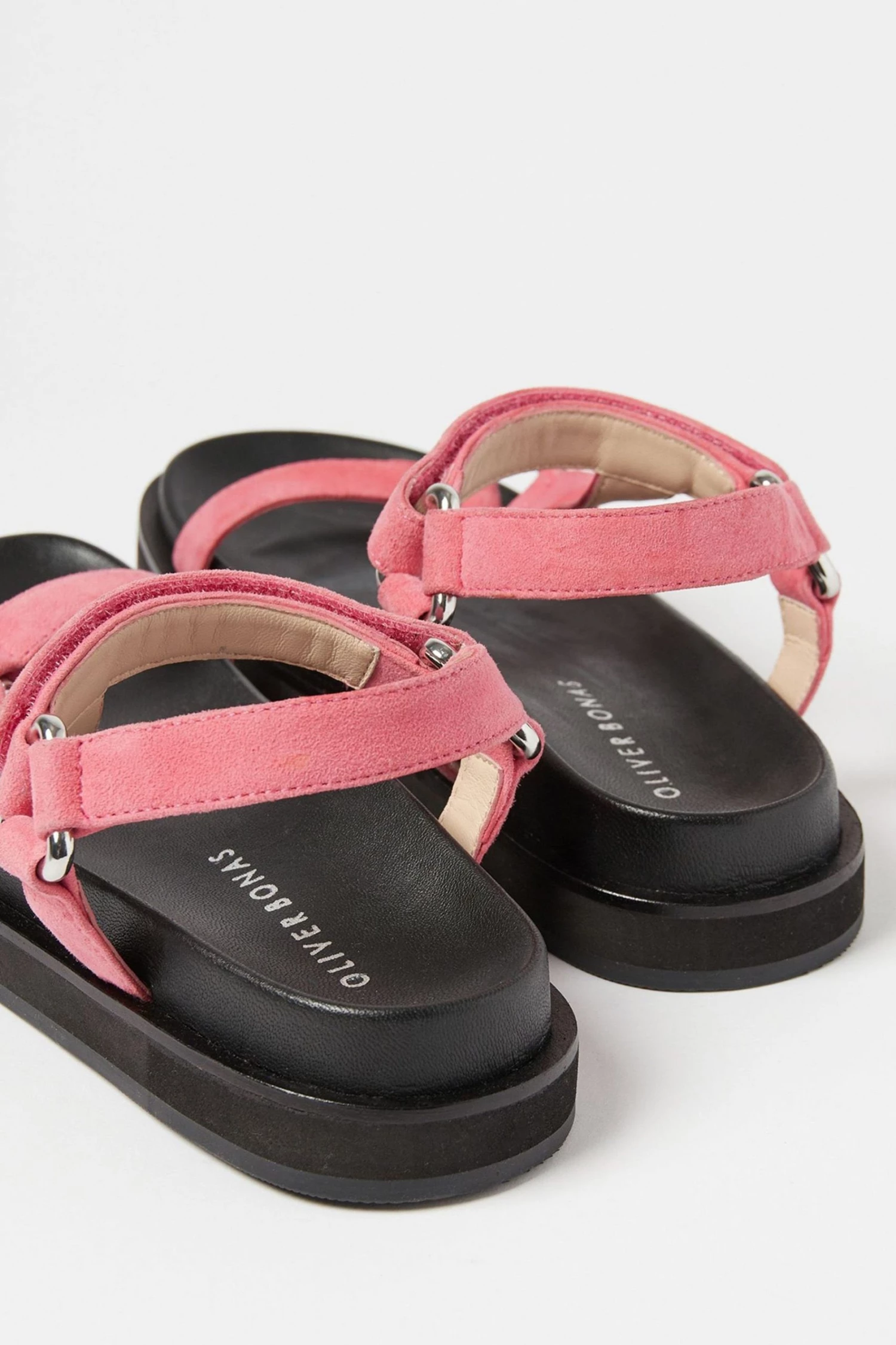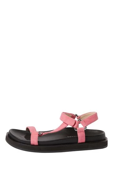 In a soft pink suede, these strappy sandals feature a raised leather footbed in a flatform style. Silver toned triangle shaped metalware accents these sandals with a sporty velcro strap sitting around the ankle.
