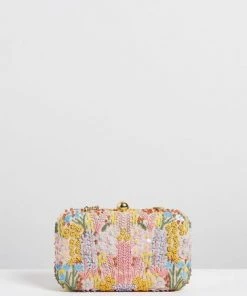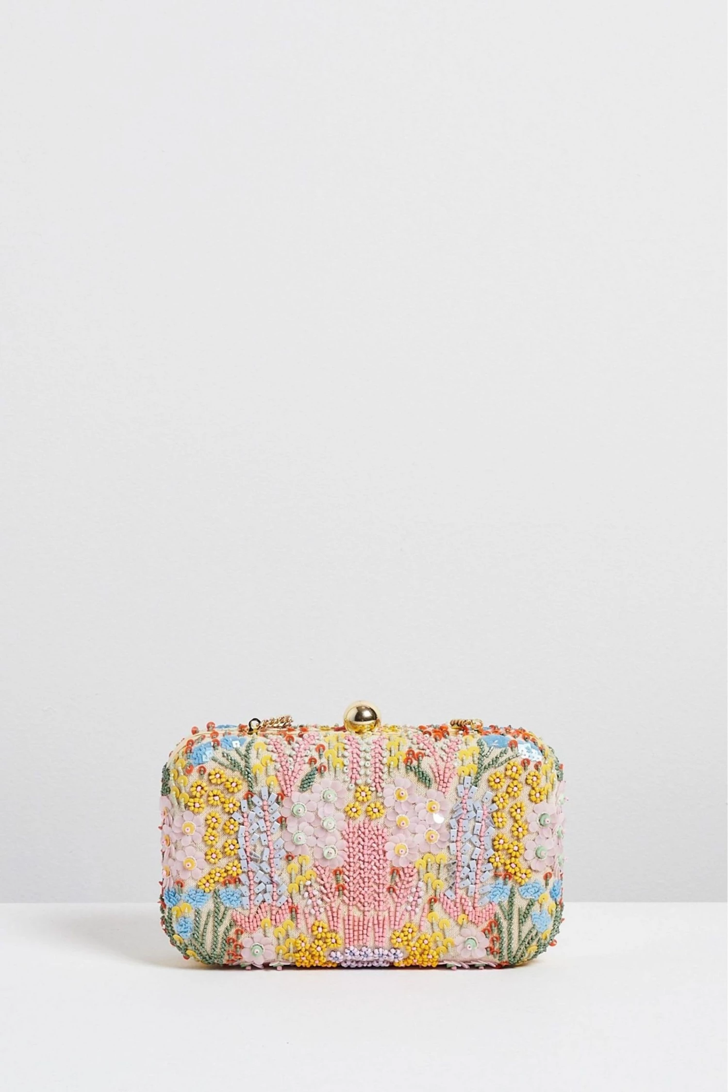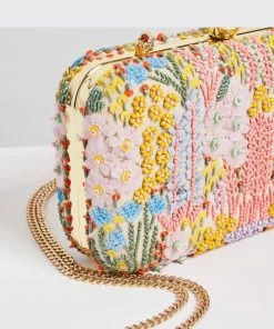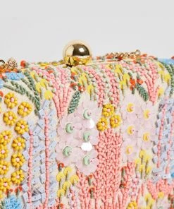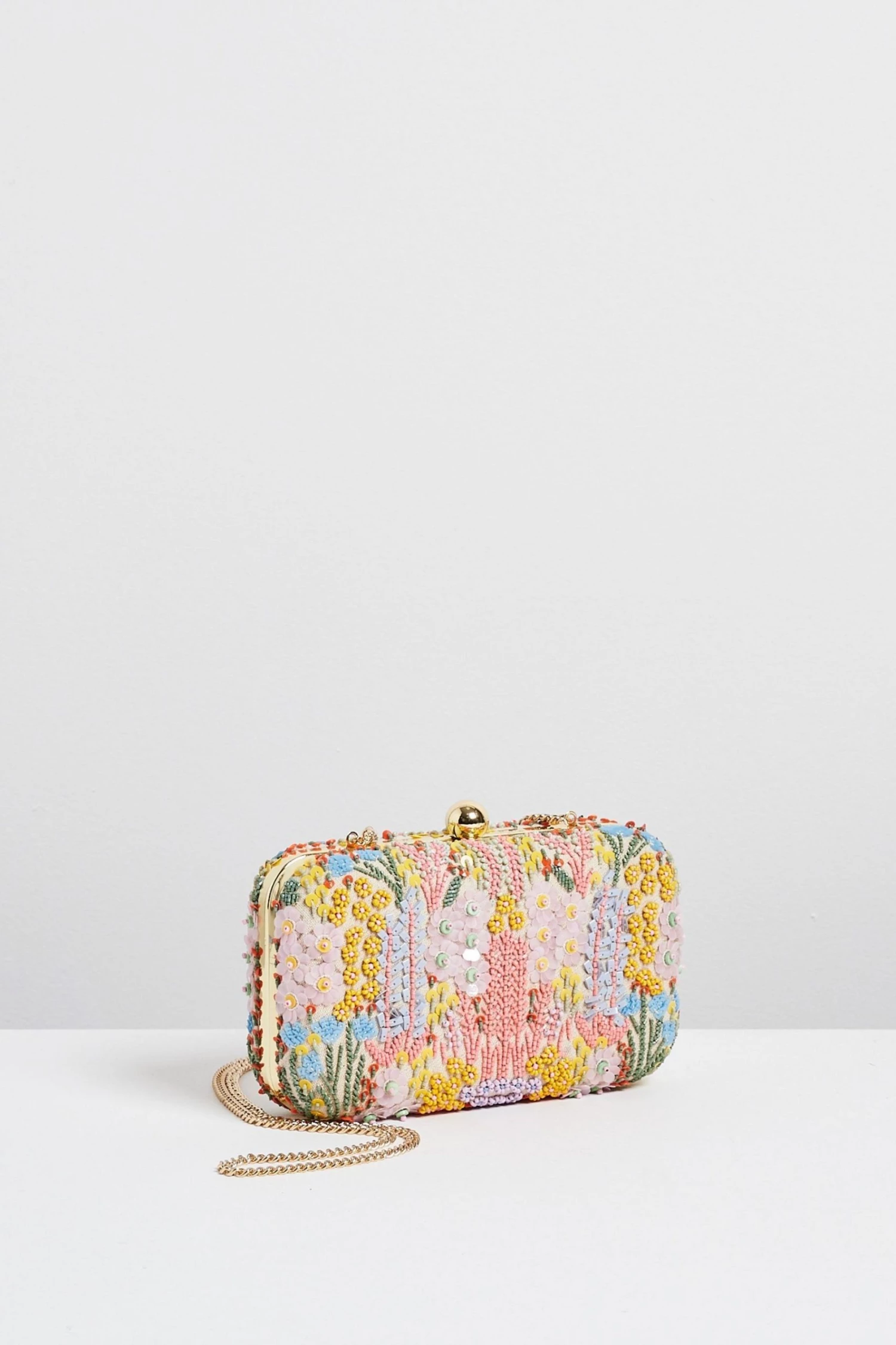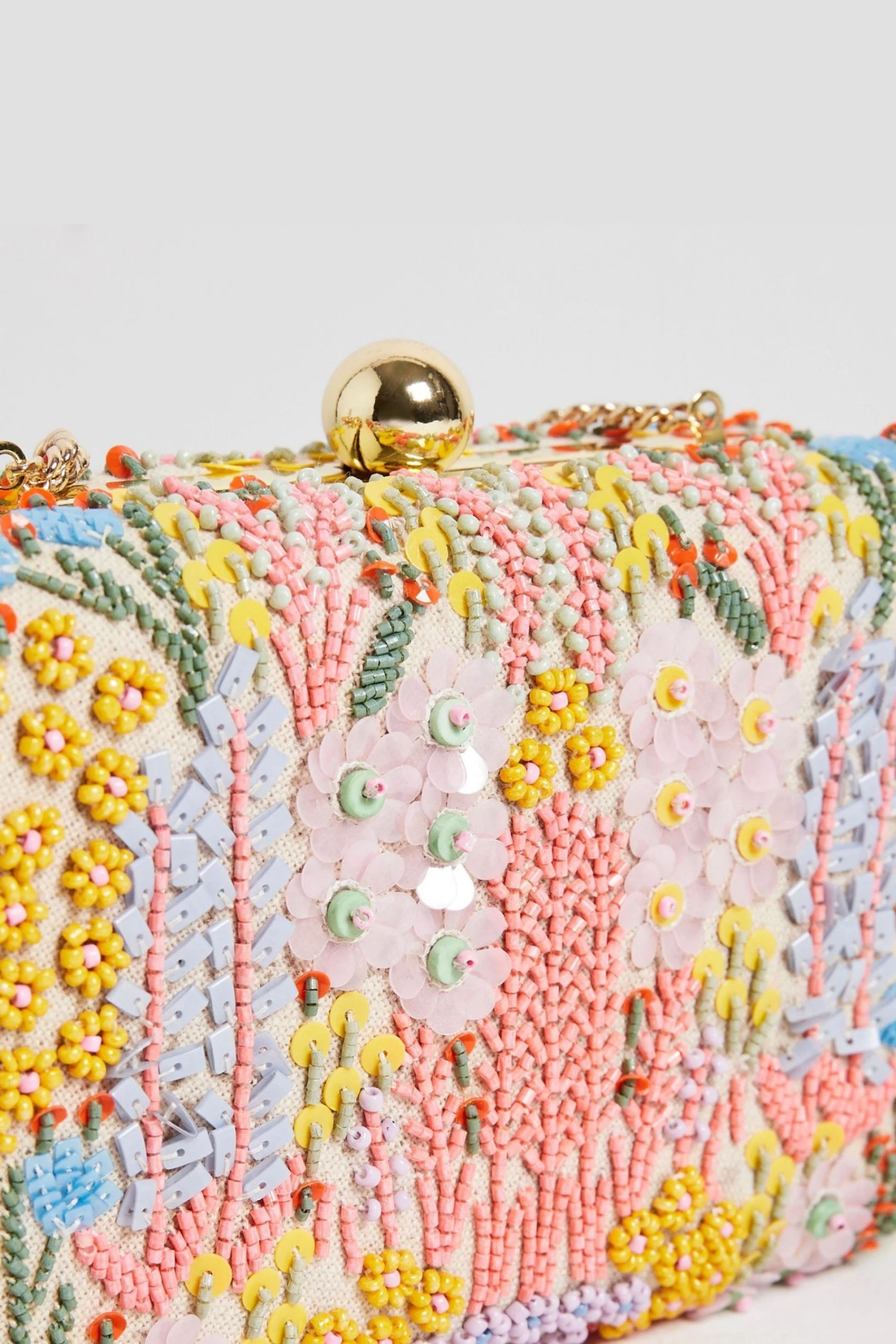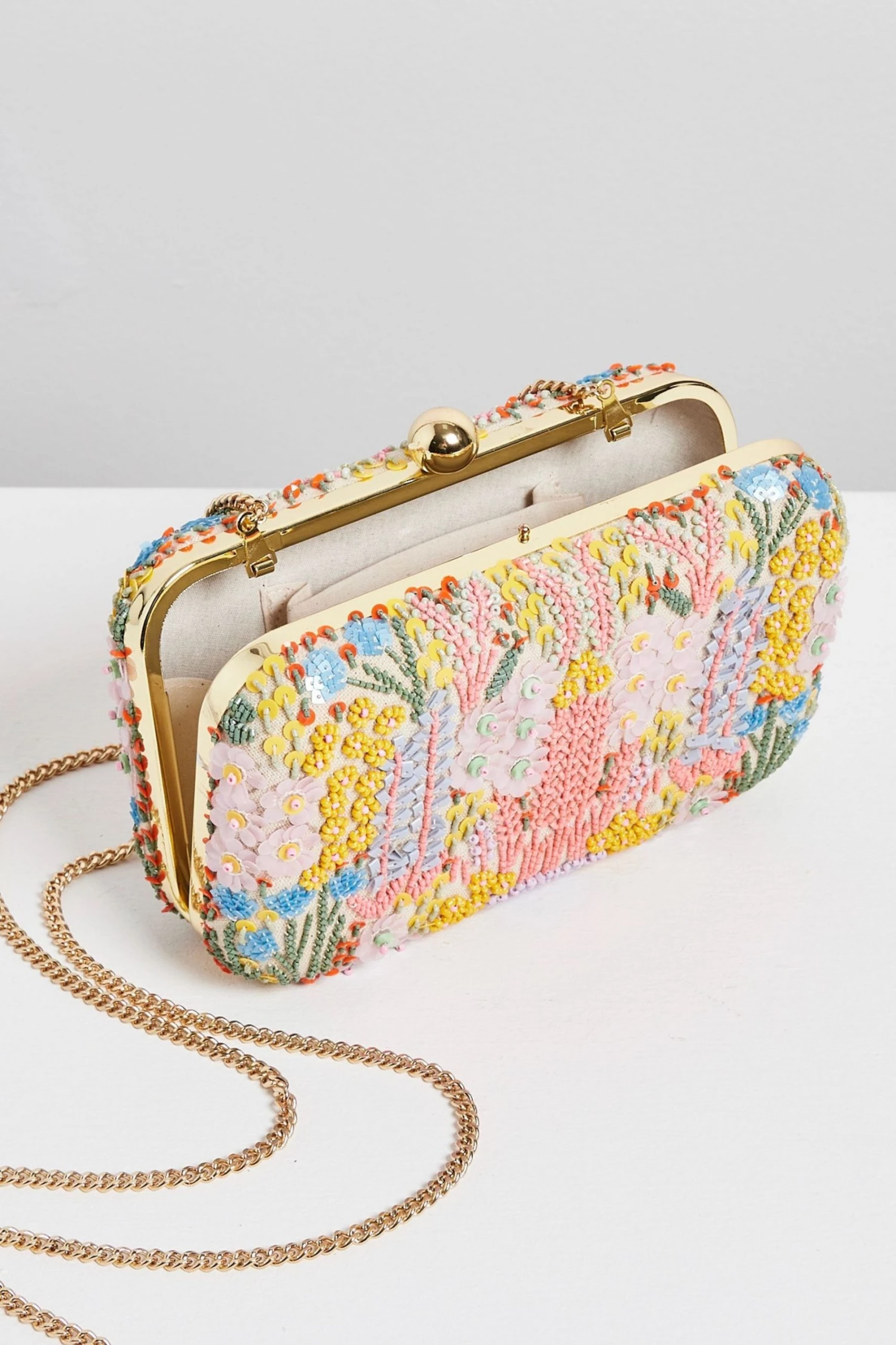 Add a bright accessory to your collection with this floral beaded clutch bag. In a mix of yellow, pink and green tones, this bag has a gold toned chain strap with a classic clutch bag closure. A side pocket sits inside the cream lined bag for your essential cards and is complete with gold toned metalware throughout.