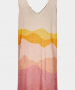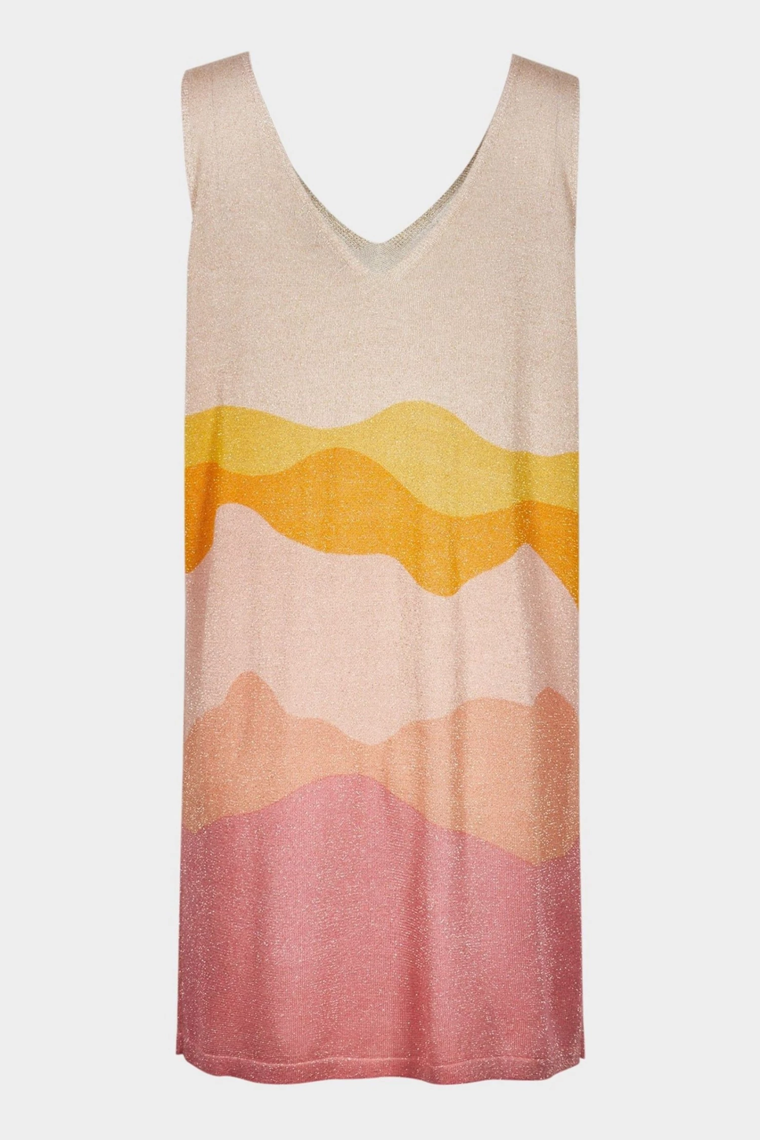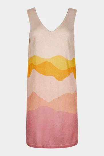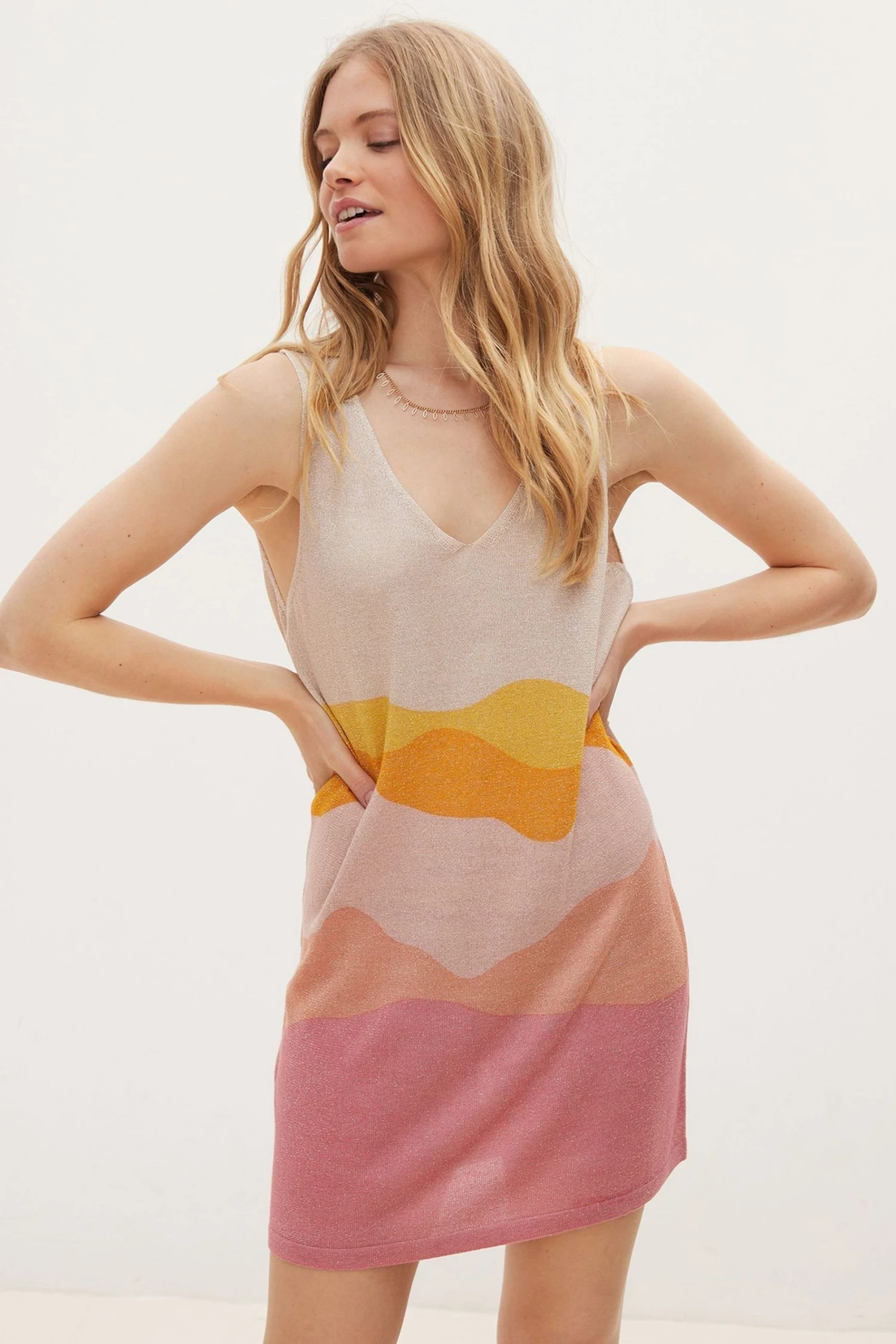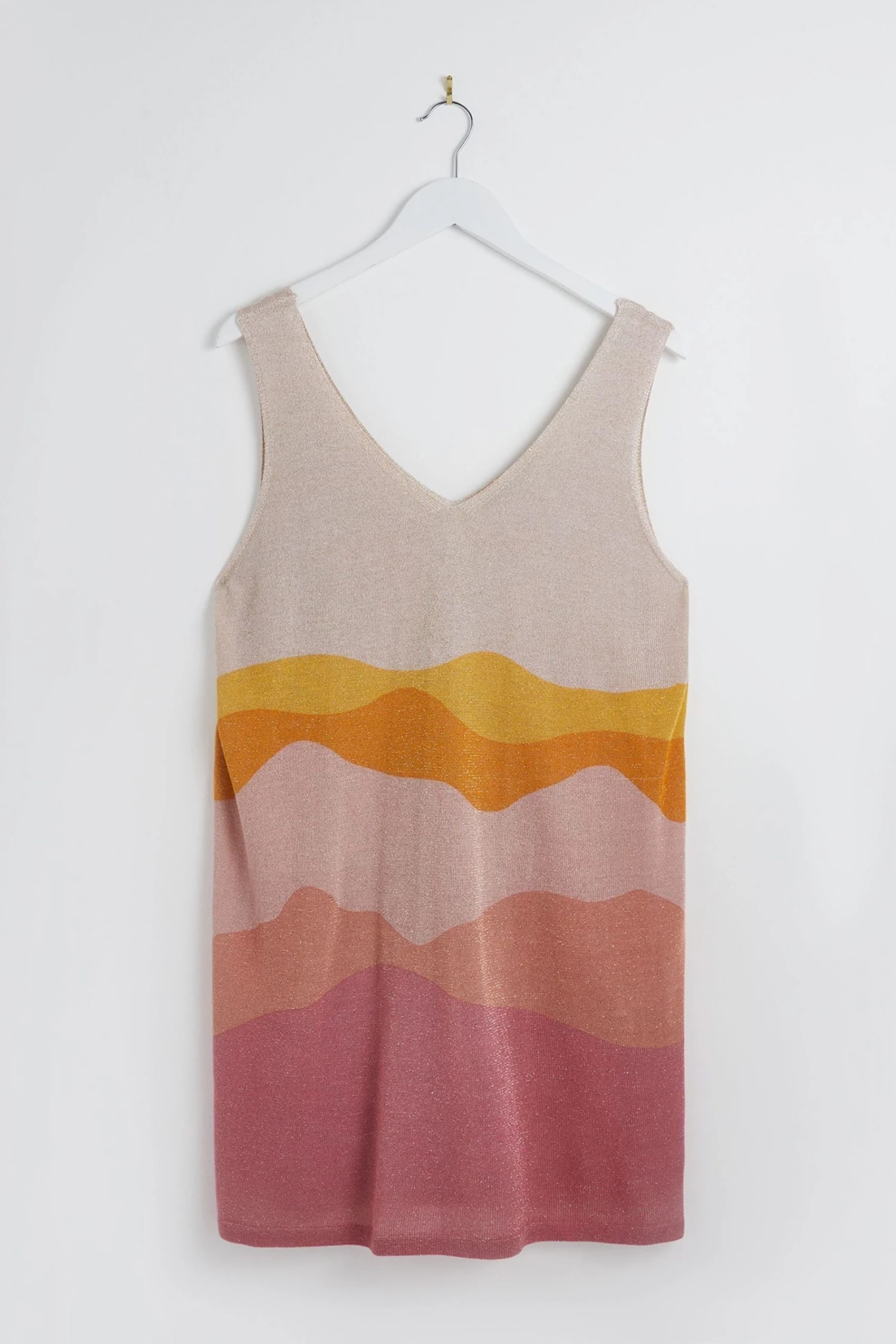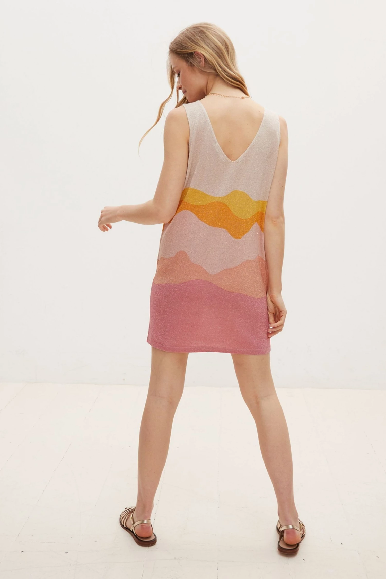 Dreaming of sunset views and warm summer evenings? Look no further with their Sunset Sparkle Knit Dress. In soft pink and orange hues, this knitted dress has a sunset design and is completed with a V-neckline and a straight silhouette. Throw over a bikini on your way to the beach or pop on a straw hat and head out on your next day trip.