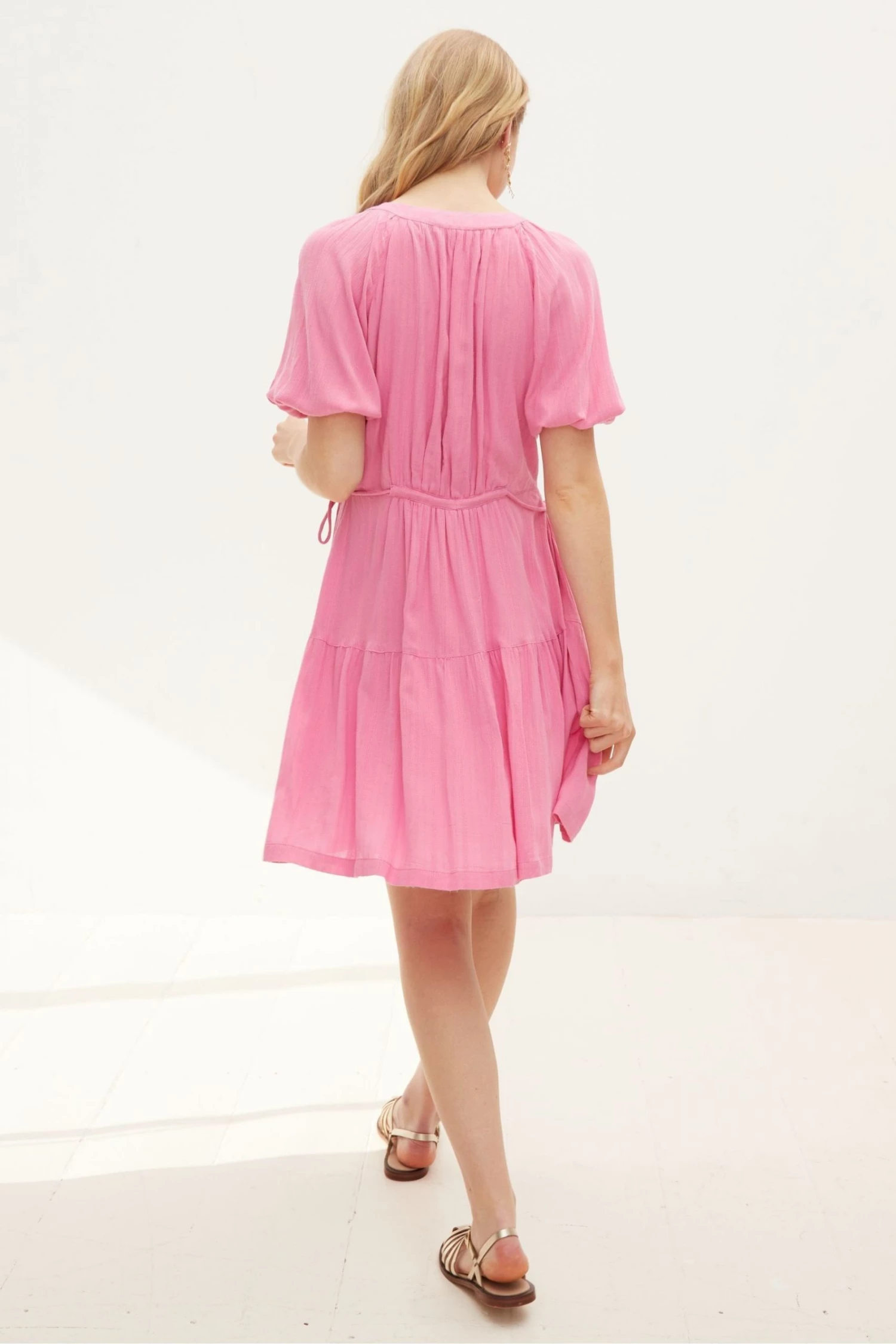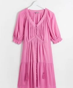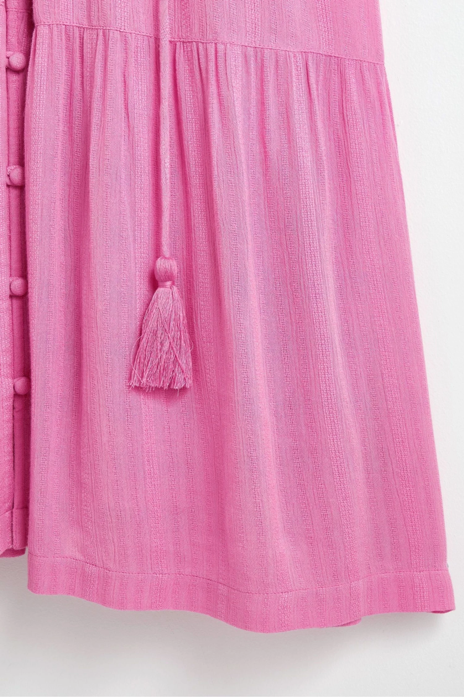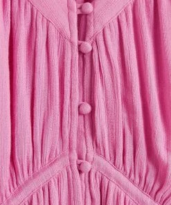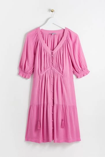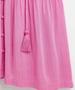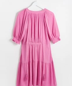 In a button up style, this A-line pink mini dress features tassel ties at the bodice for unique and adjustable fit. Shirred cuff sleeves and pleated accents are added to the design alongside a V-shaped neckline.