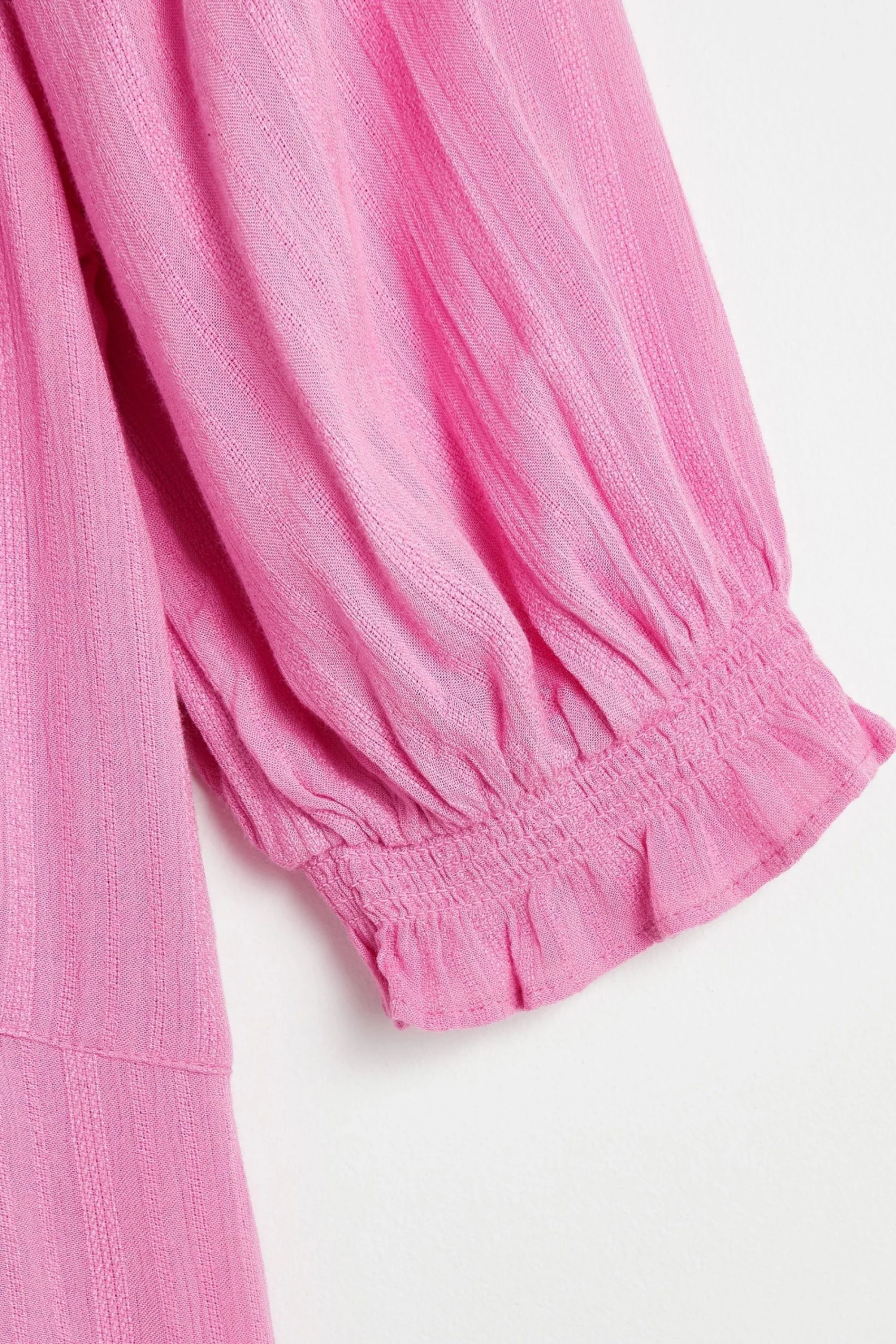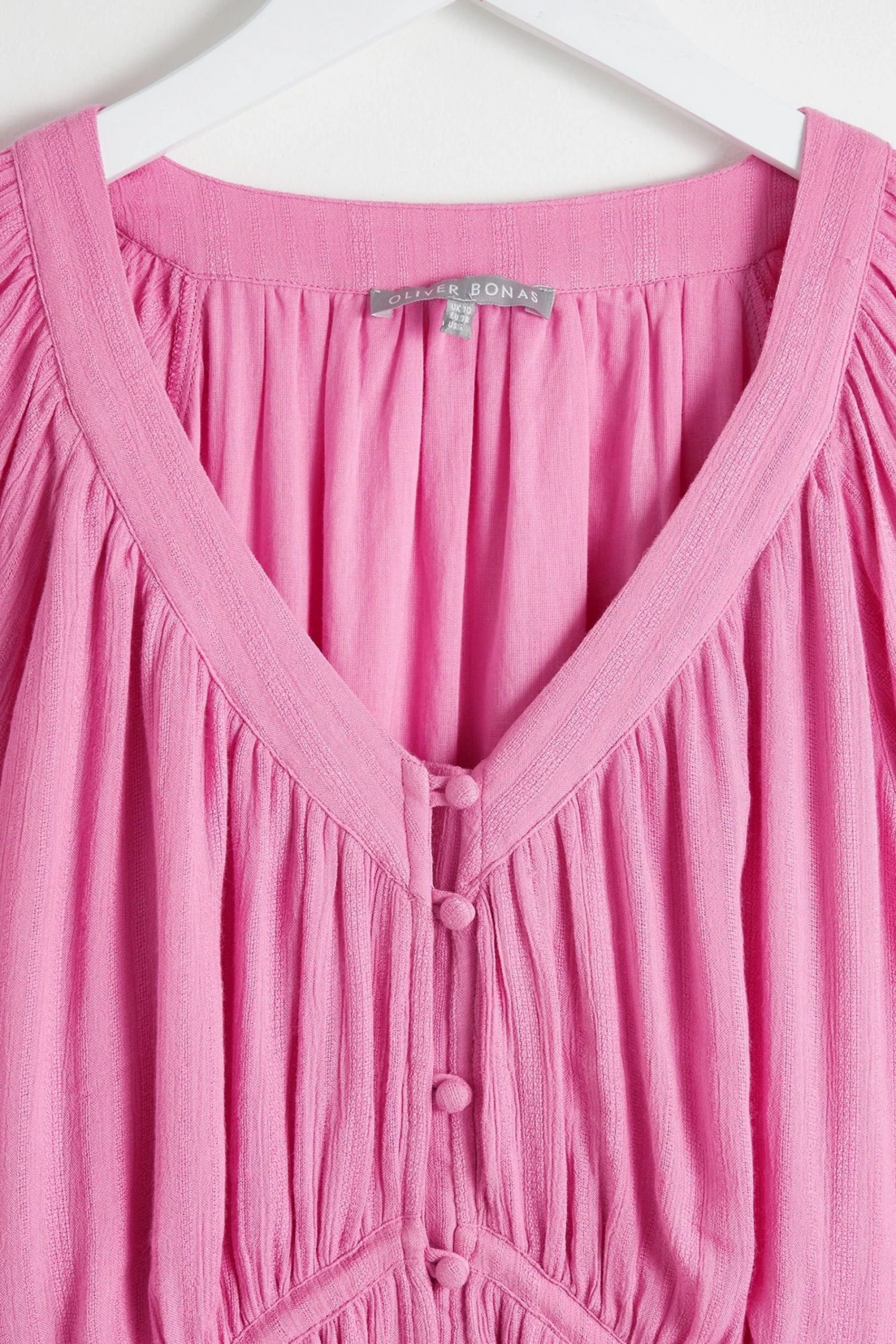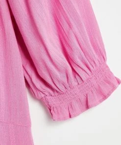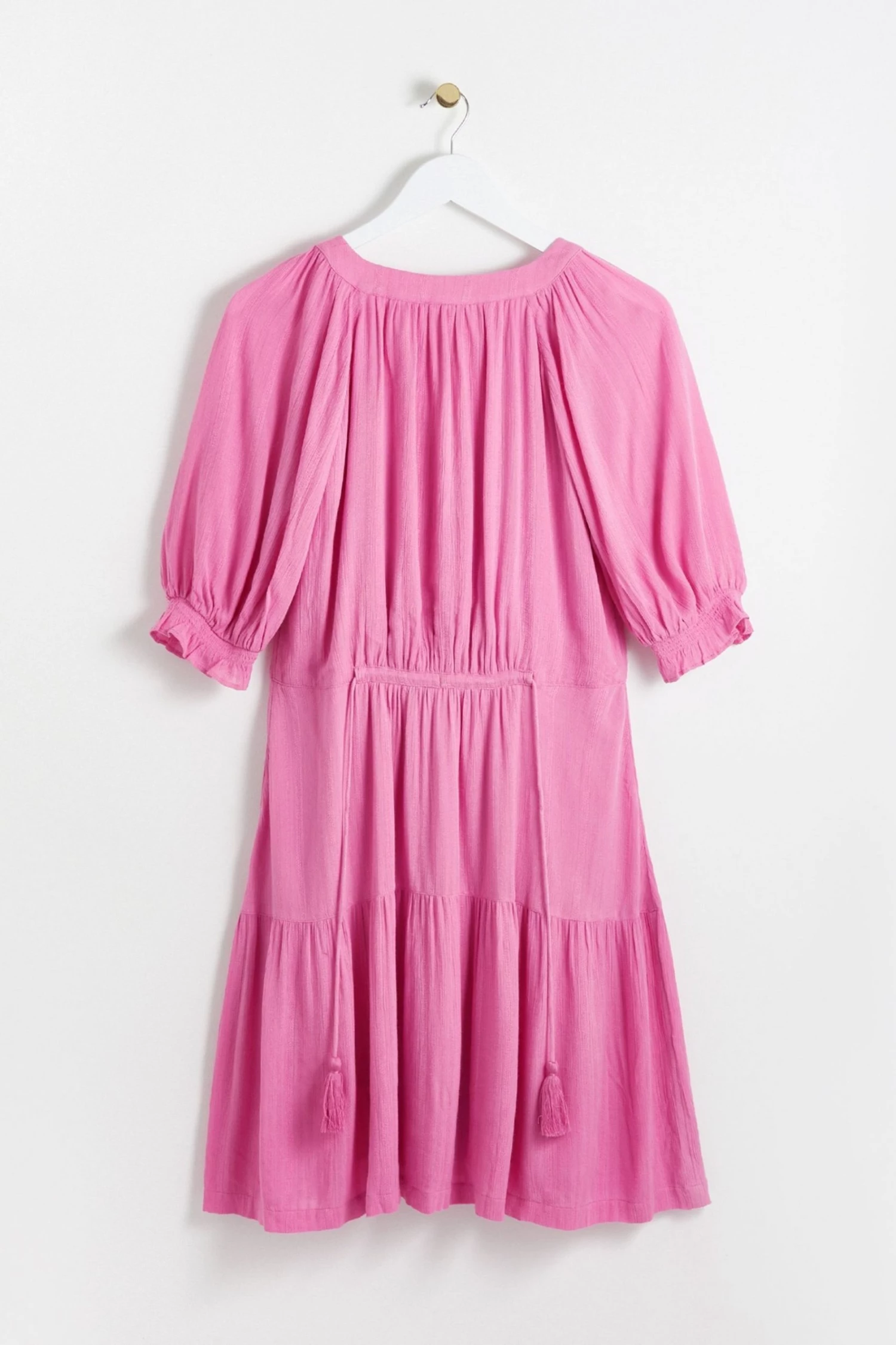In a button up style, this A-line pink mini dress features tassel ties at the bodice for unique and adjustable fit. Shirred cuff sleeves and pleated accents are added to the design alongside a V-shaped neckline.