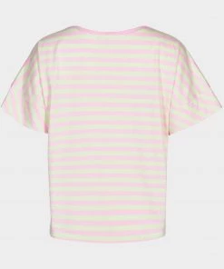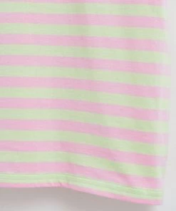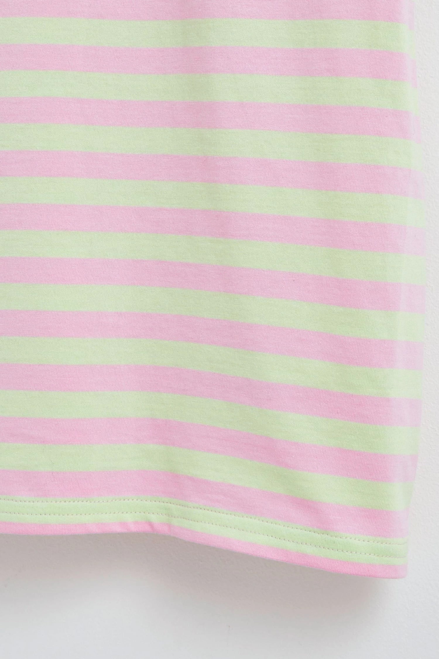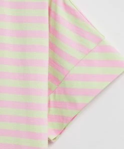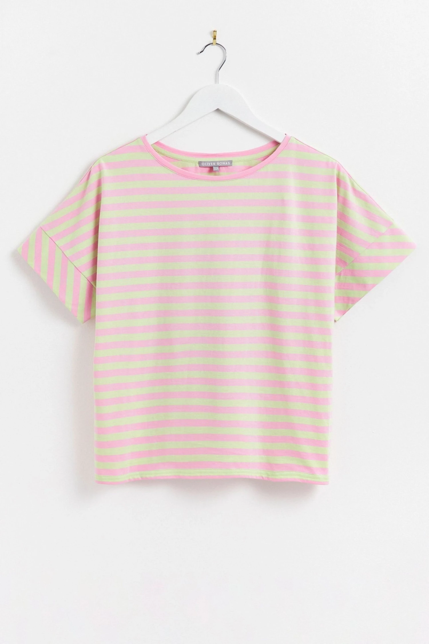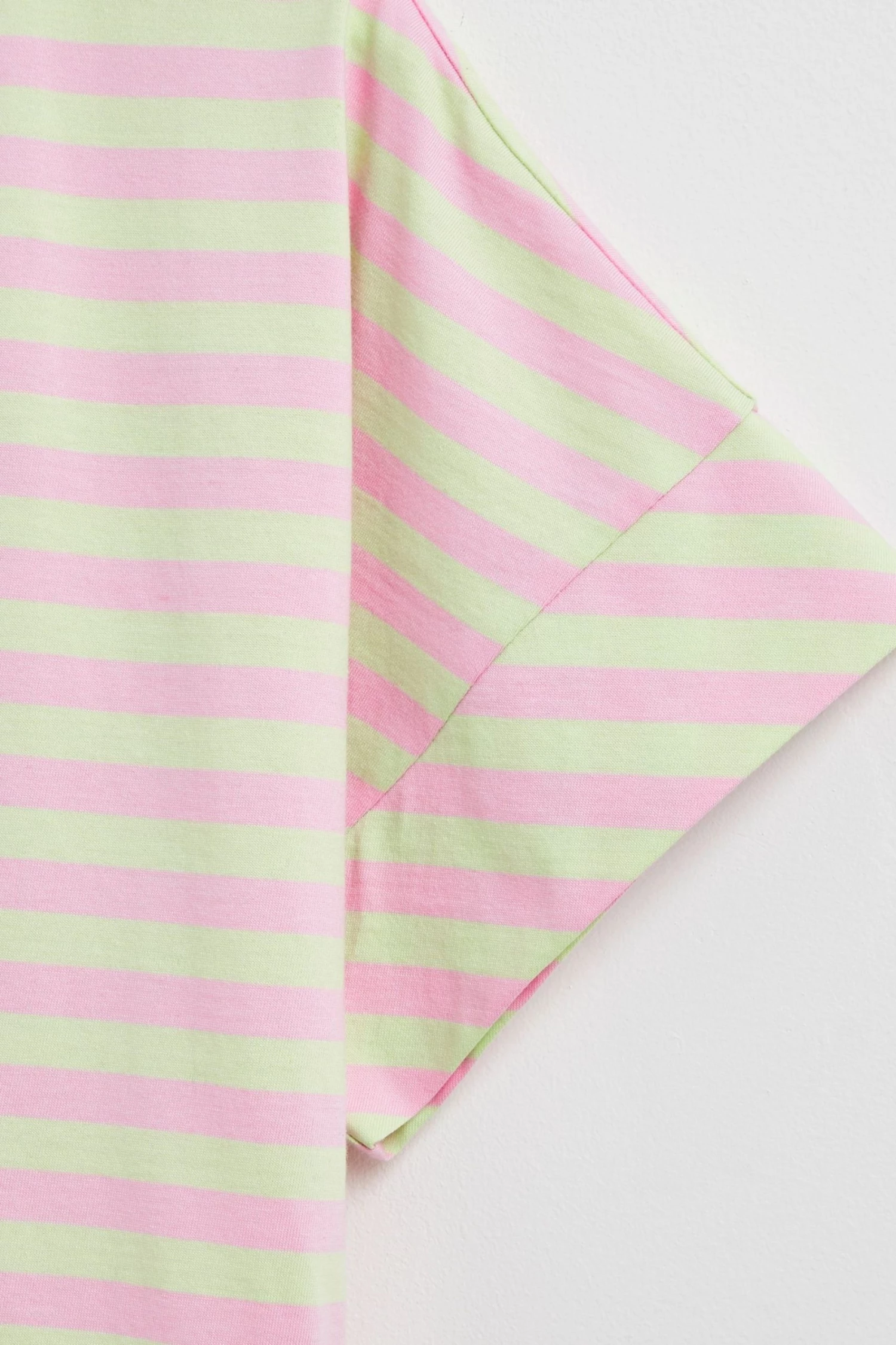 In a candy stripe pattern in pink and lime green hues, this boxy silhouette T-shirt features a rounded neckline and short, oversized sleeves for a fun and functional addition to your summer wardrobe.