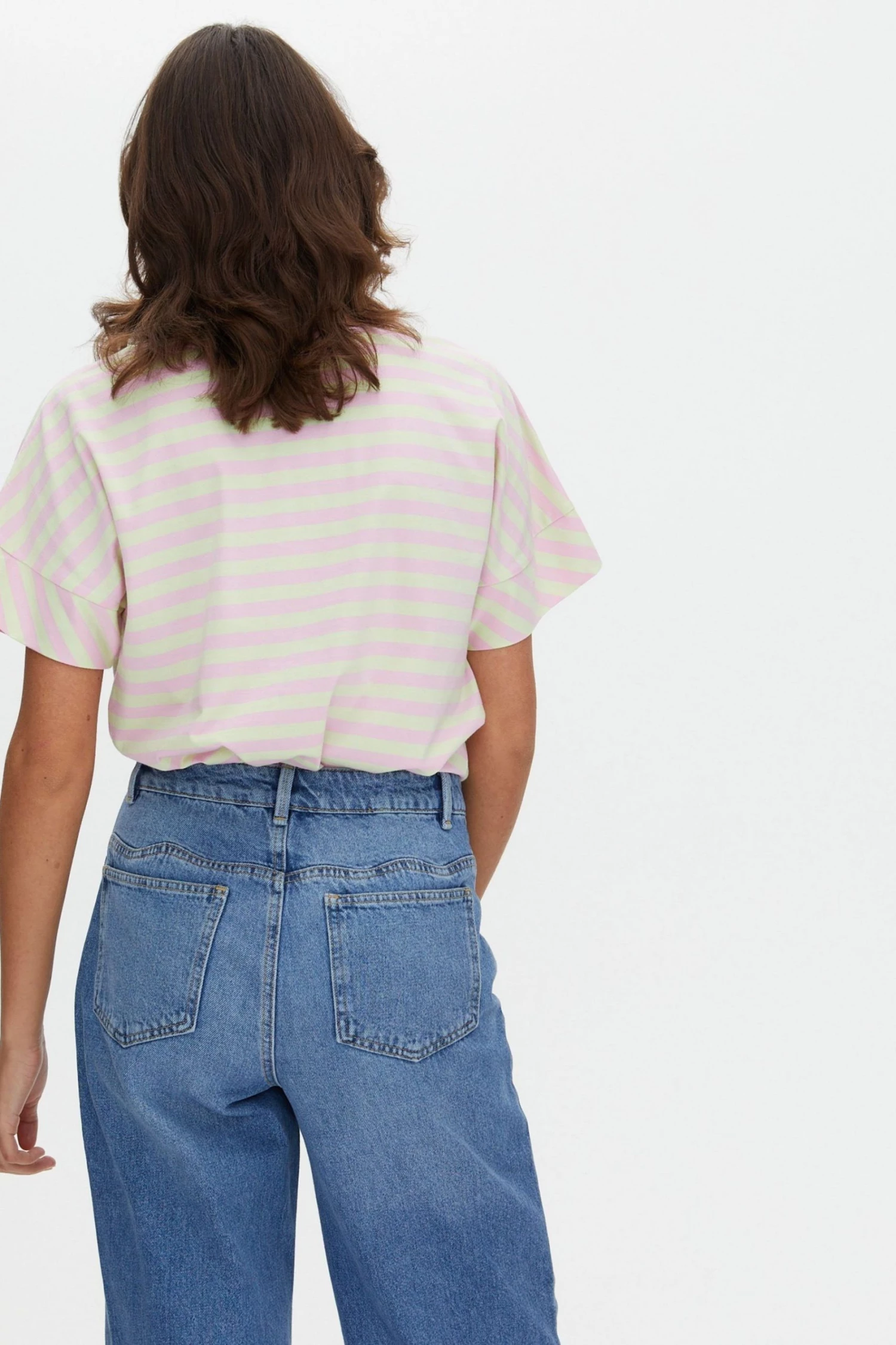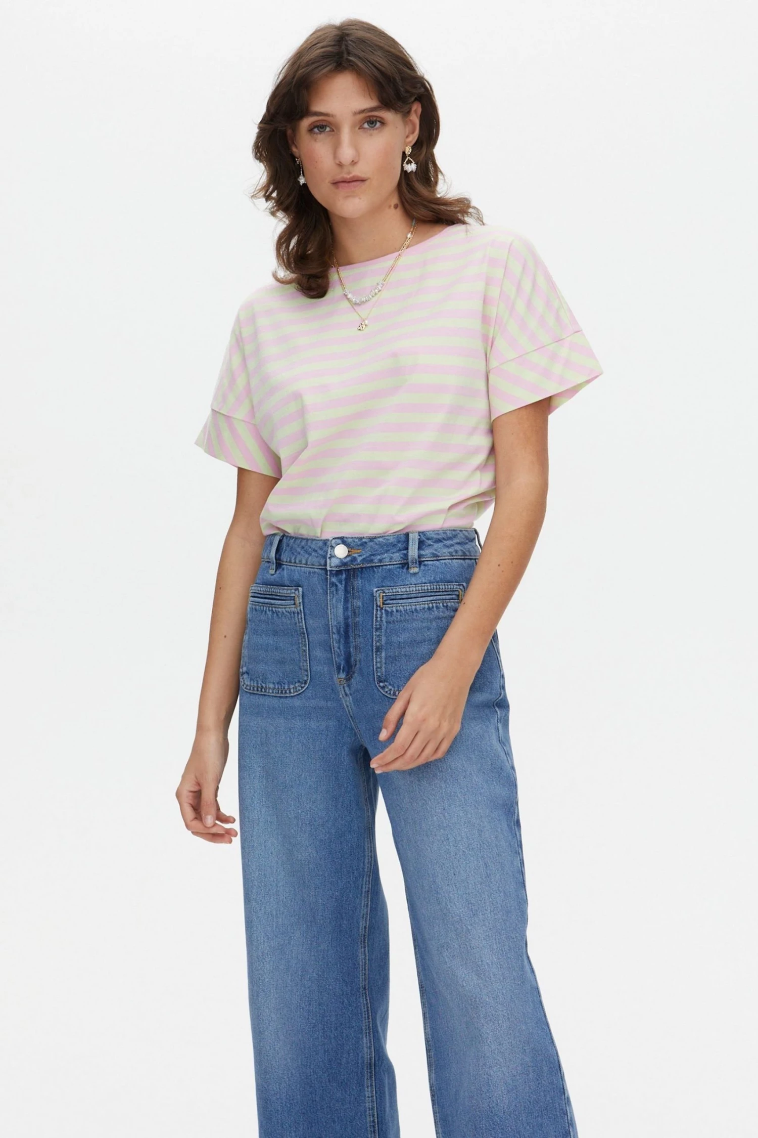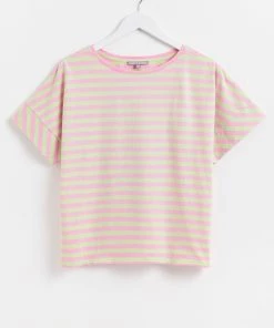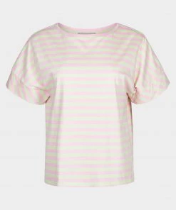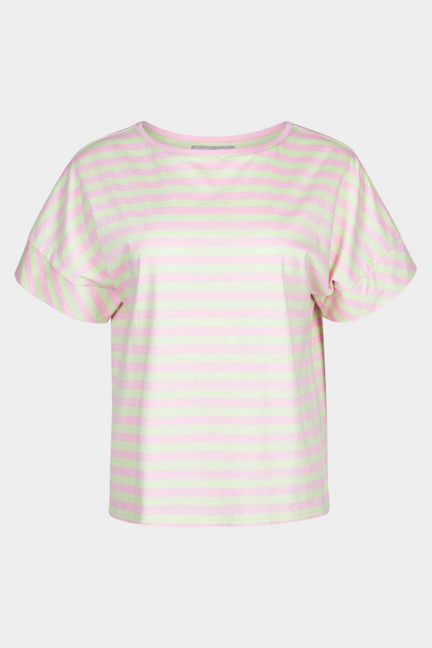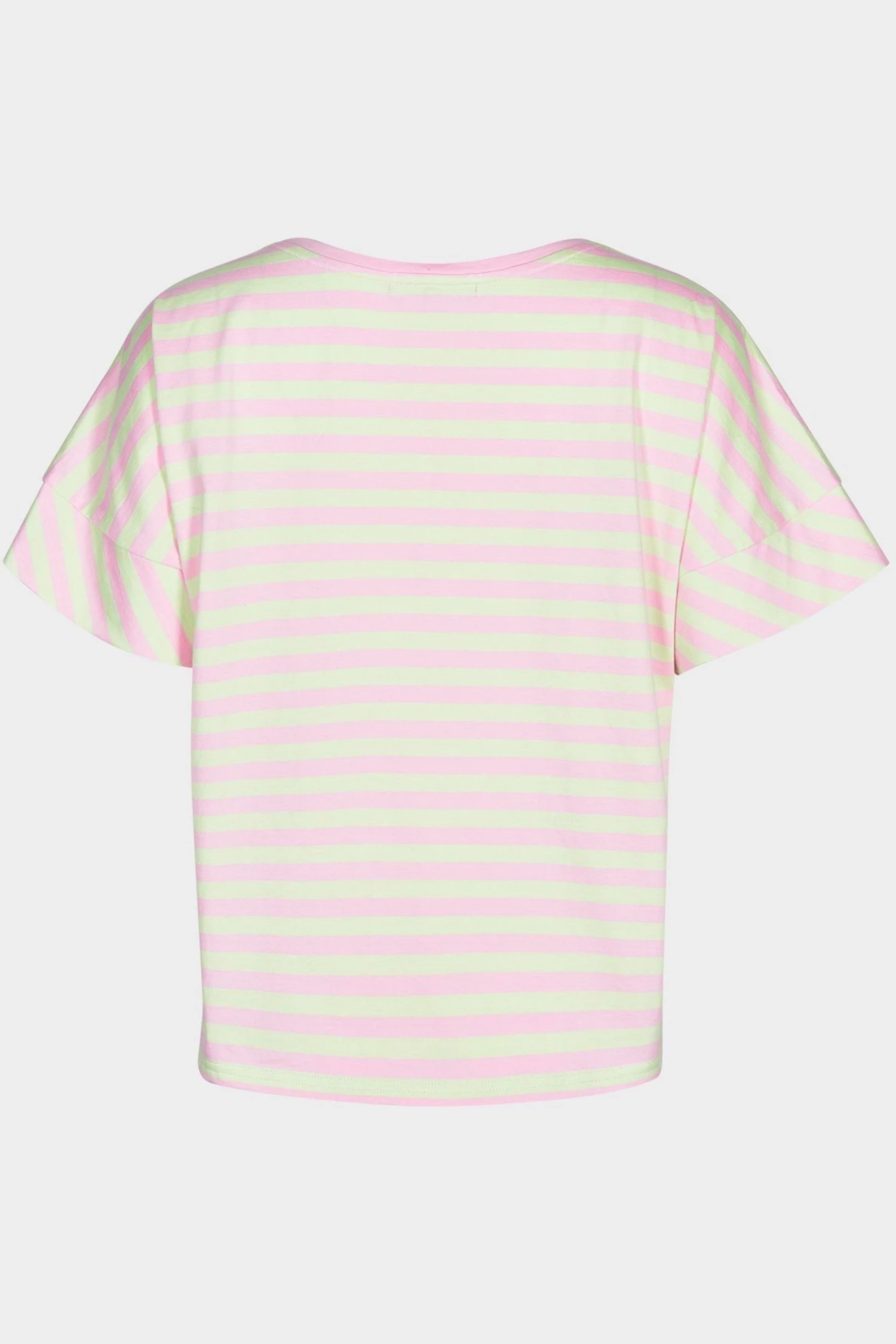 In a candy stripe pattern in pink and lime green hues, this boxy silhouette T-shirt features a rounded neckline and short, oversized sleeves for a fun and functional addition to your summer wardrobe.