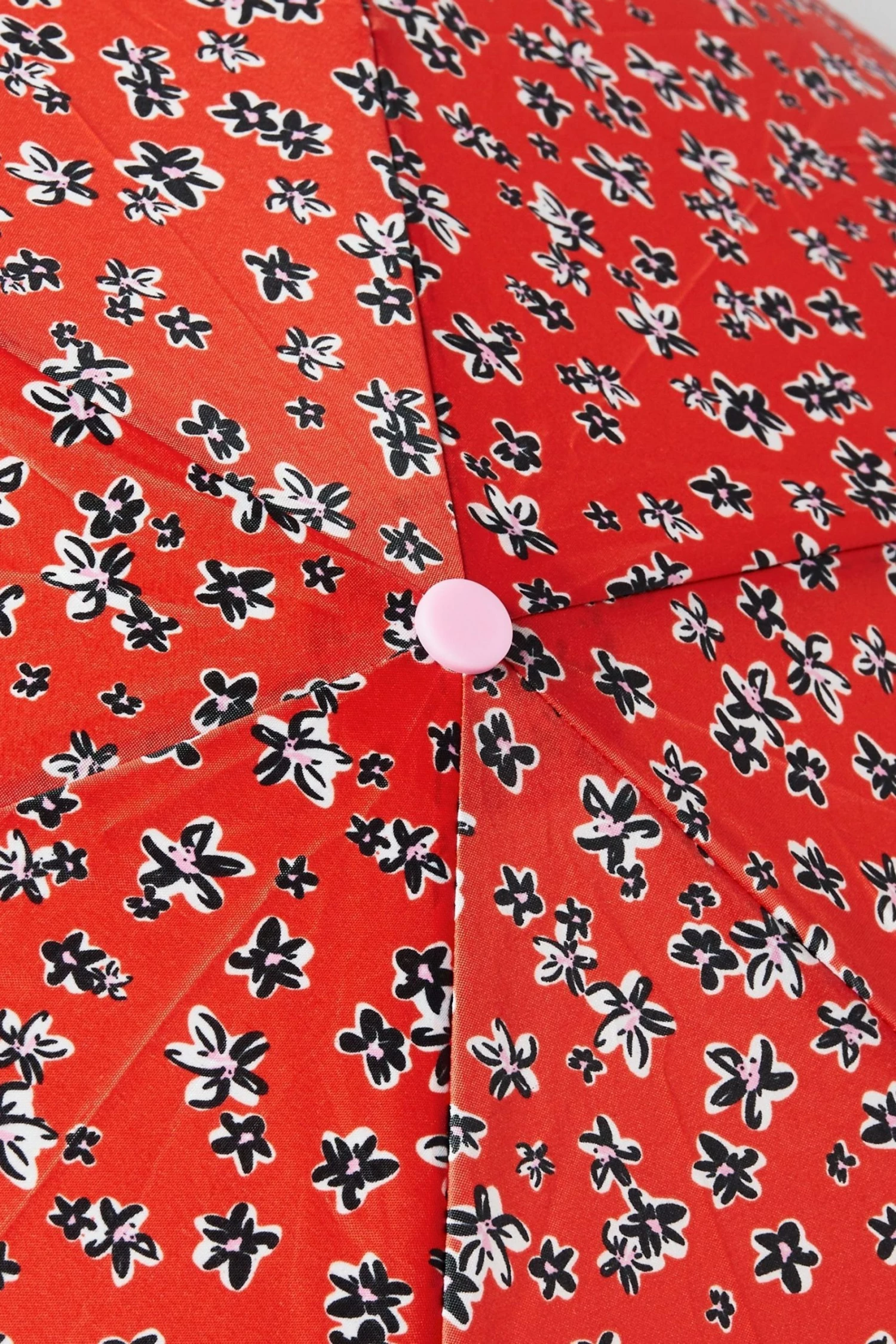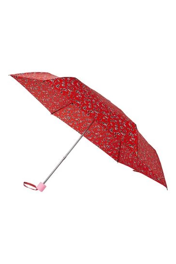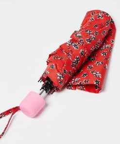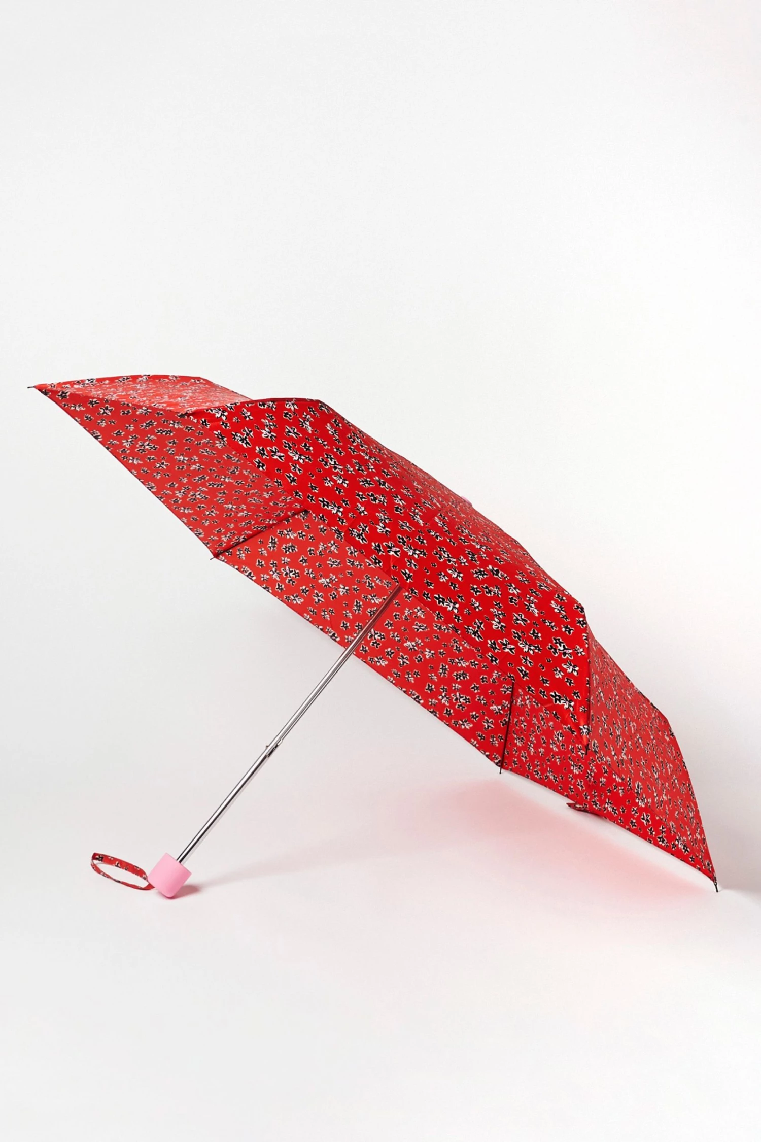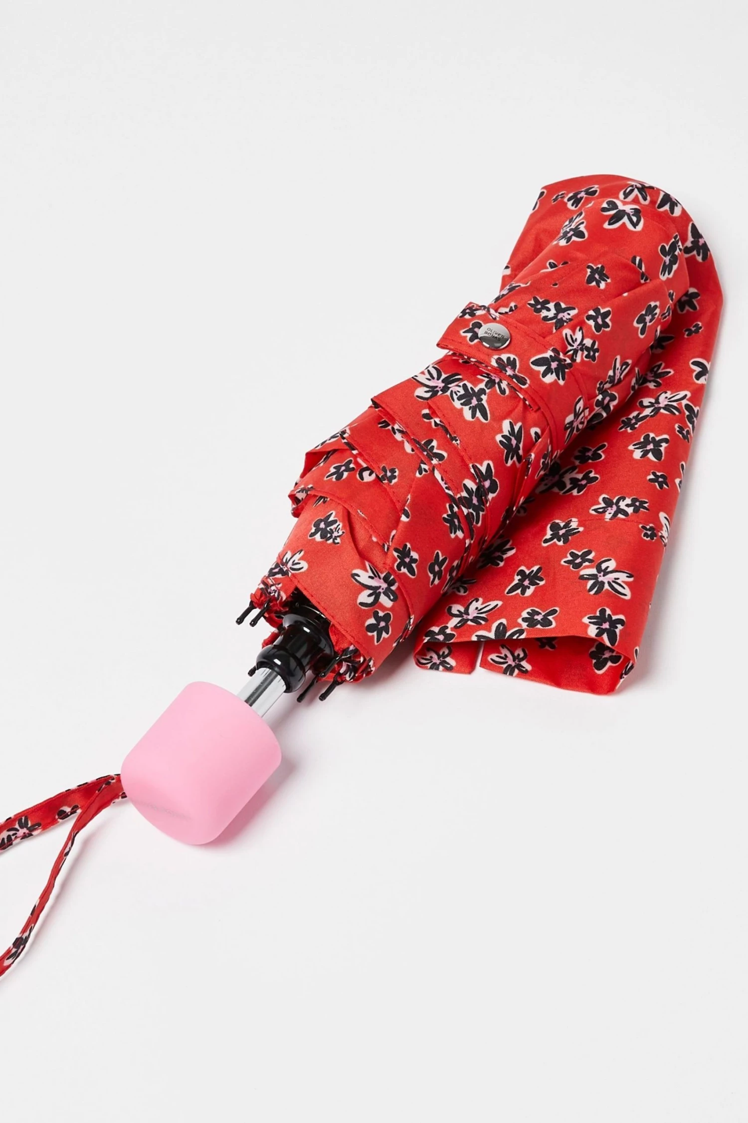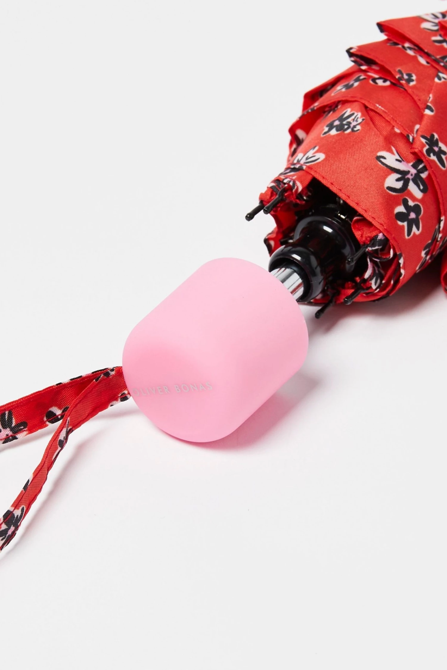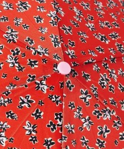 In a bright red, this umbrella is covered in an abstract black floral pattern and is complete with pink accents.