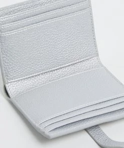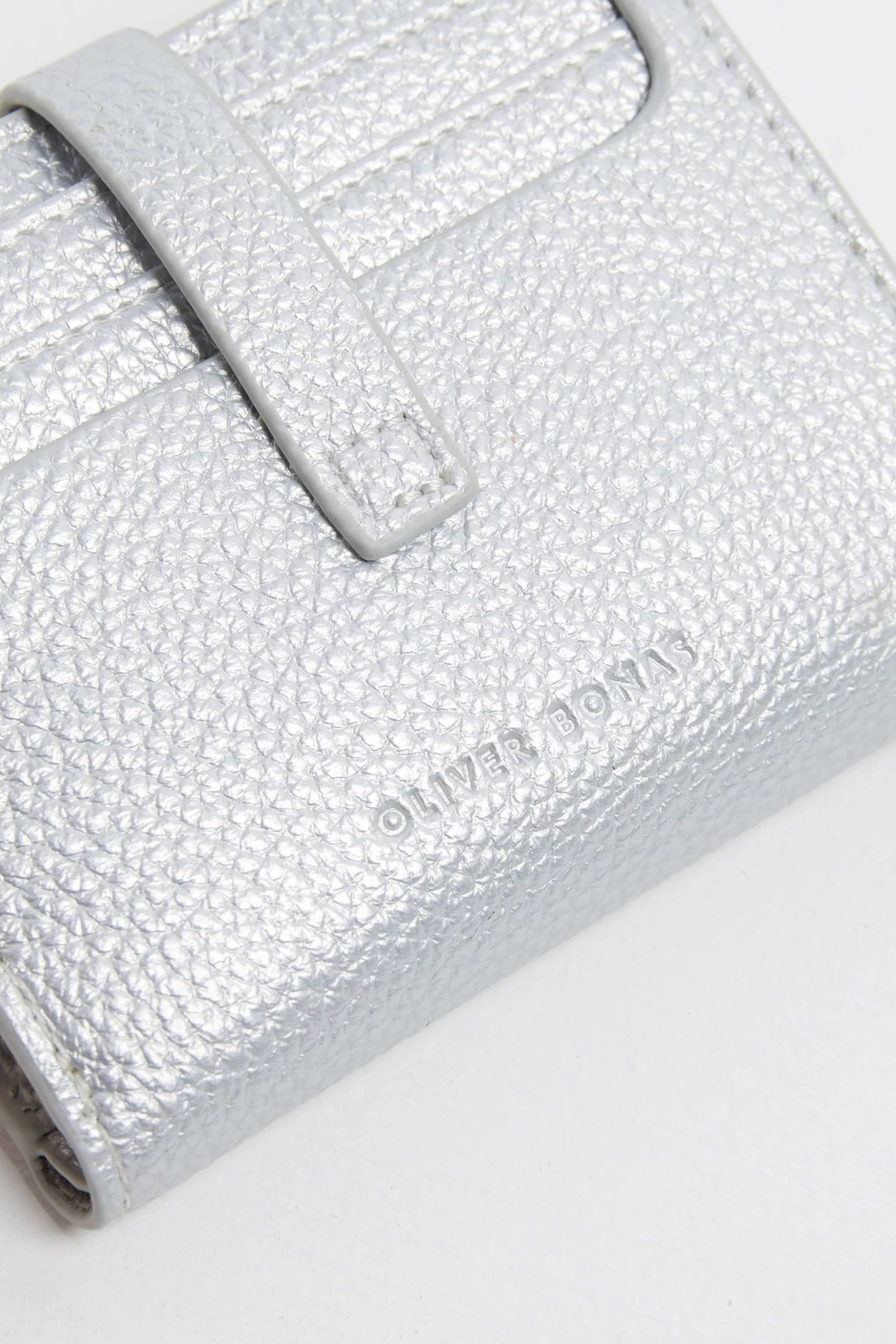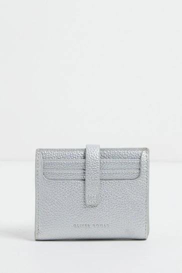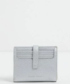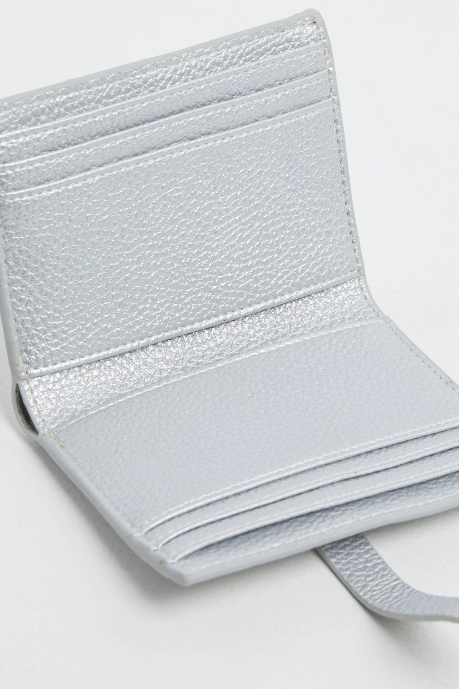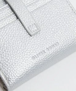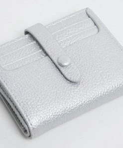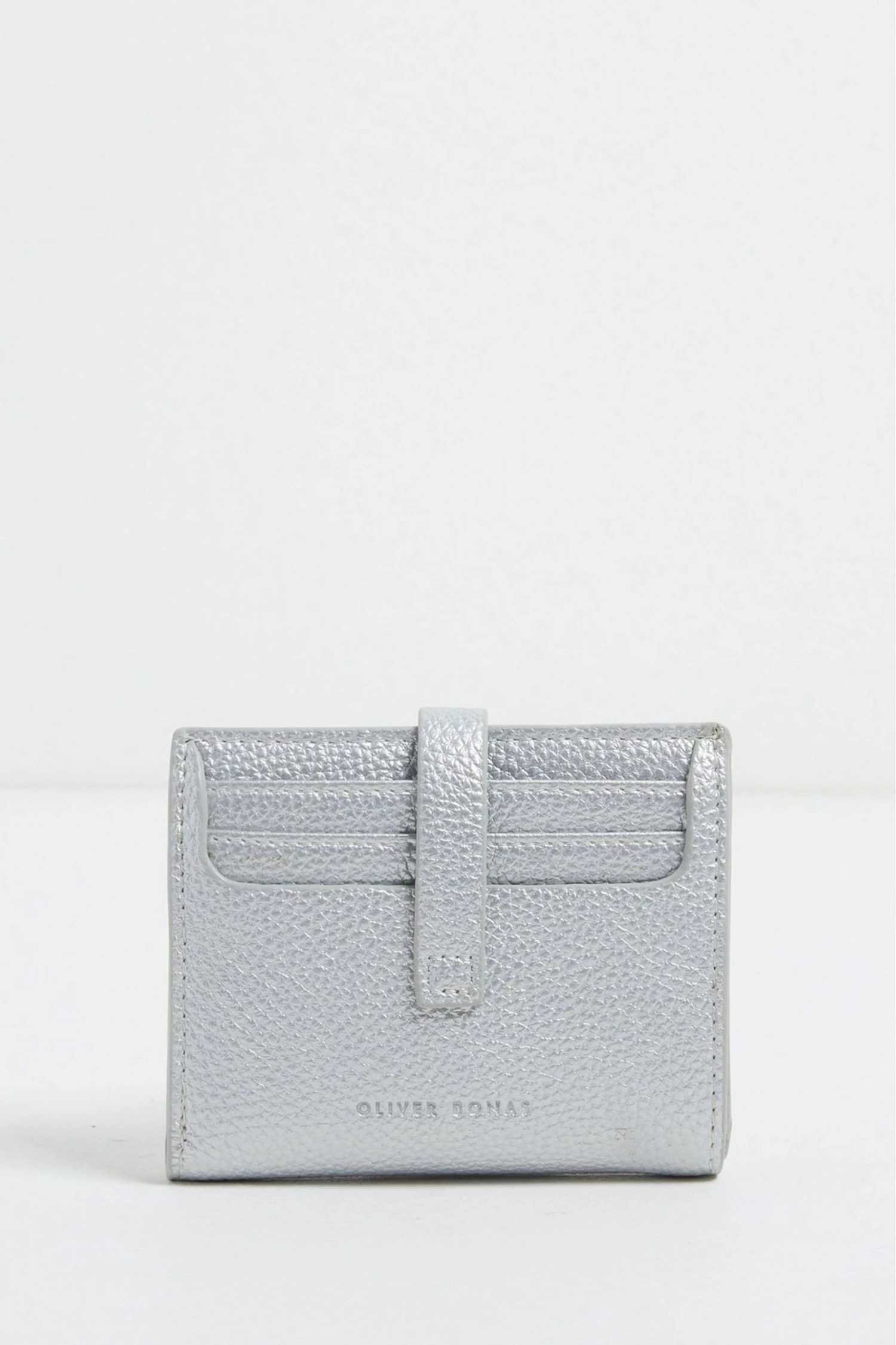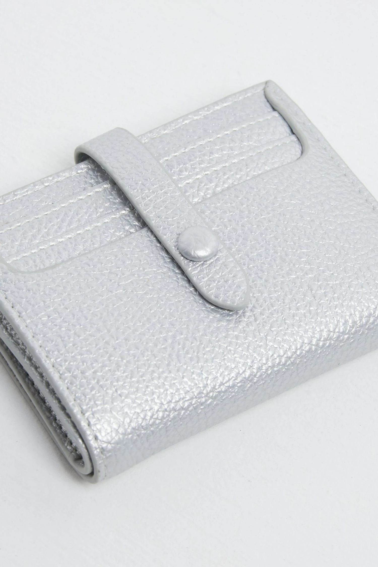 In a metallic silver hue, the Ettie card holder has a fold over style with button closure. Card slots line the outside and inside with a compartment at the back for your receipts.