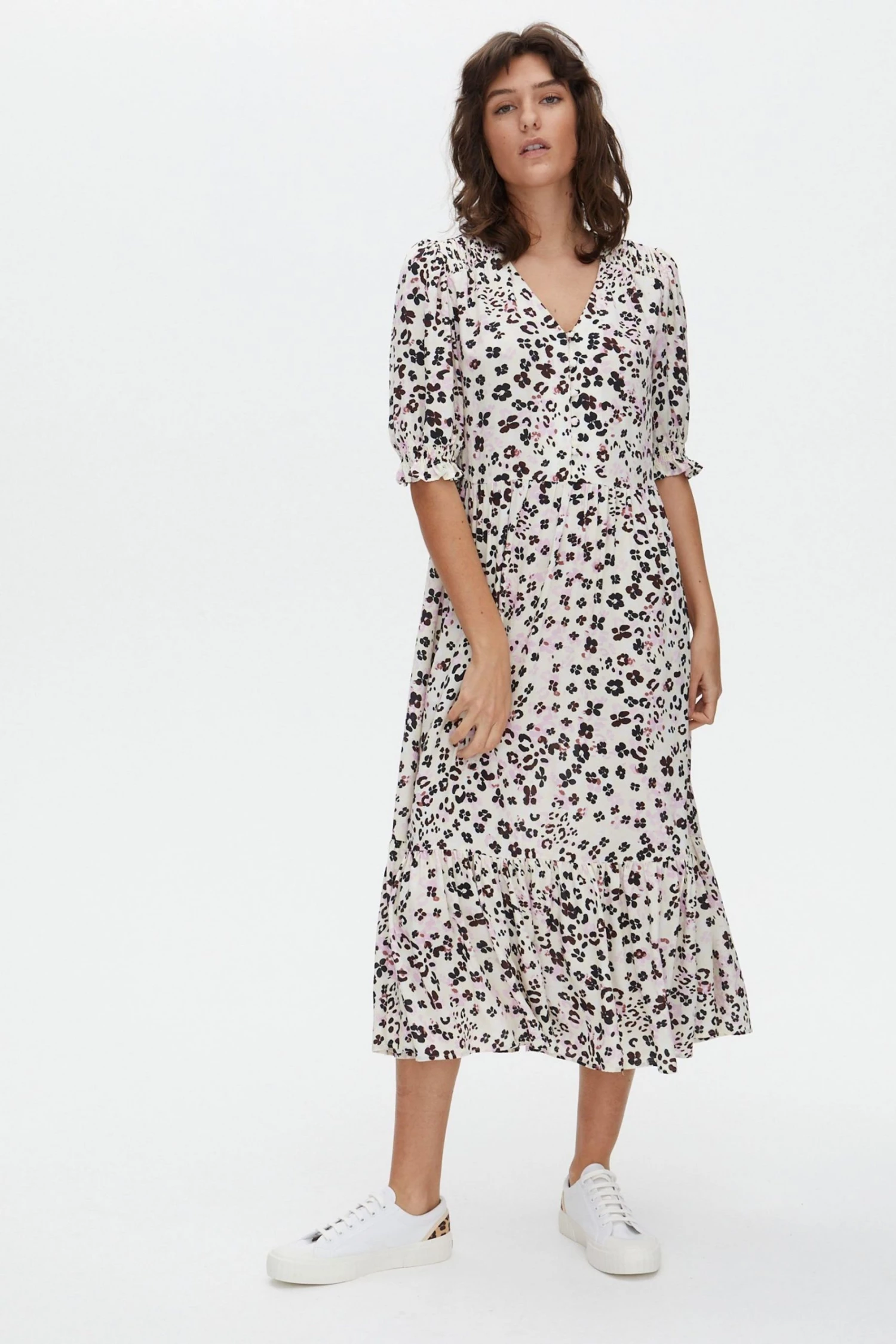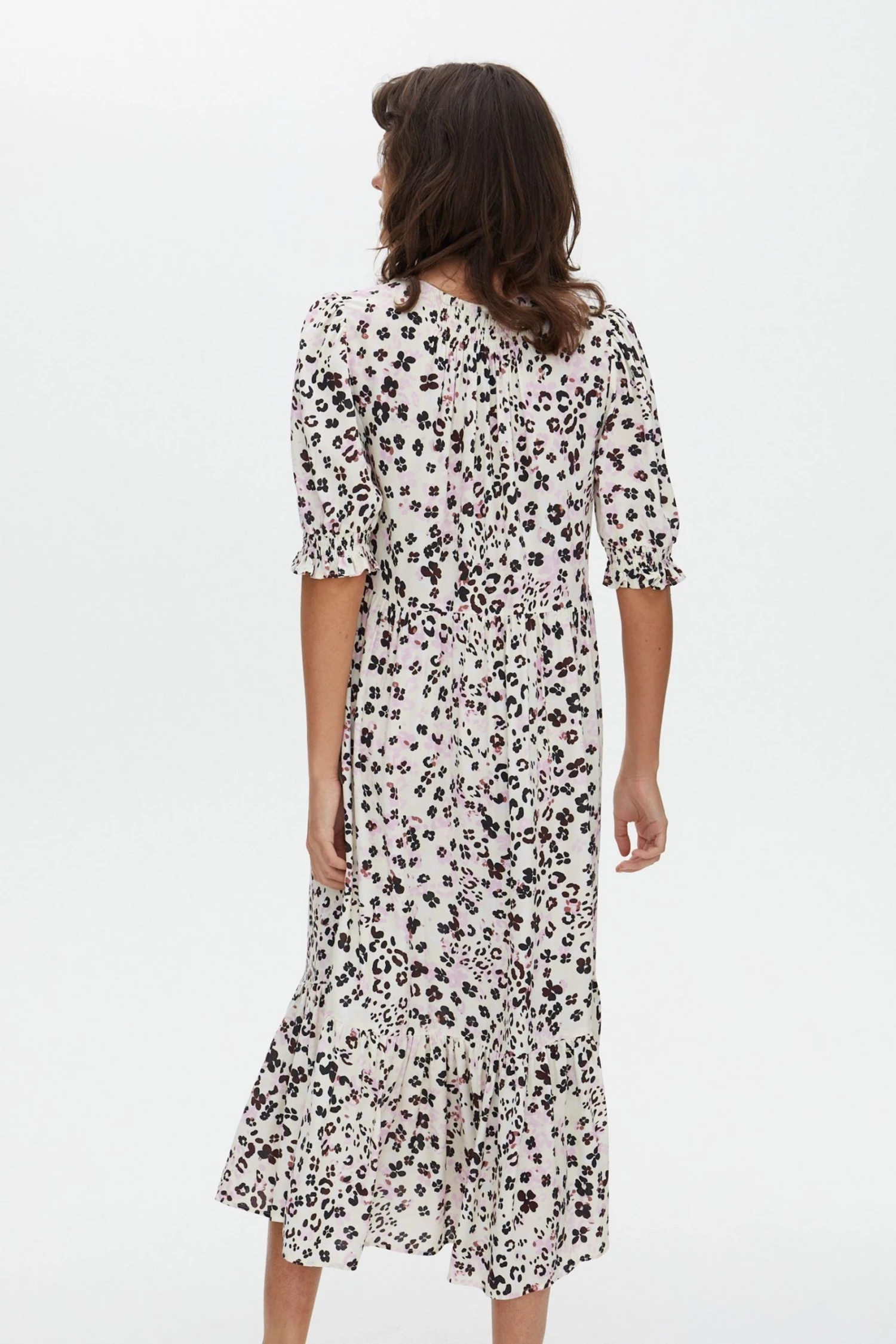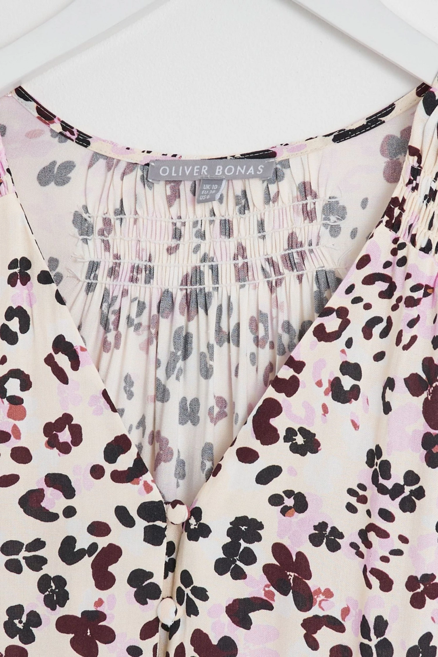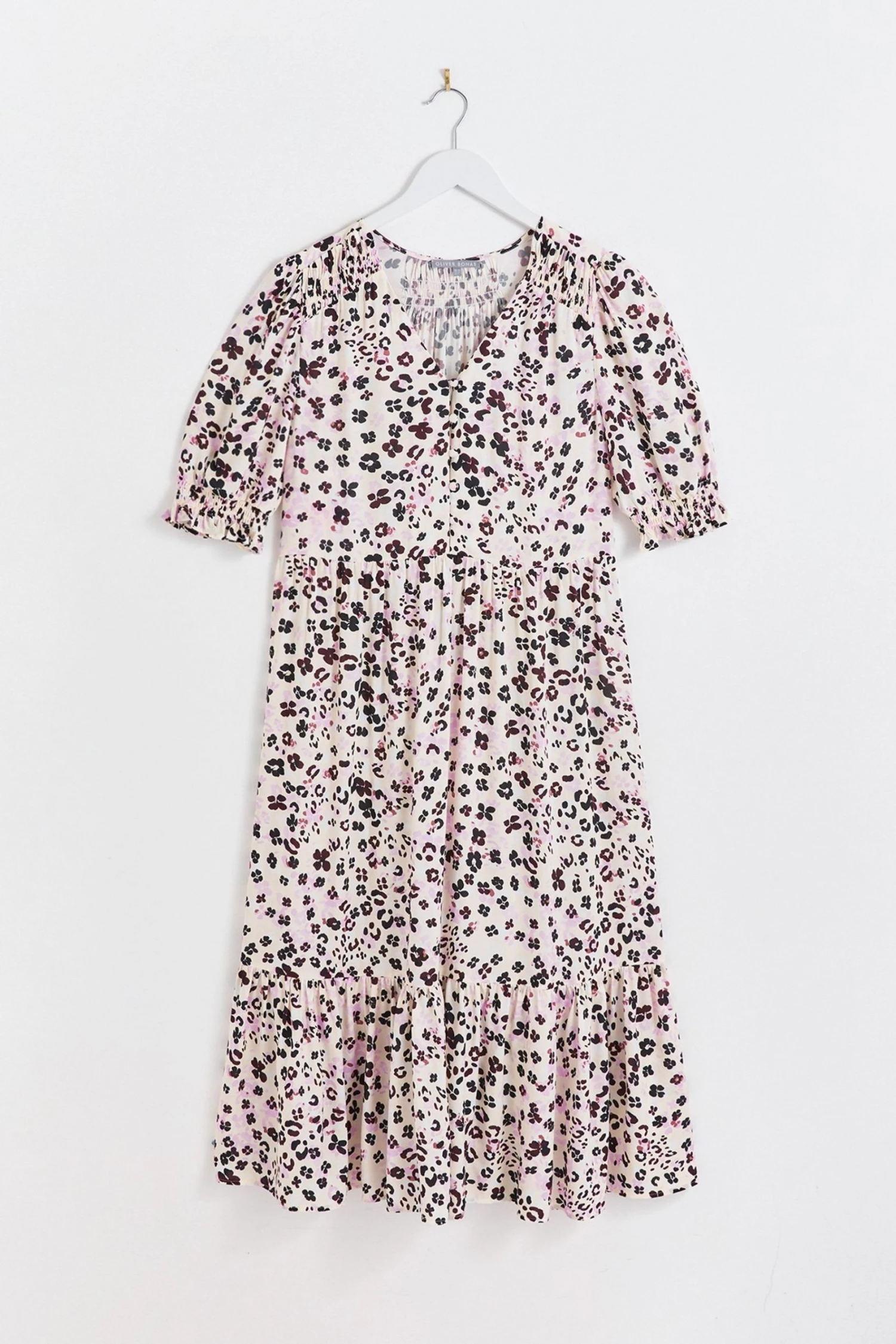 In a relaxed silhouette, this midi dress features a cheetah print pattern in pink, white and black tones, complete with covered button fastenings through the front. Shirred detailing runs throughout this midi dress and sits at the cuffs and back in an elegant finish.