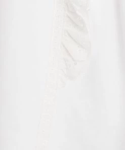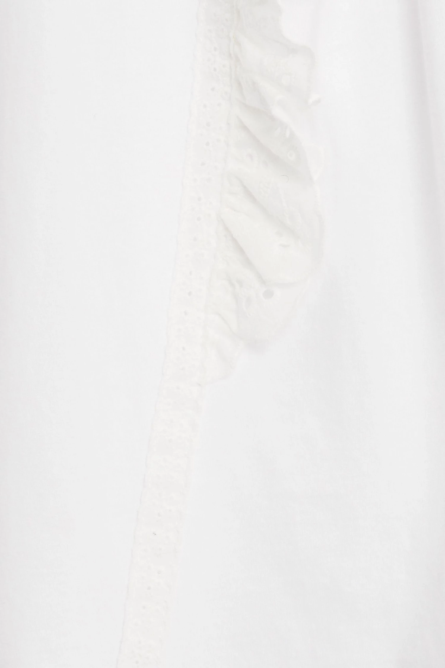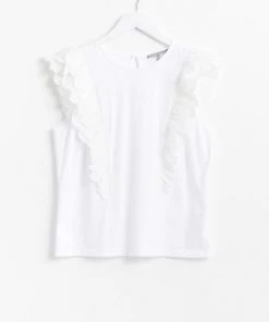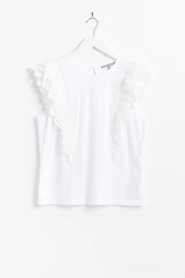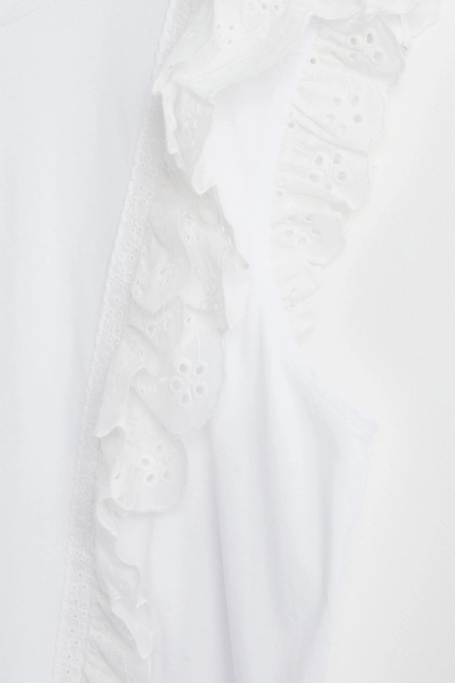 In a crisp white cotton, this ruffled vest top is a versatile piece to add to your wardrobe. With broderie detail ruffles lining the vest in two strips from front to back, a round neckline and fitted silhouette complete this top. Pair with jeans and sandals to complete your spring outfit.