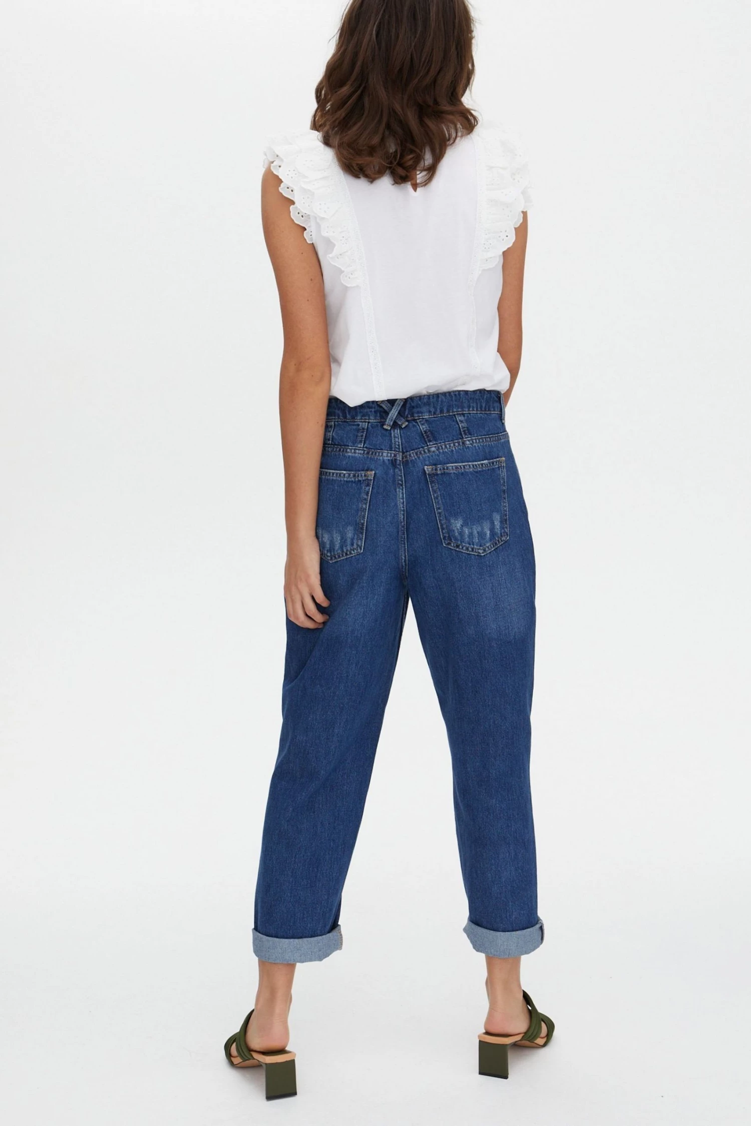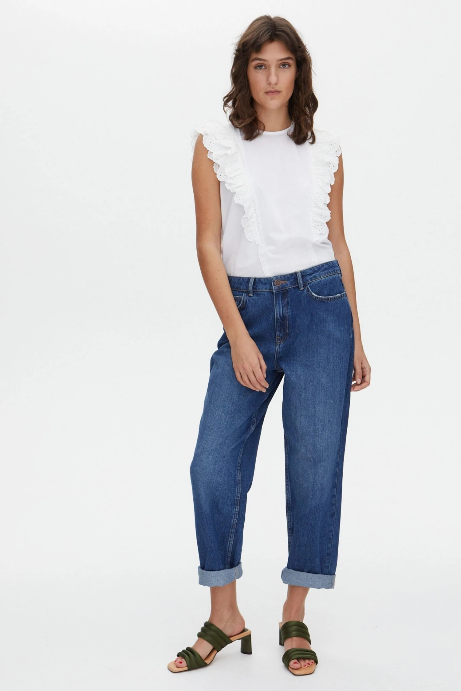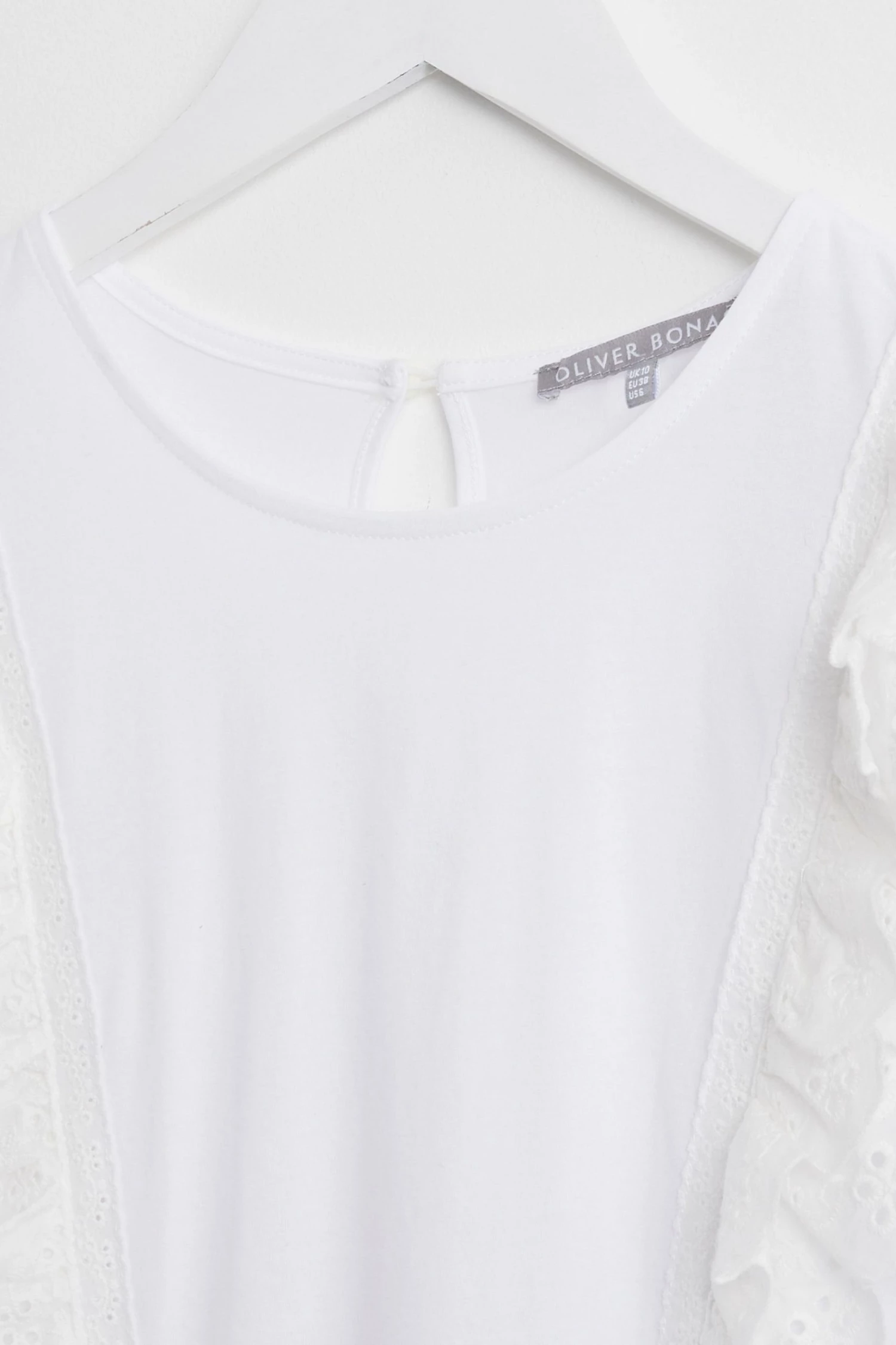 In a crisp white cotton, this ruffled vest top is a versatile piece to add to your wardrobe. With broderie detail ruffles lining the vest in two strips from front to back, a round neckline and fitted silhouette complete this top. Pair with jeans and sandals to complete your spring outfit.