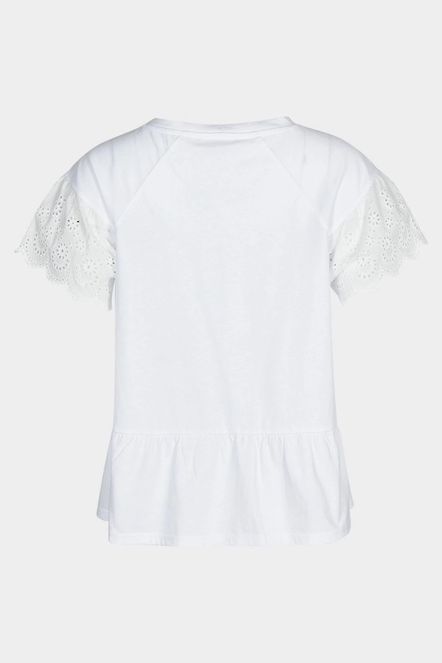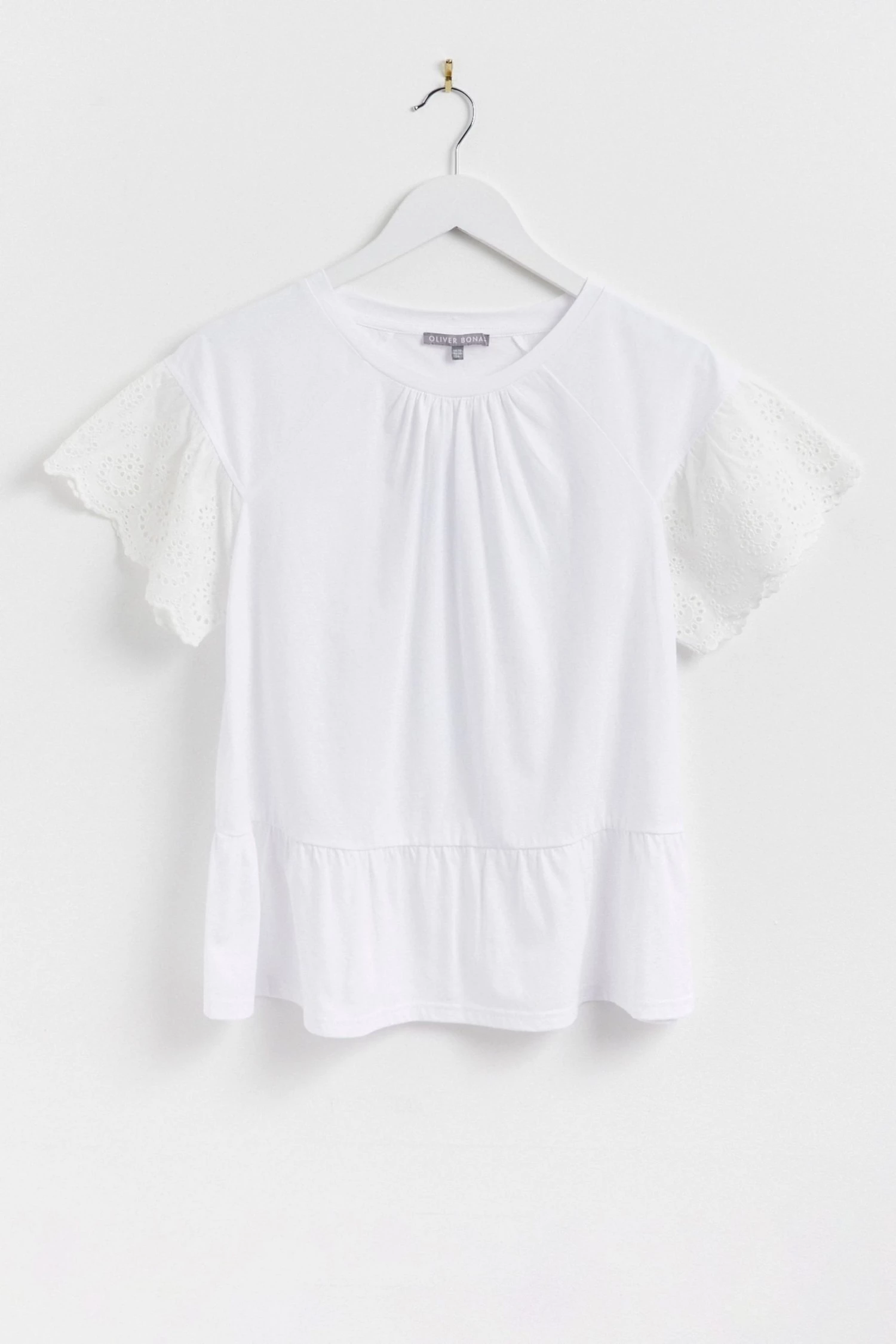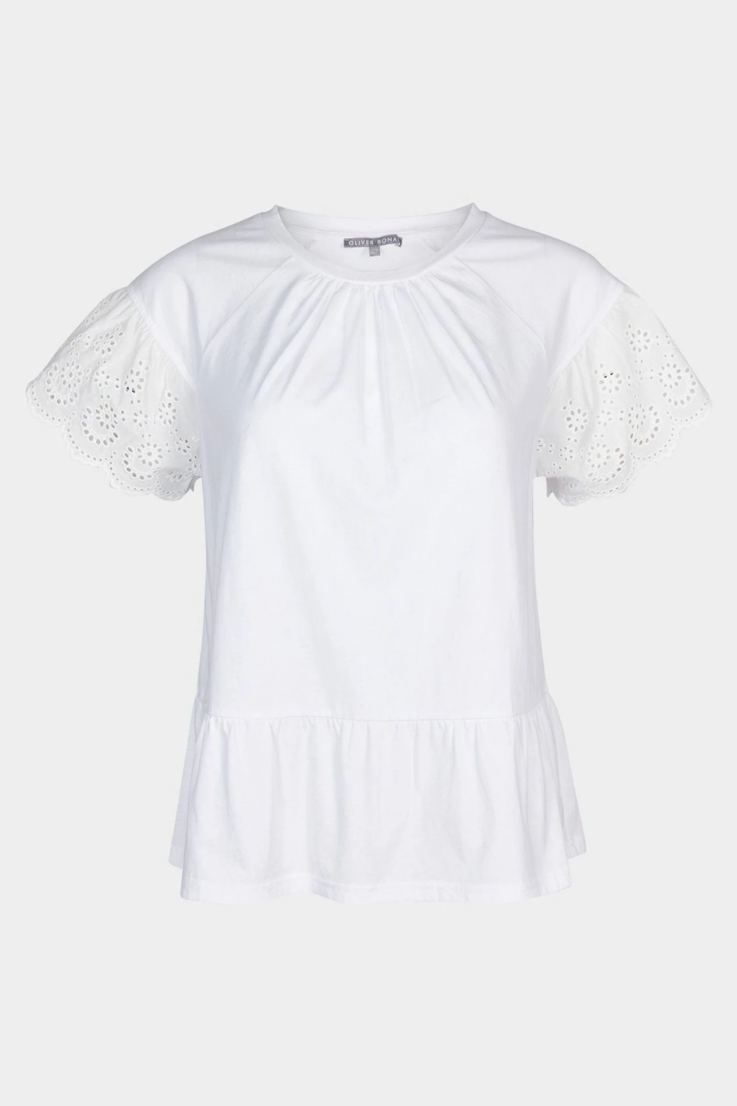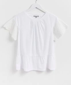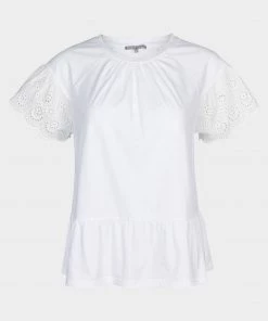In a bright white cotton, this top features broderie sleeves with scallop edges and a round neckline completed with pleated detailing. A pleated panel sits around the bottom of this top creating a subtle A-line silhouette.