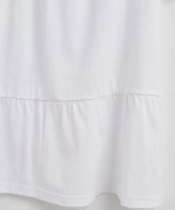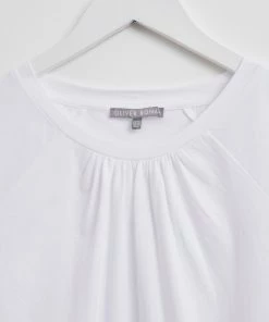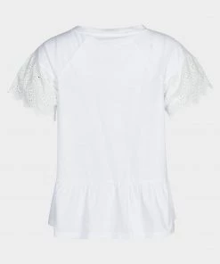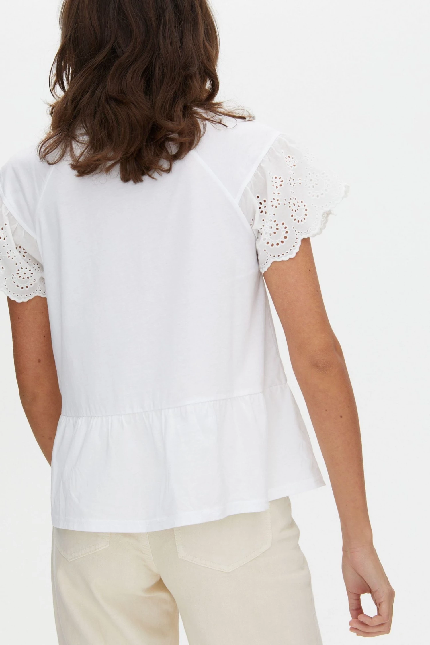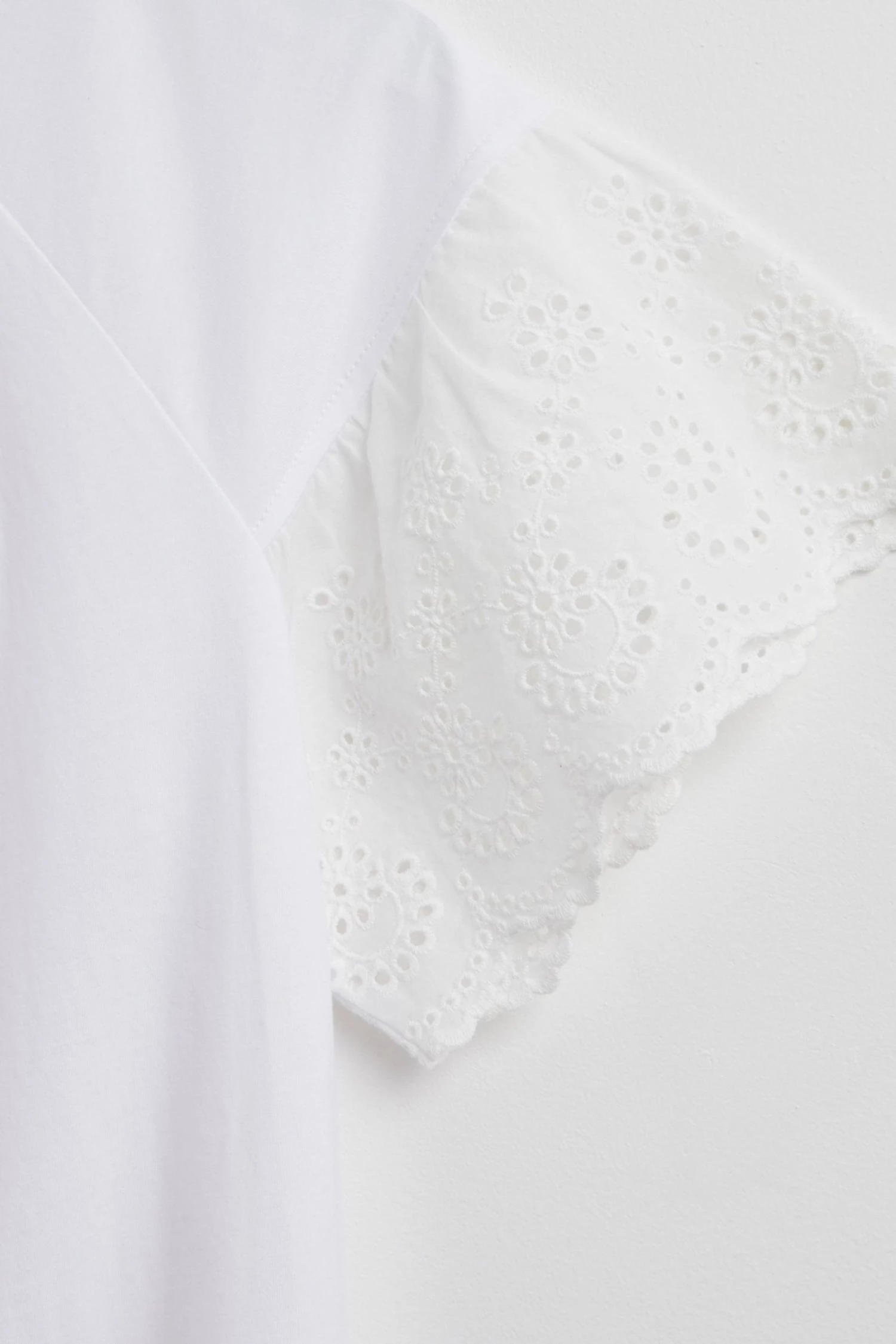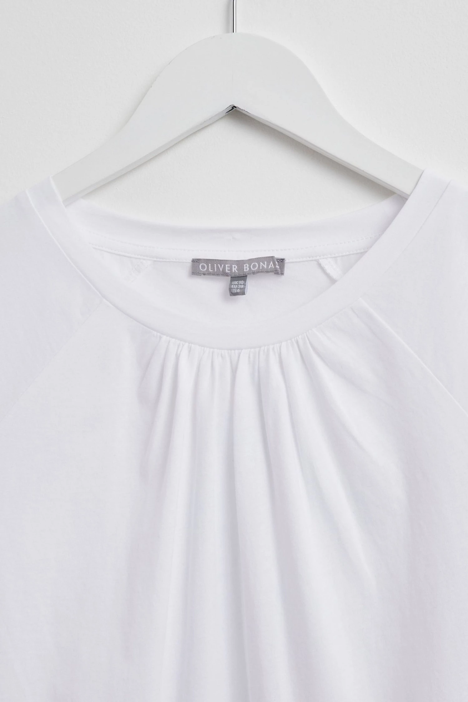 In a bright white cotton, this top features broderie sleeves with scallop edges and a round neckline completed with pleated detailing. A pleated panel sits around the bottom of this top creating a subtle A-line silhouette.