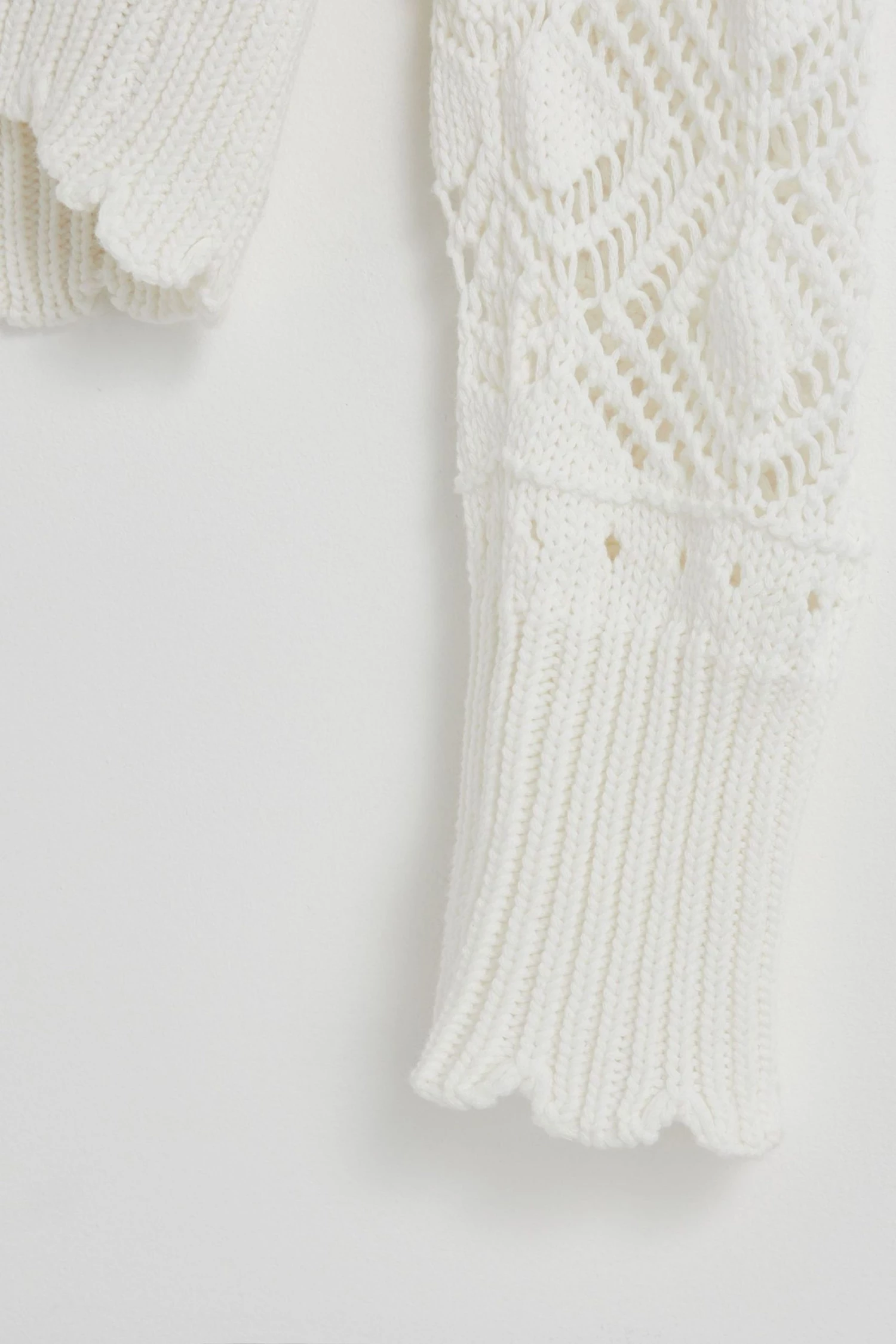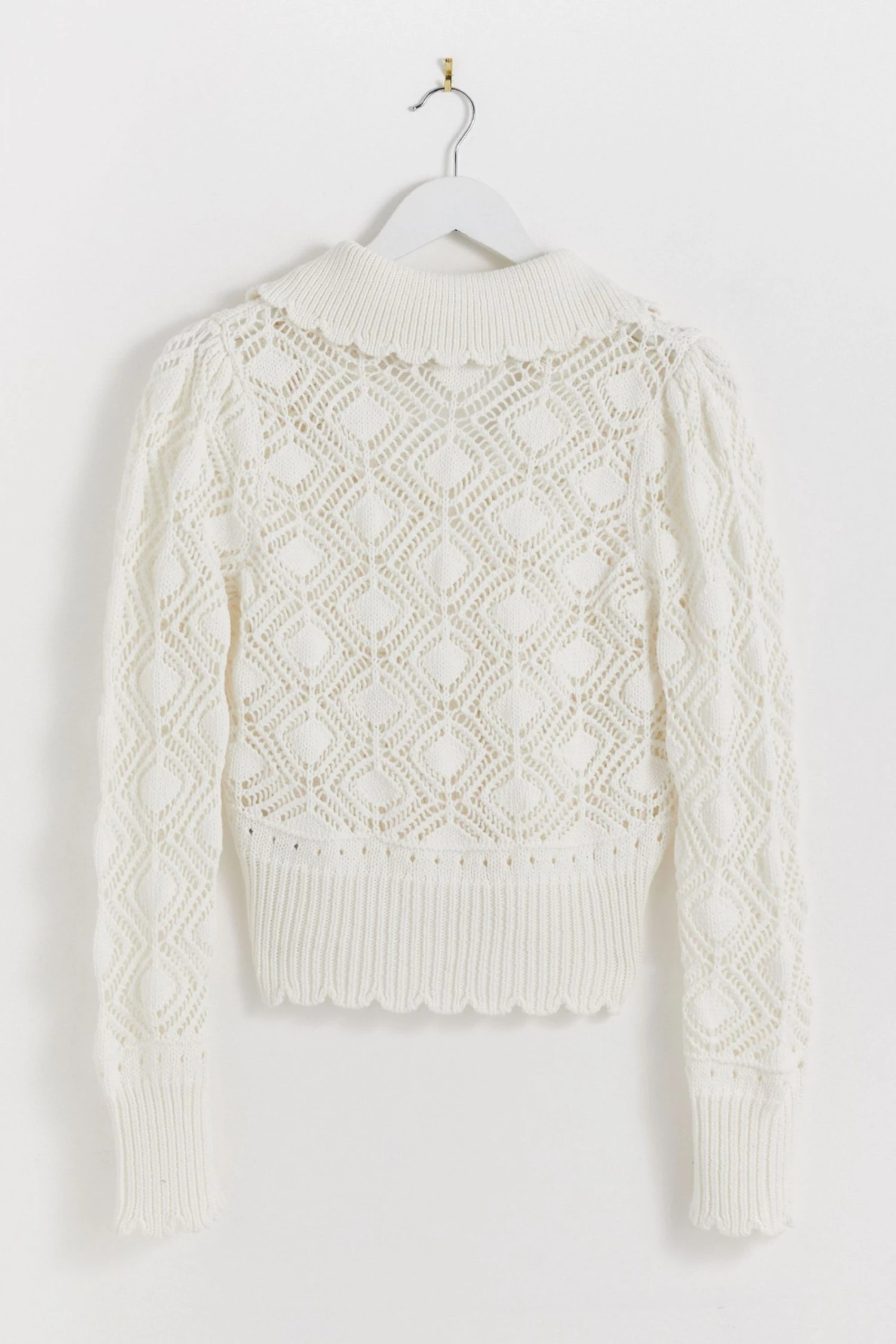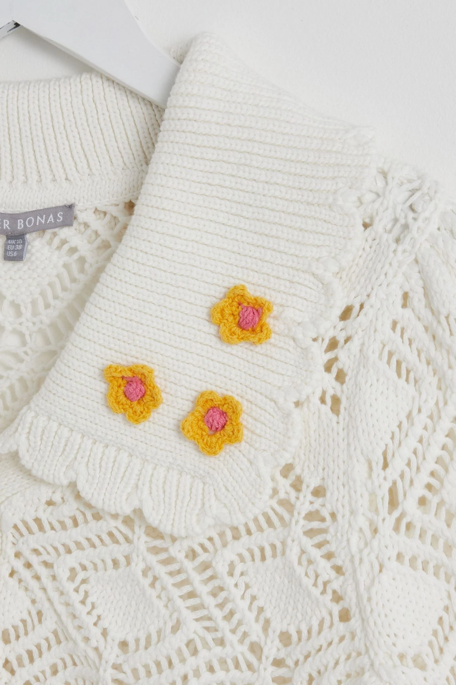 In an open knit design, this white cropped cardigan features romantic details like scalloped hems, an oversized collar and embroidered flowers in pink and yellow tones to add a statement styling piece to your collection.