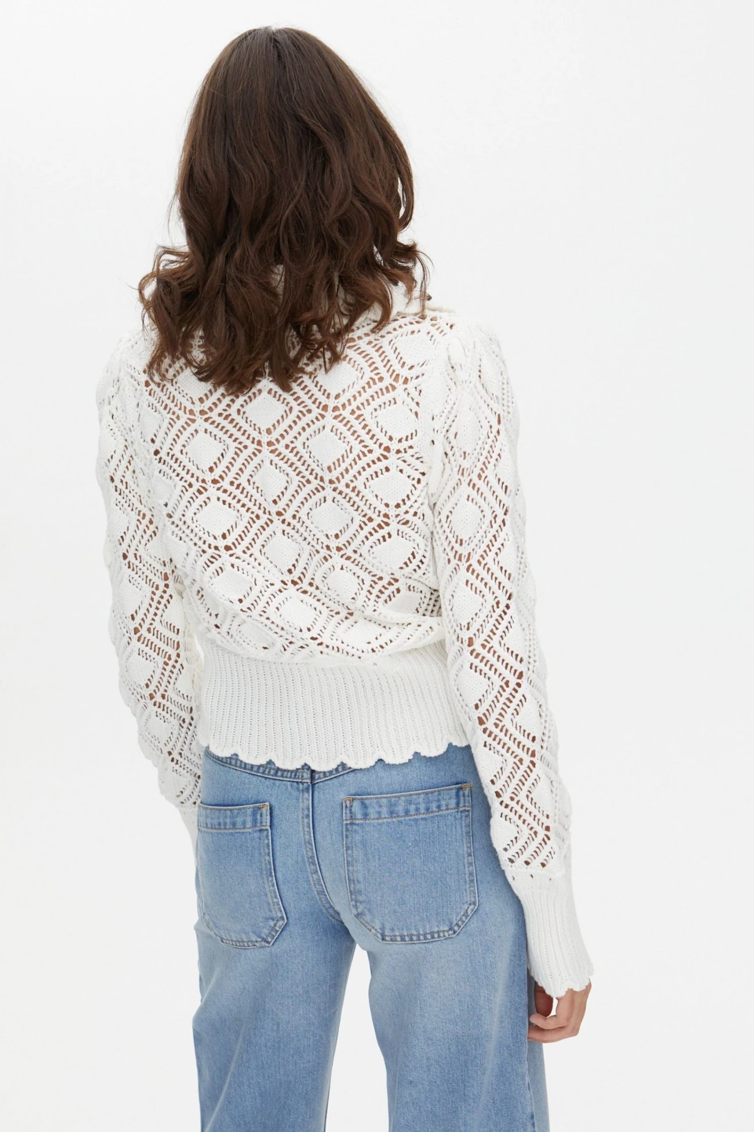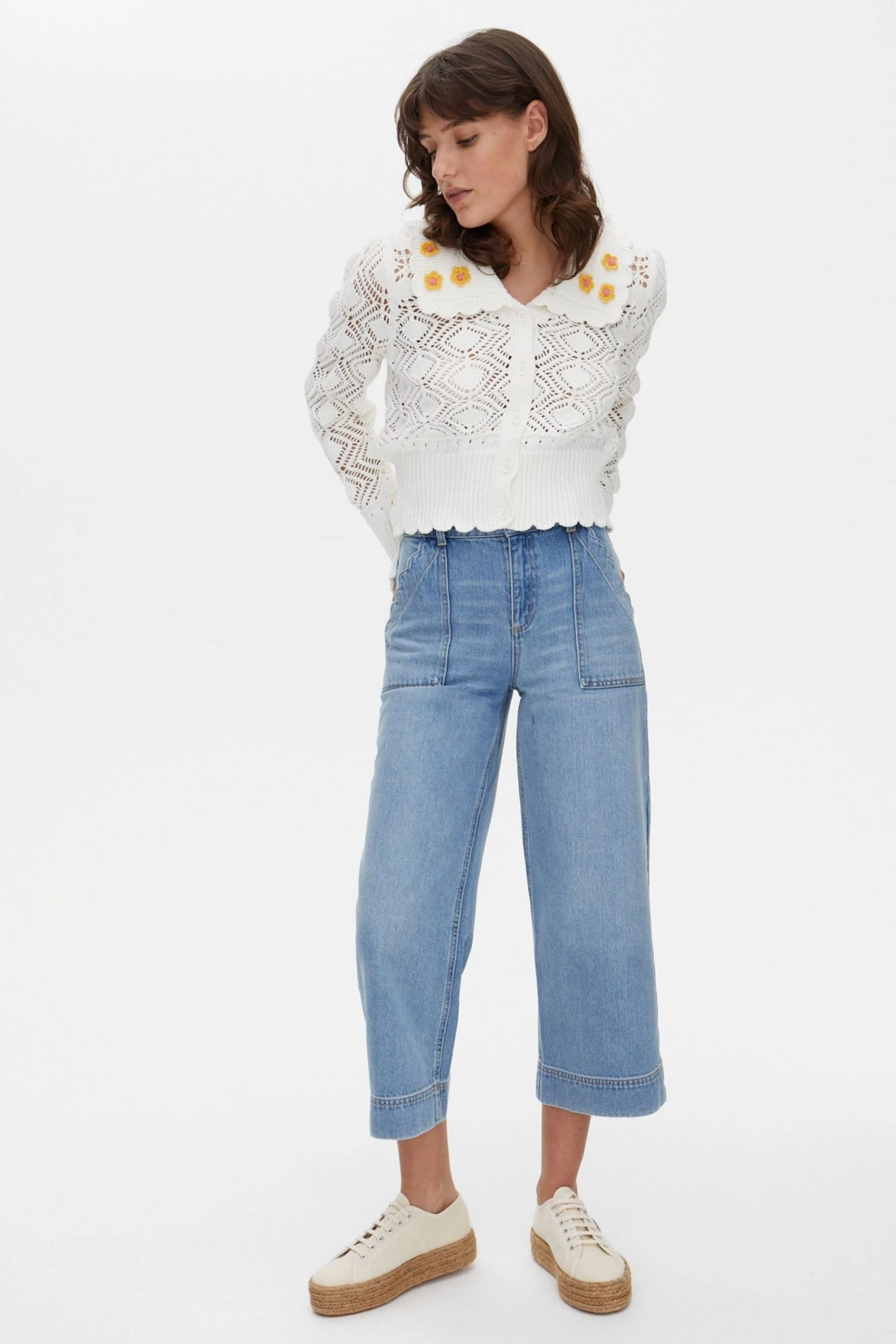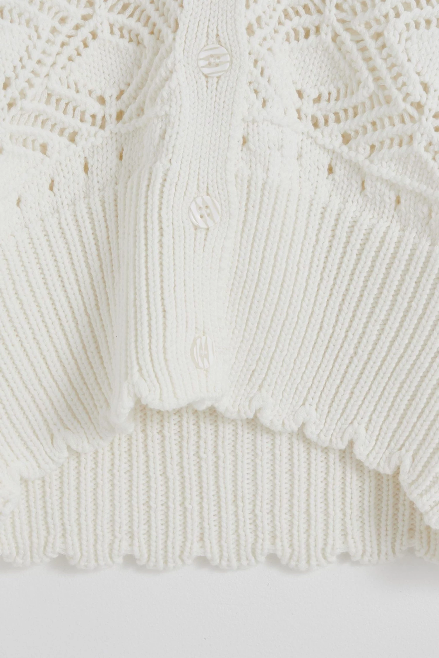 In an open knit design, this white cropped cardigan features romantic details like scalloped hems, an oversized collar and embroidered flowers in pink and yellow tones to add a statement styling piece to your collection.