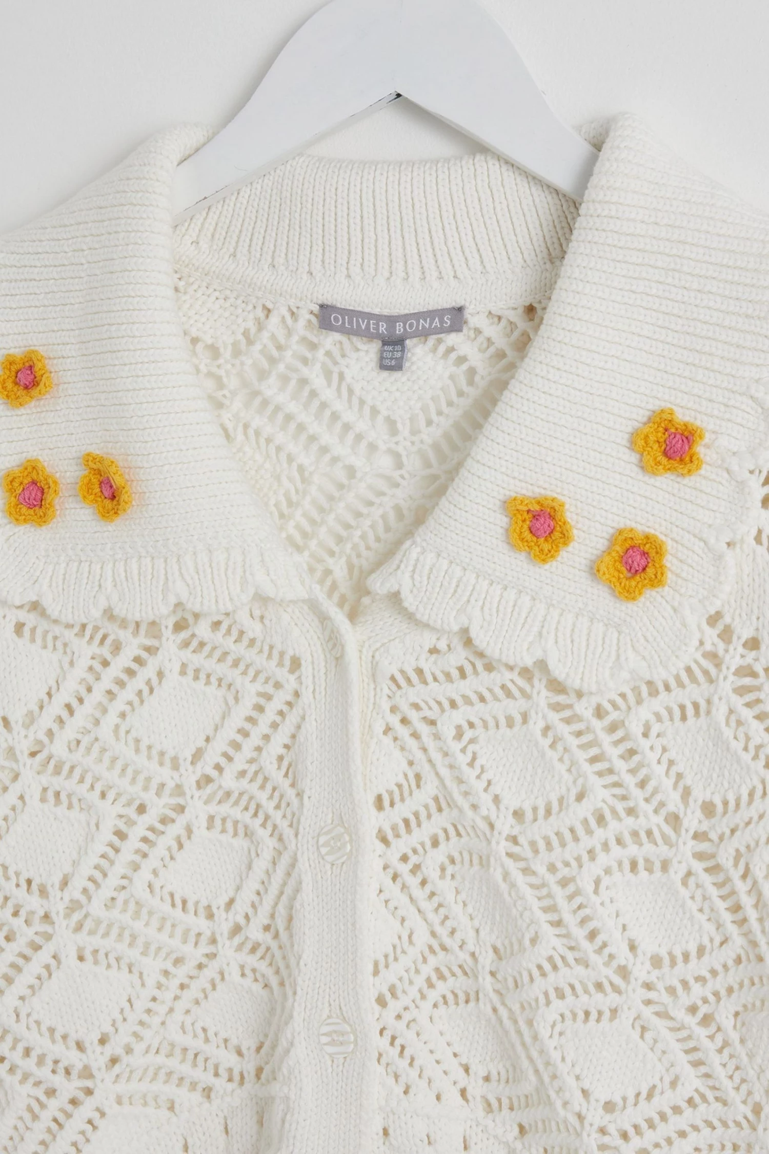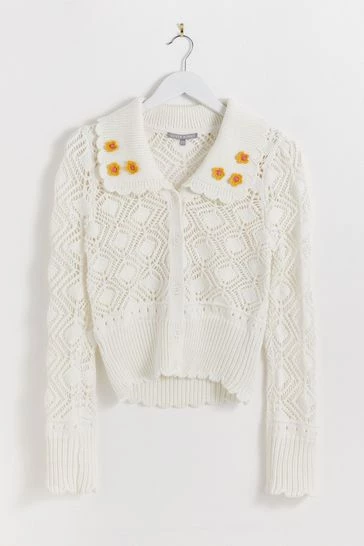Oliver Bonas White Floral Collar Button Ivory Knitted Cardigan