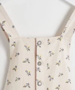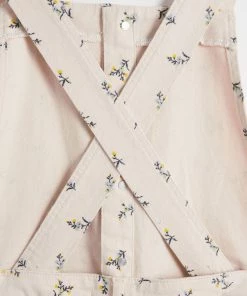 In a cotton twill fabric, these dungarees are adorned with a floral print with hints of blue and yellow on a cream base. Silver toned button fastenings finish at the waist and are met with a wide leg silhouette. Medium profile straps cross over at the back with pockets sitting on both sides. Pair with a white T-shirt and tote bag for a fun and functional look.