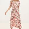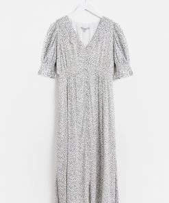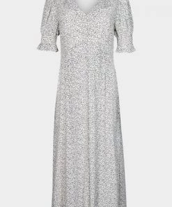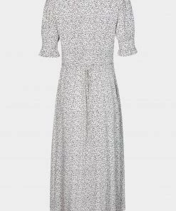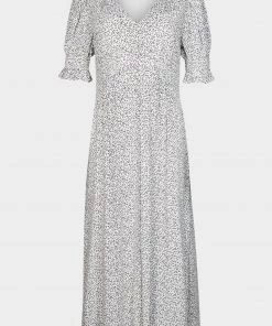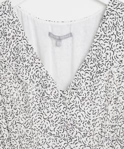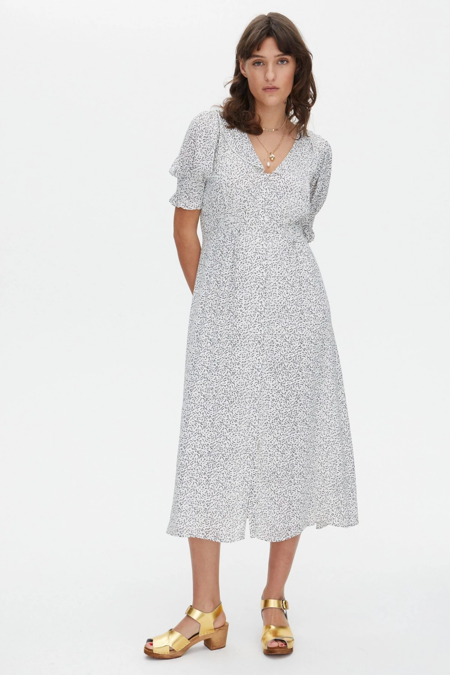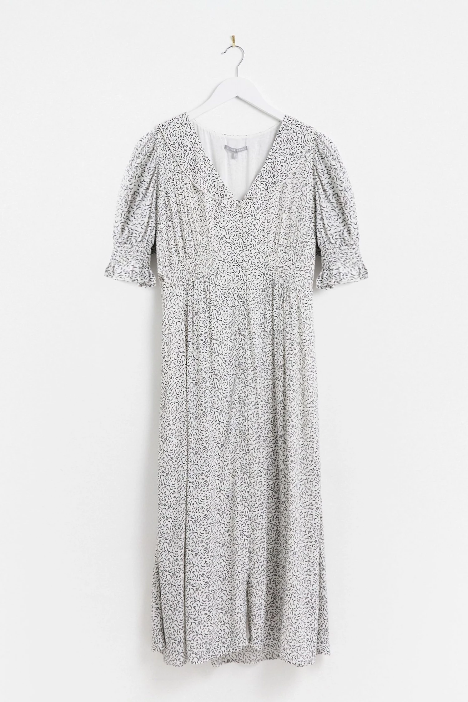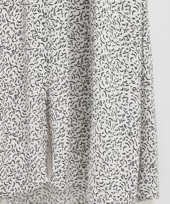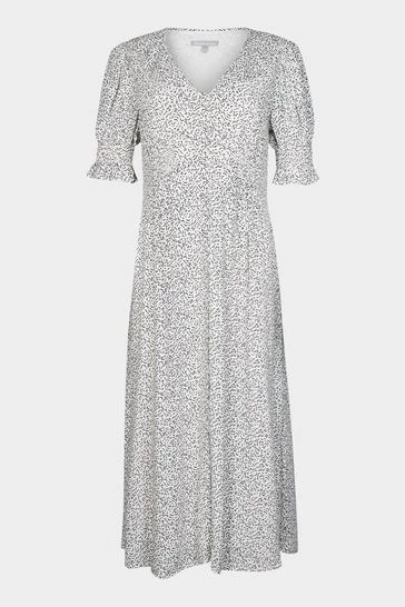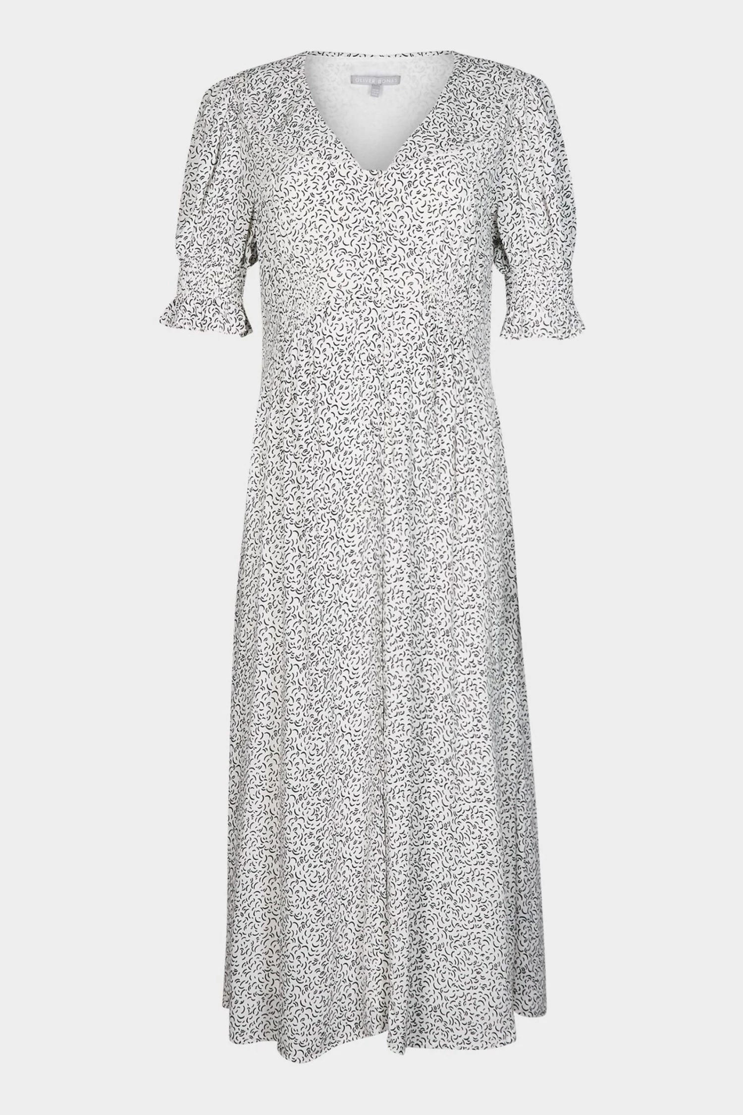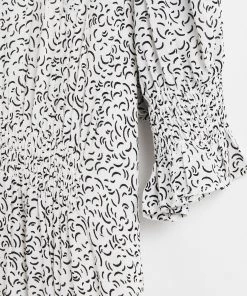 Adorned with an abstract dash pattern in black on a white fabric, this relaxed midi dress features a V-neckline with an oversized collar, completed with elasticated cuffs and covered button fastenings through the centre.