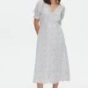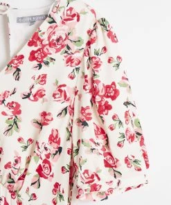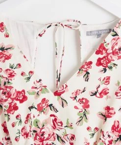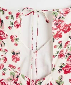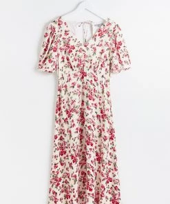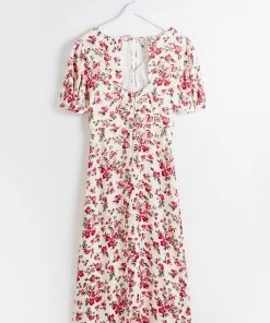 In a romantic white and red floral rose print, this midi dress combines a simple A-line silhouette with a V-neckline and short cuffed sleeves to create an occasion must-have. Featuring a rounded open back design with tie-up fastening at the back of the neck, this flowy dress is complete with a zip closure.