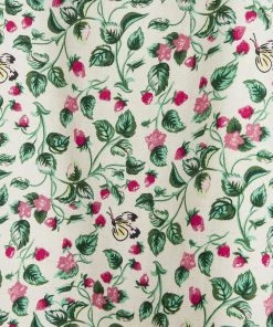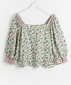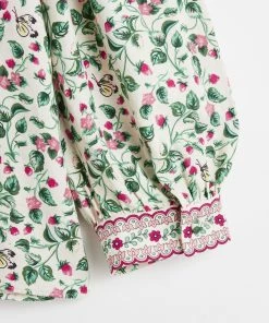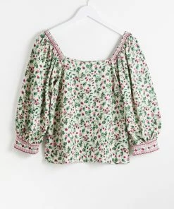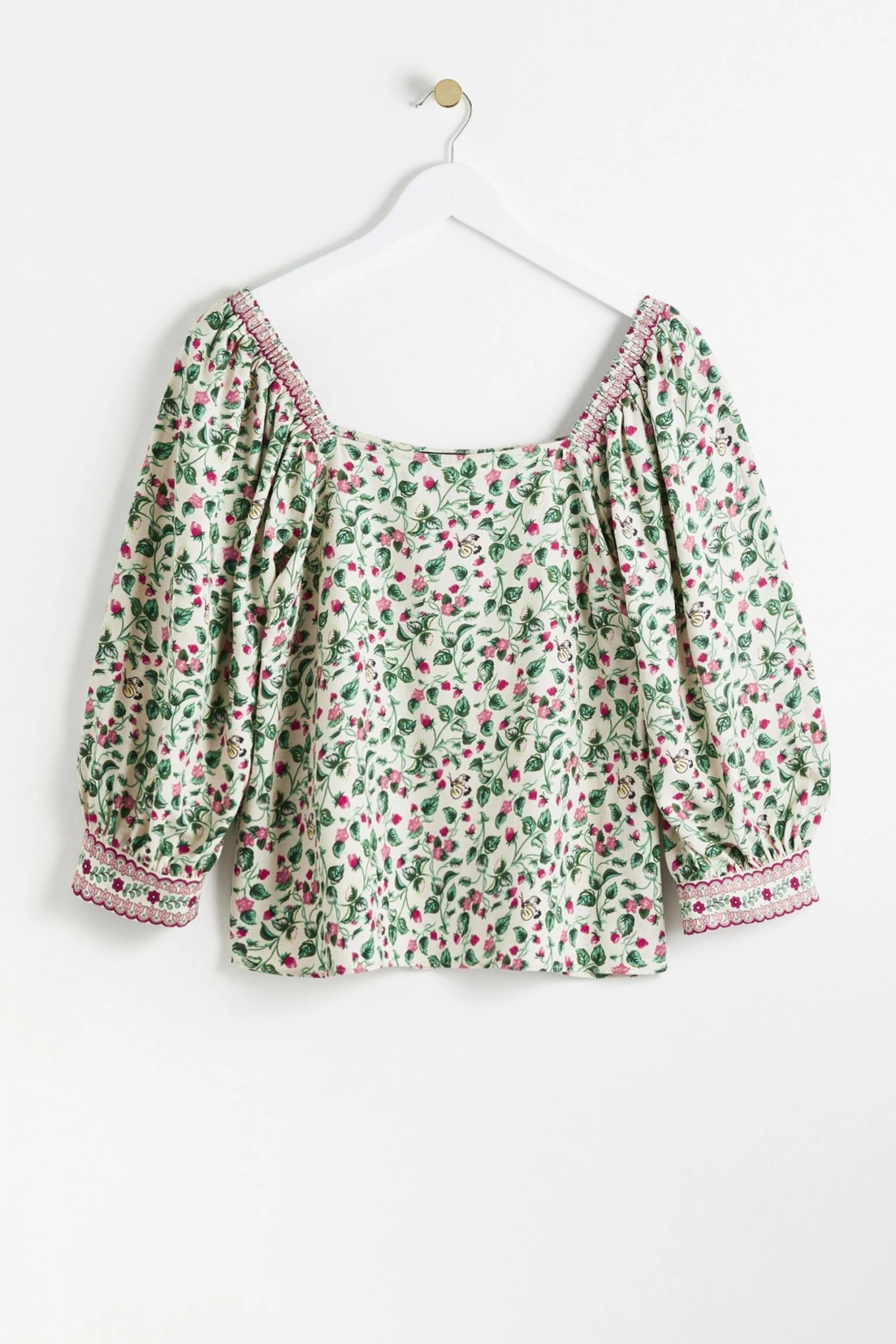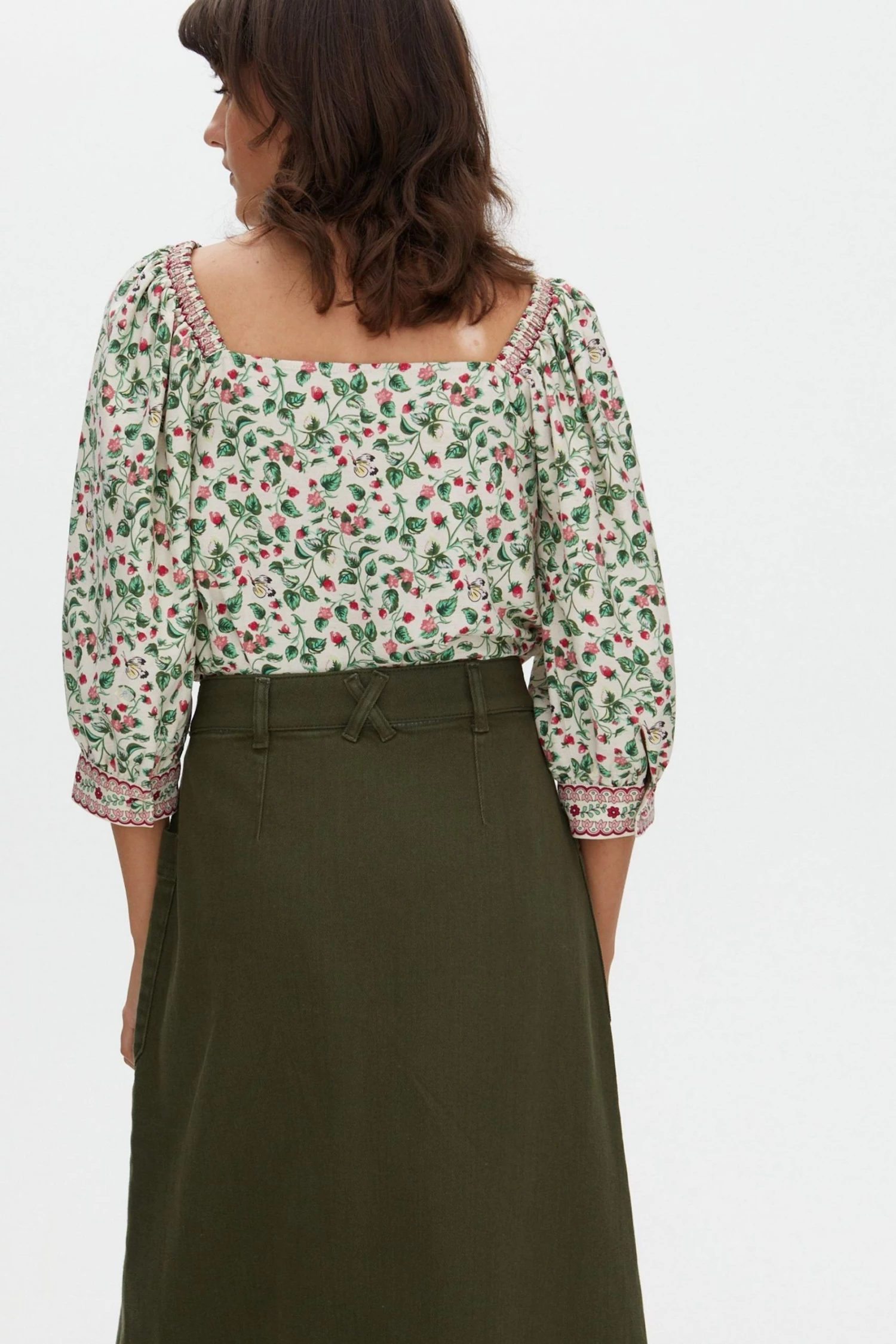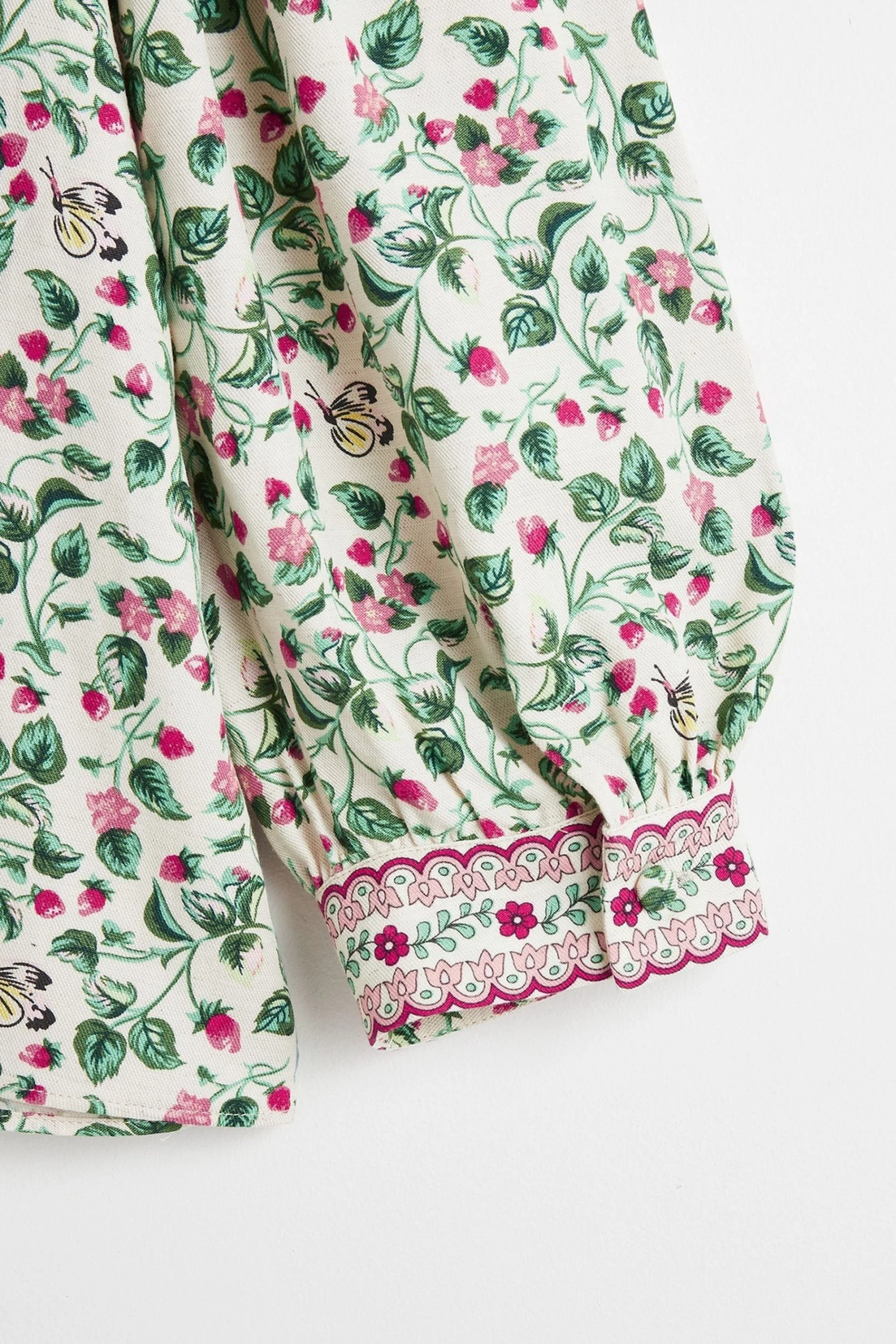 In a field of strawberry print, this square neck blouse is covered in natural pink, cream and green tones. A relaxed profile and cuffed long sleeves combined with elasticated shoulders creates an airy look to this fresh top.