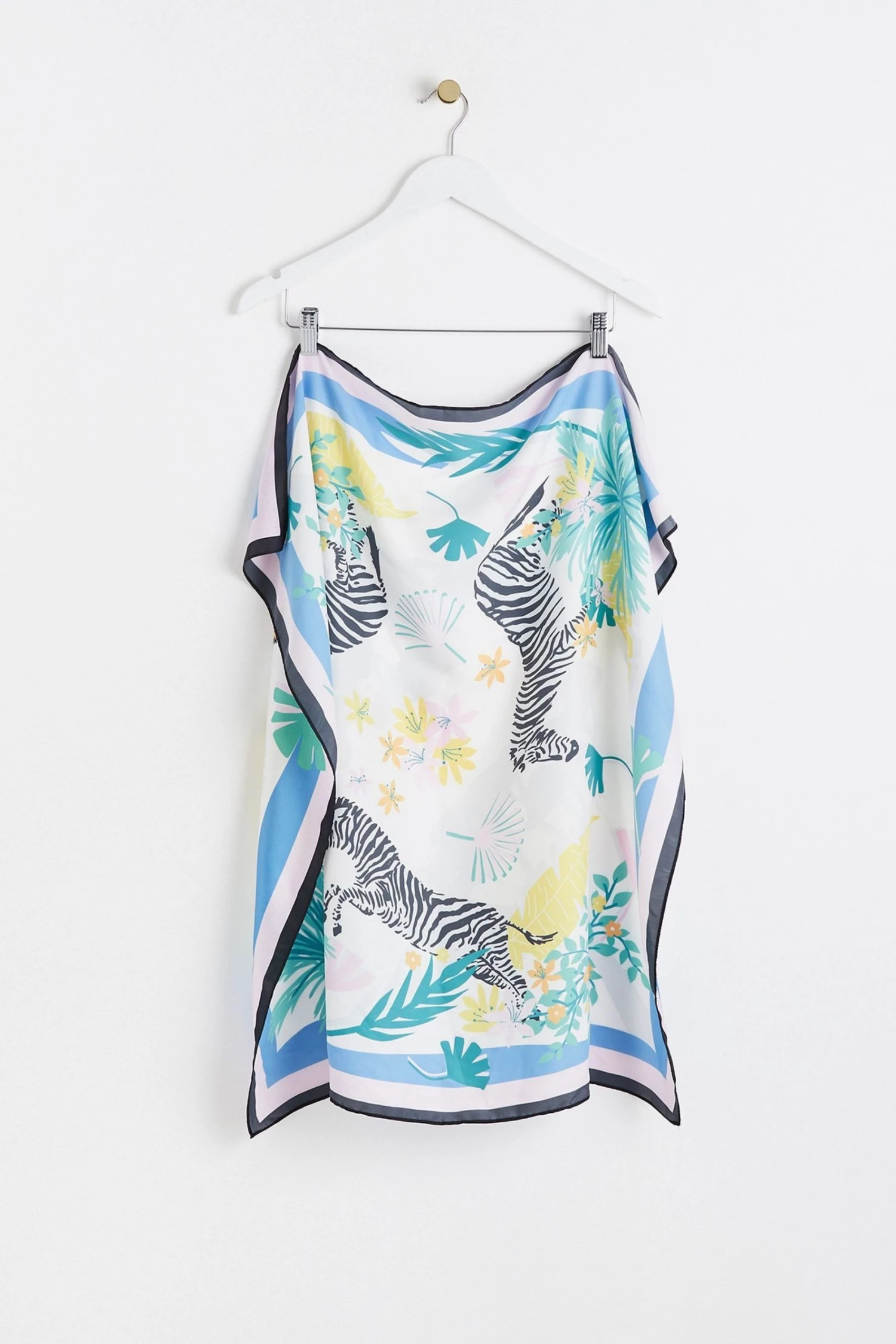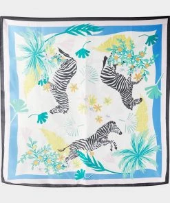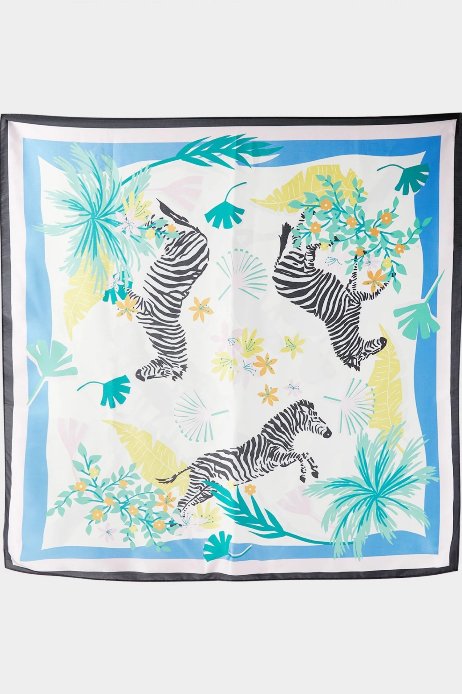 A border of blue and black surrounds this unique zebra design light weight scarf. Wrap around your neck on your way out of the door or tie onto your handbag for a chic look.