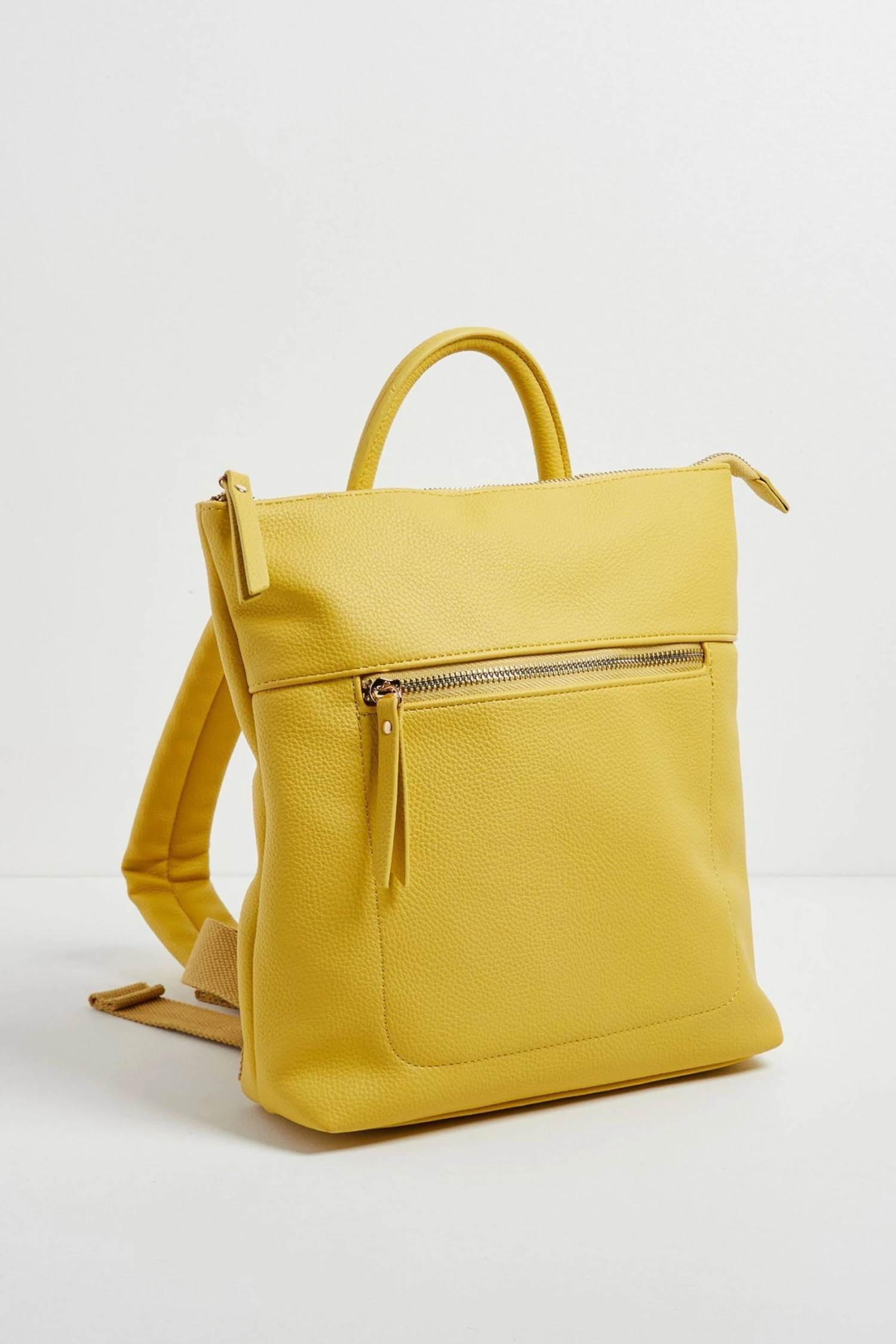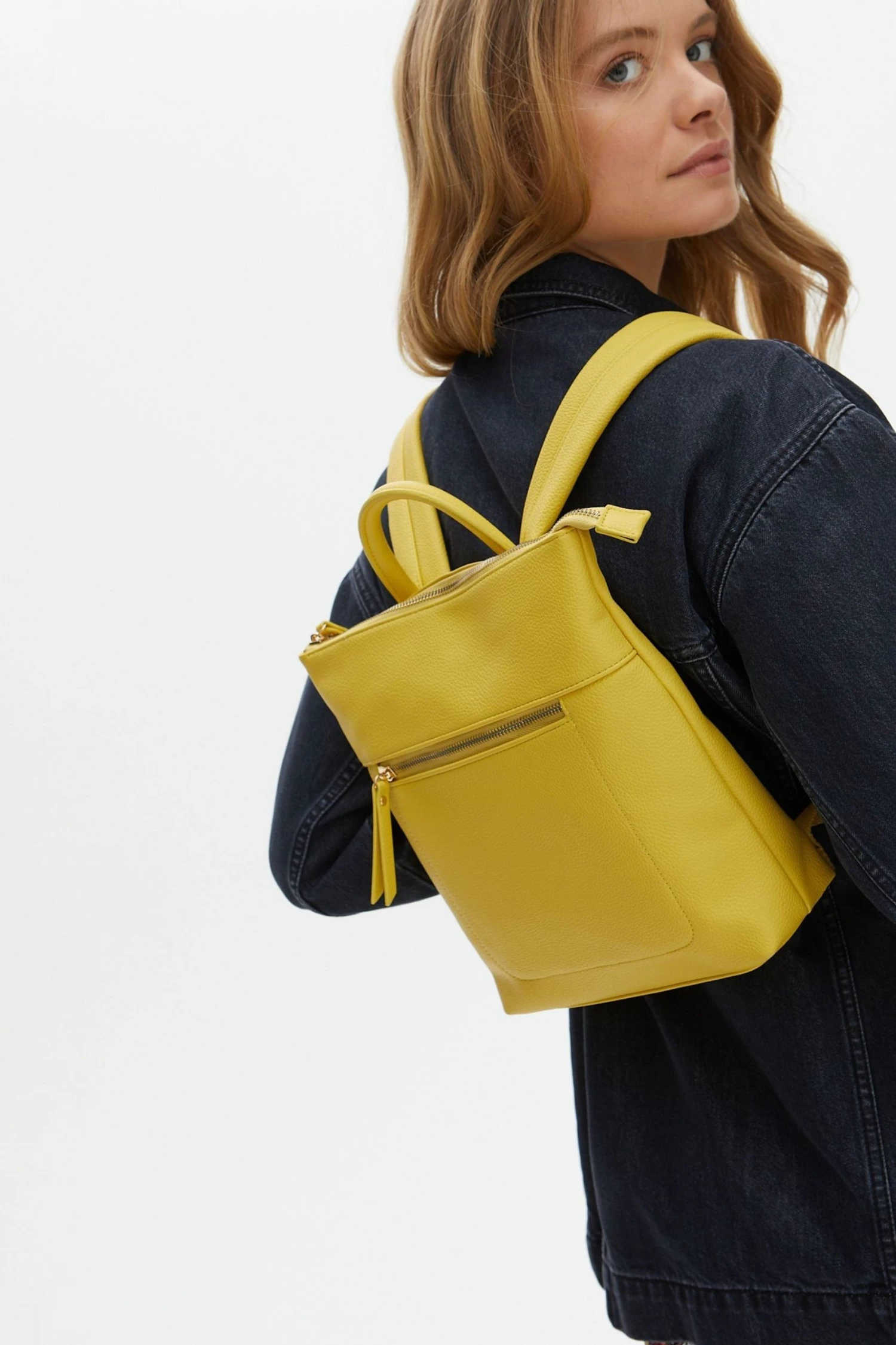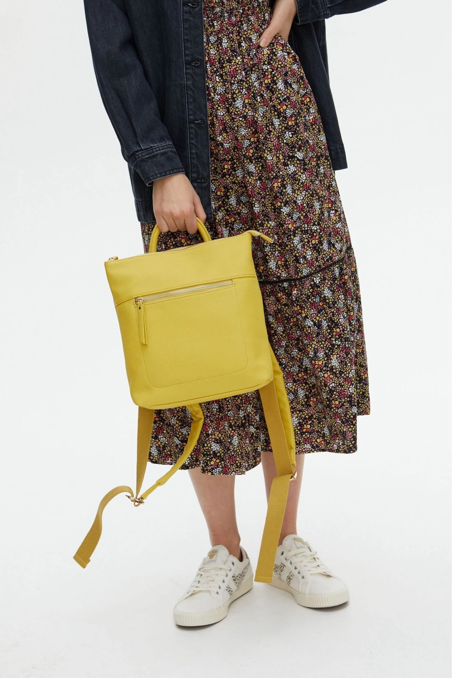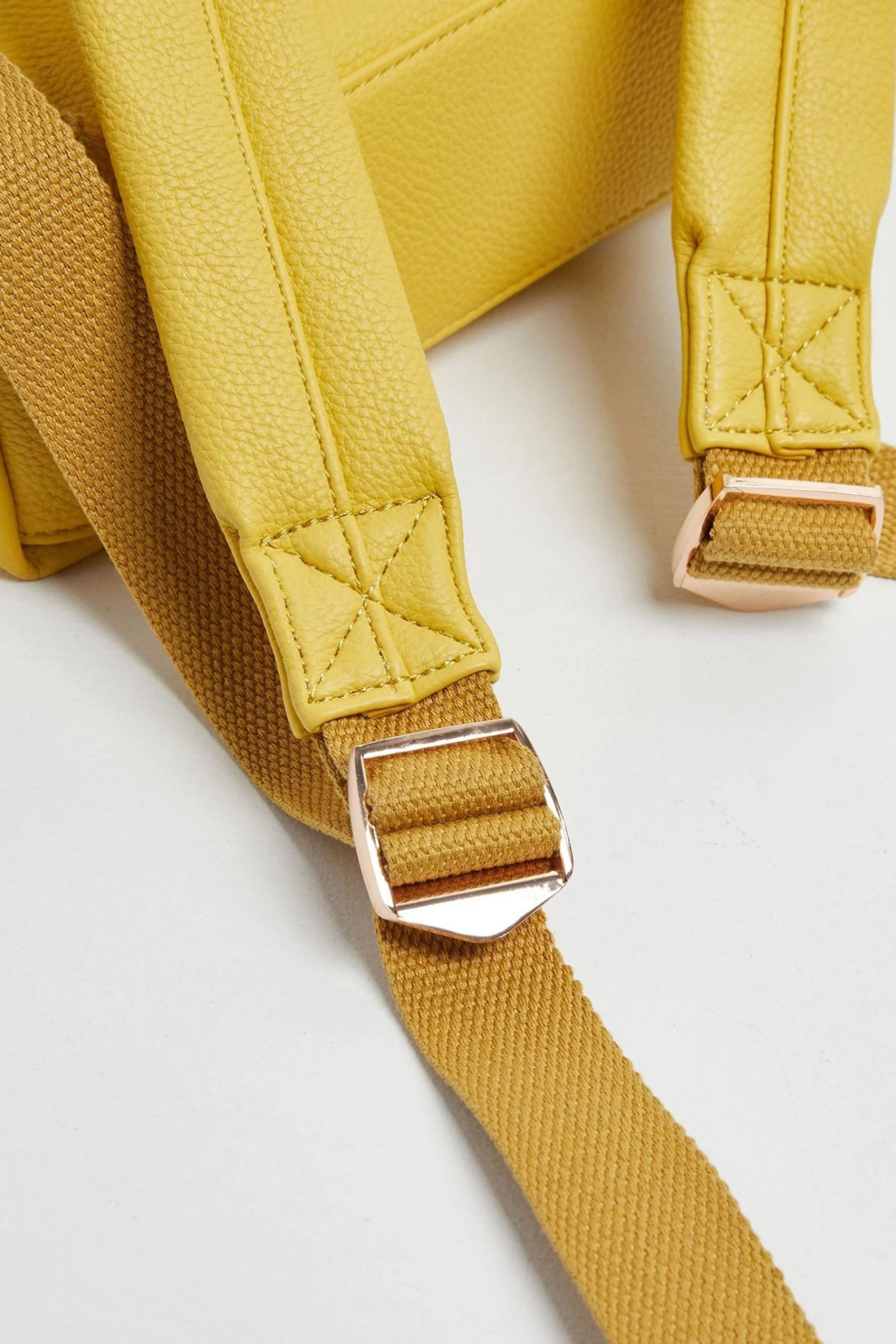 In a compact square profile, this sunny yellow backpack features a spacious lined compartment as well as both inner and outer zipped pockets with gold-toned metal ware, completed with adjustable shoulder straps and a short handle.