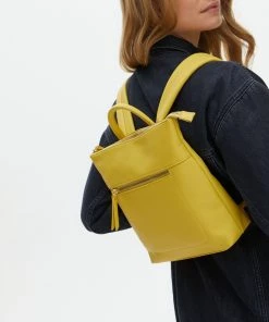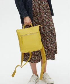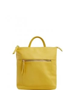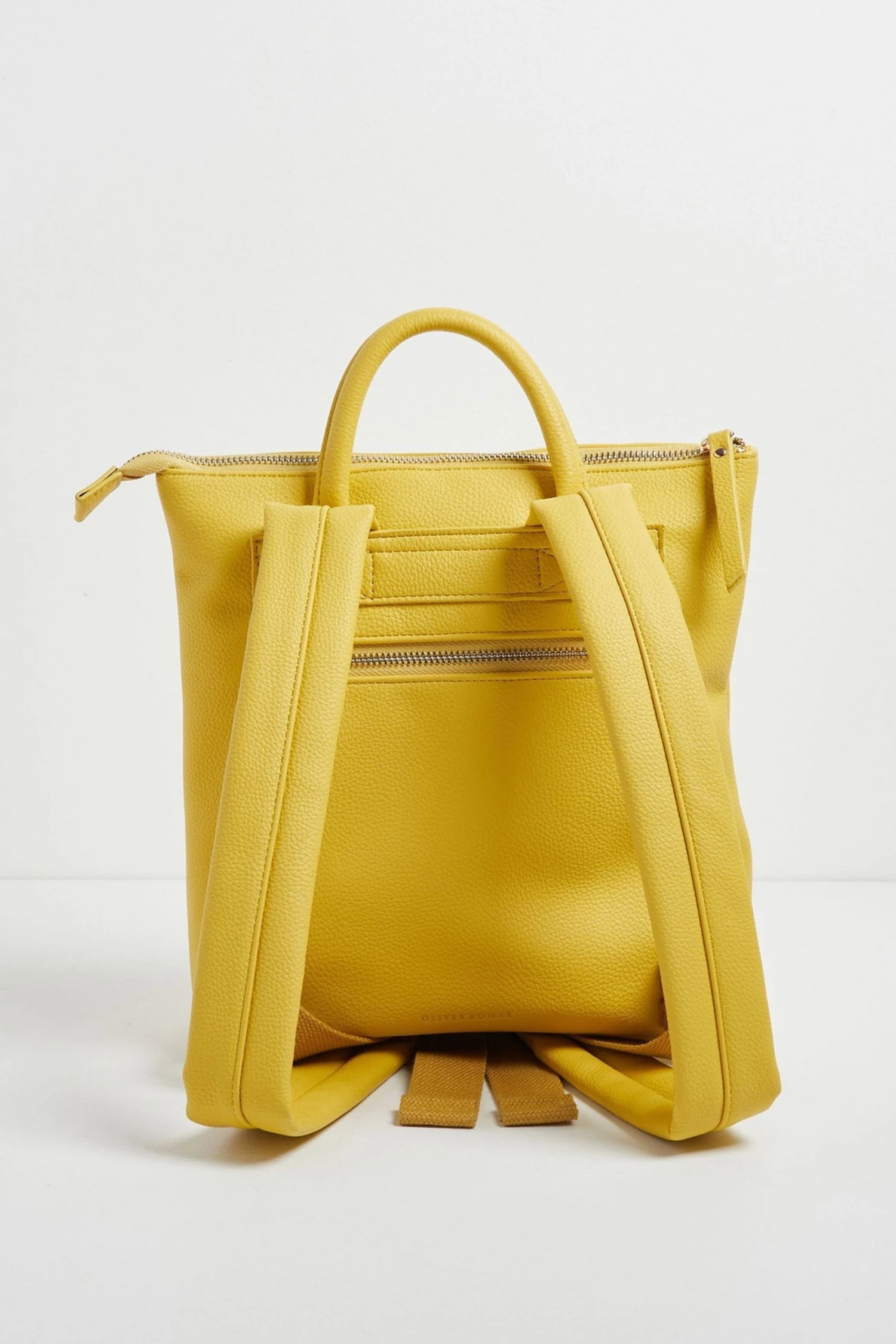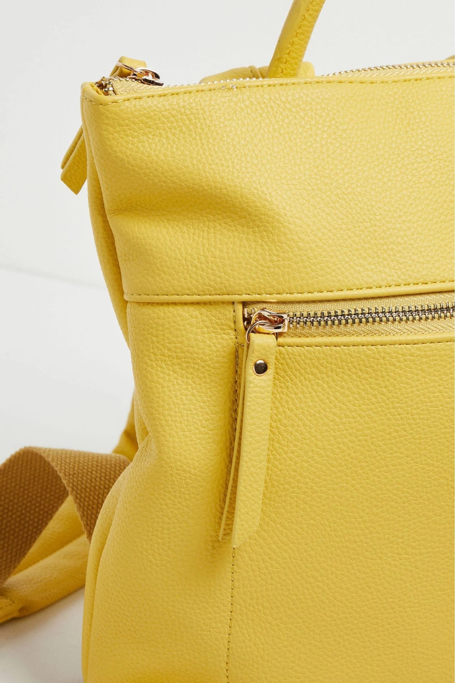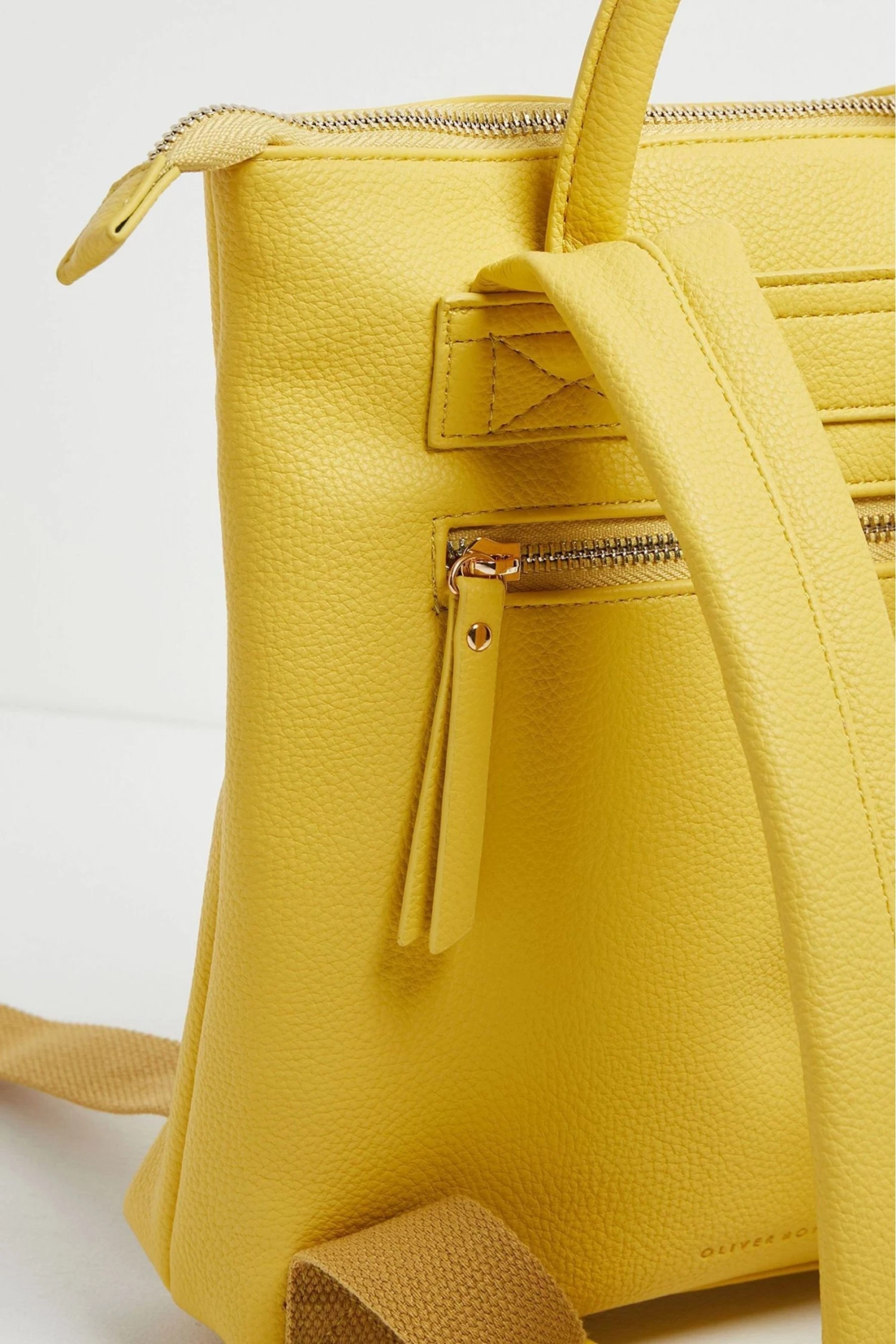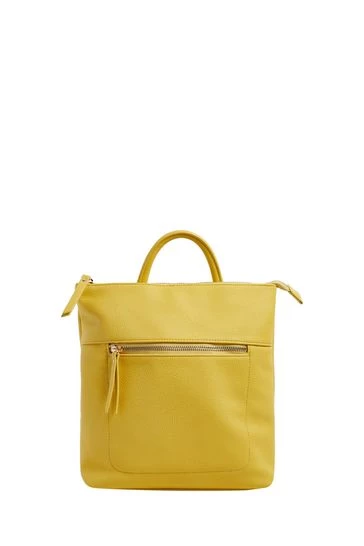 In a compact square profile, this sunny yellow backpack features a spacious lined compartment as well as both inner and outer zipped pockets with gold-toned metal ware, completed with adjustable shoulder straps and a short handle.