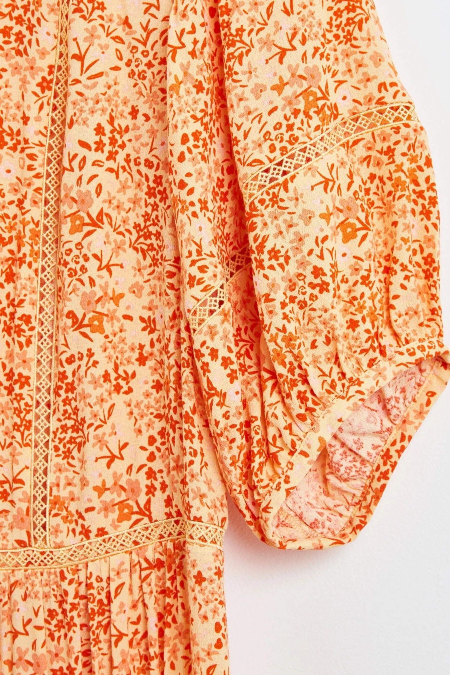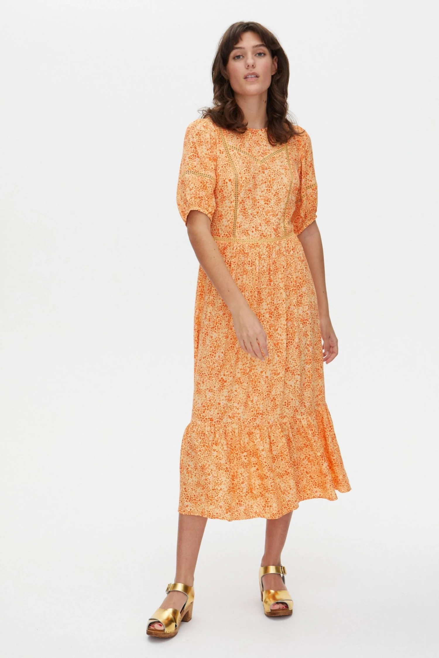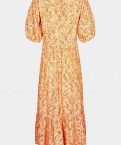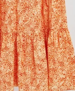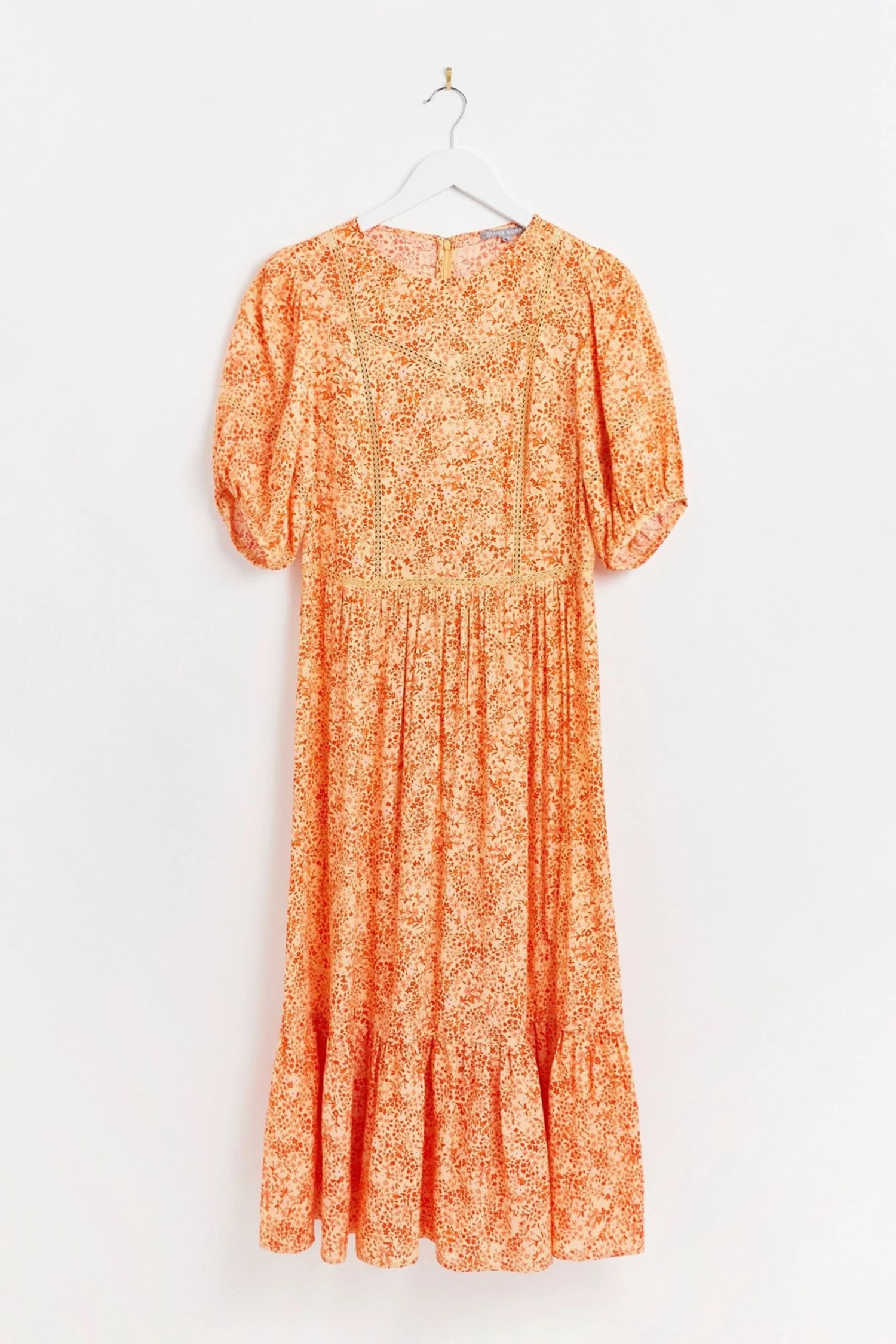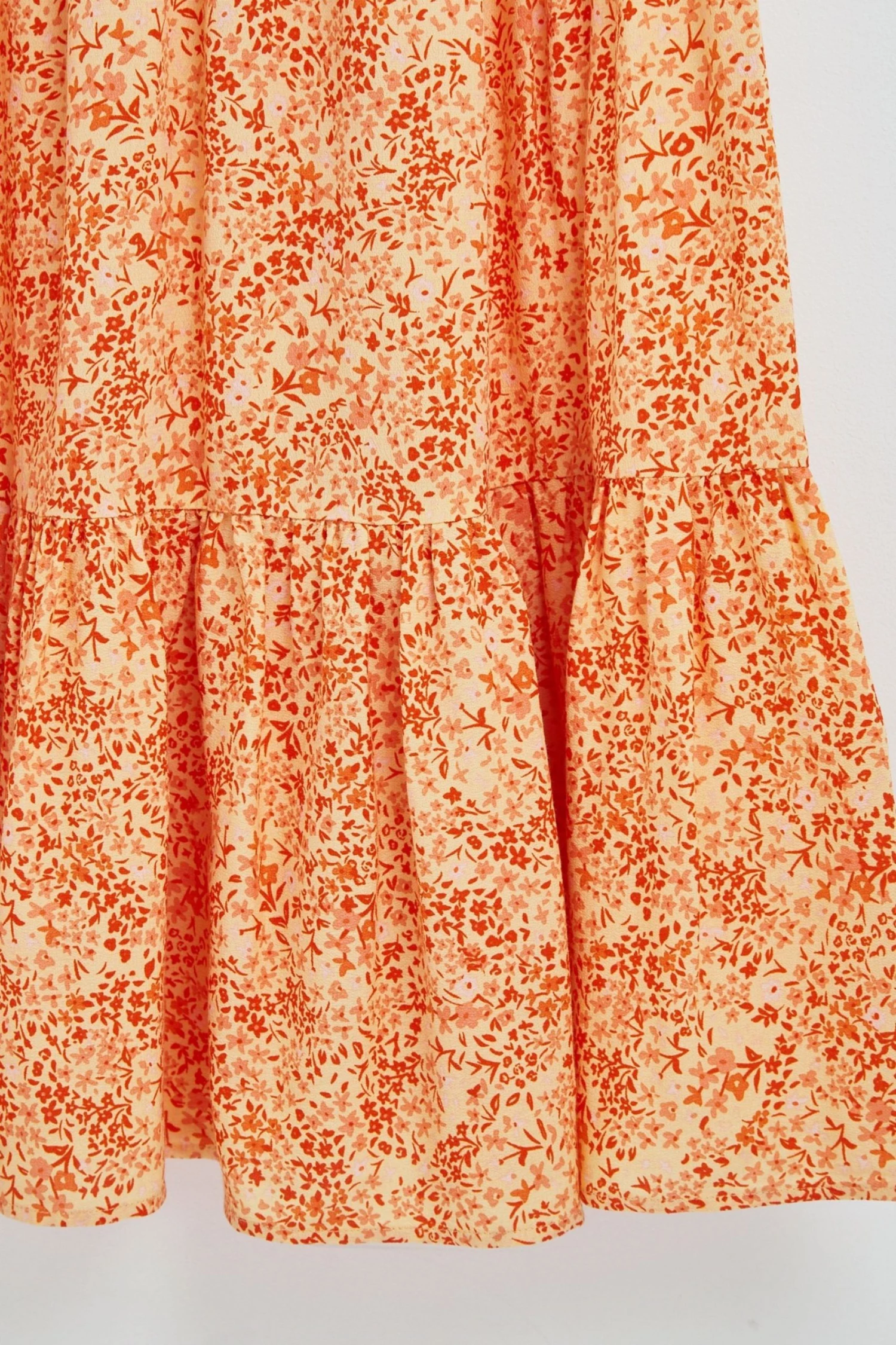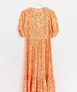 With a tiered skirt on a leaf pattern fabric, this tonal orange midi dress features stitch detail embellishments and short sleeves for a pretty and practical addition to your wardrobe.