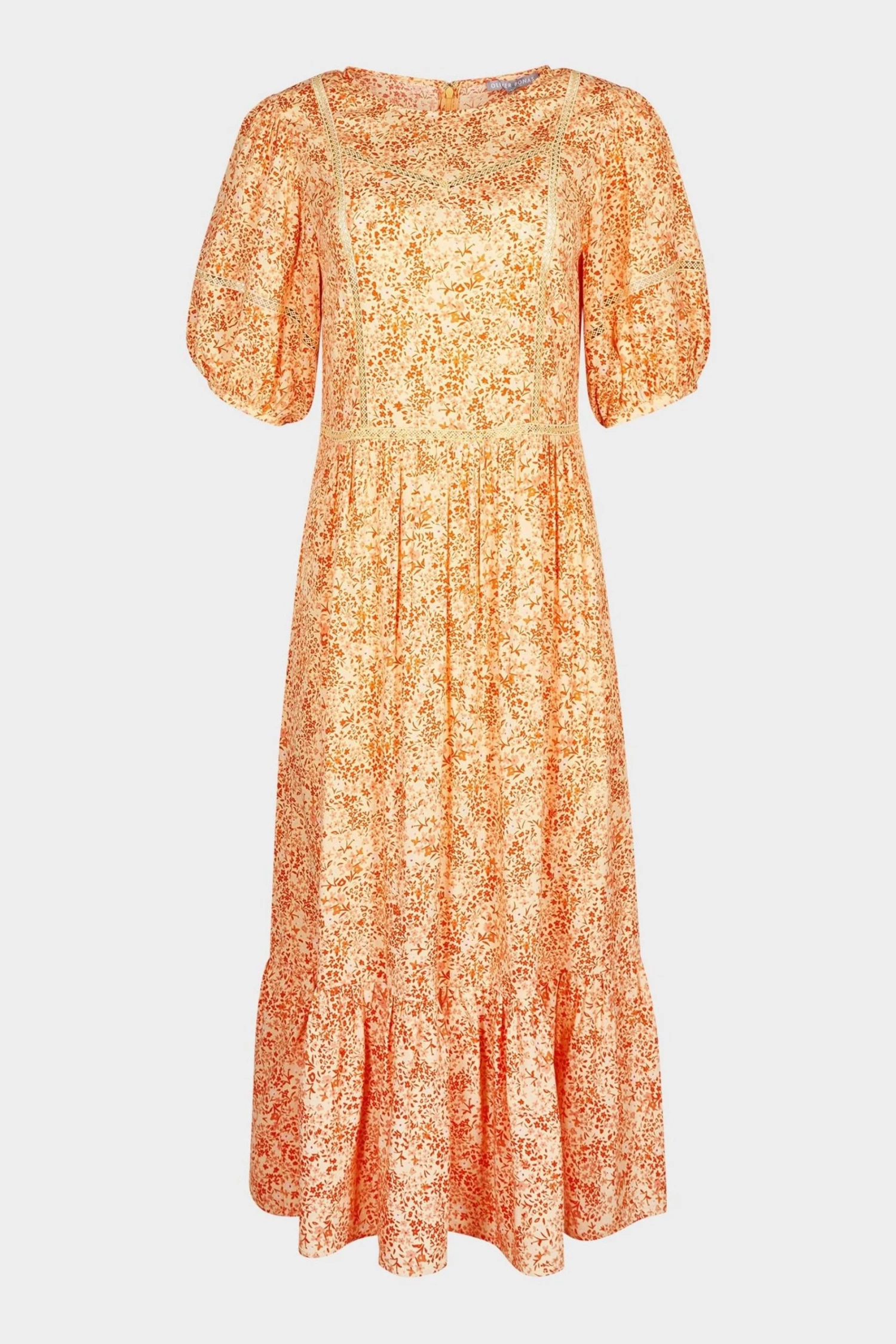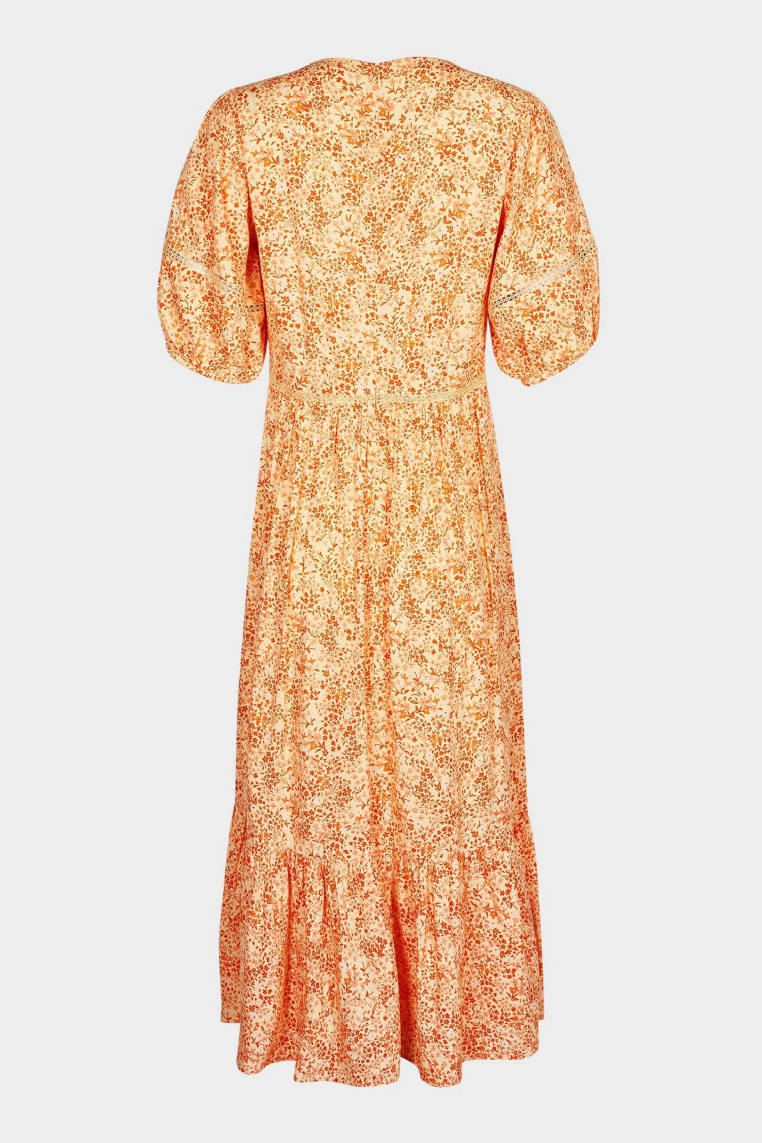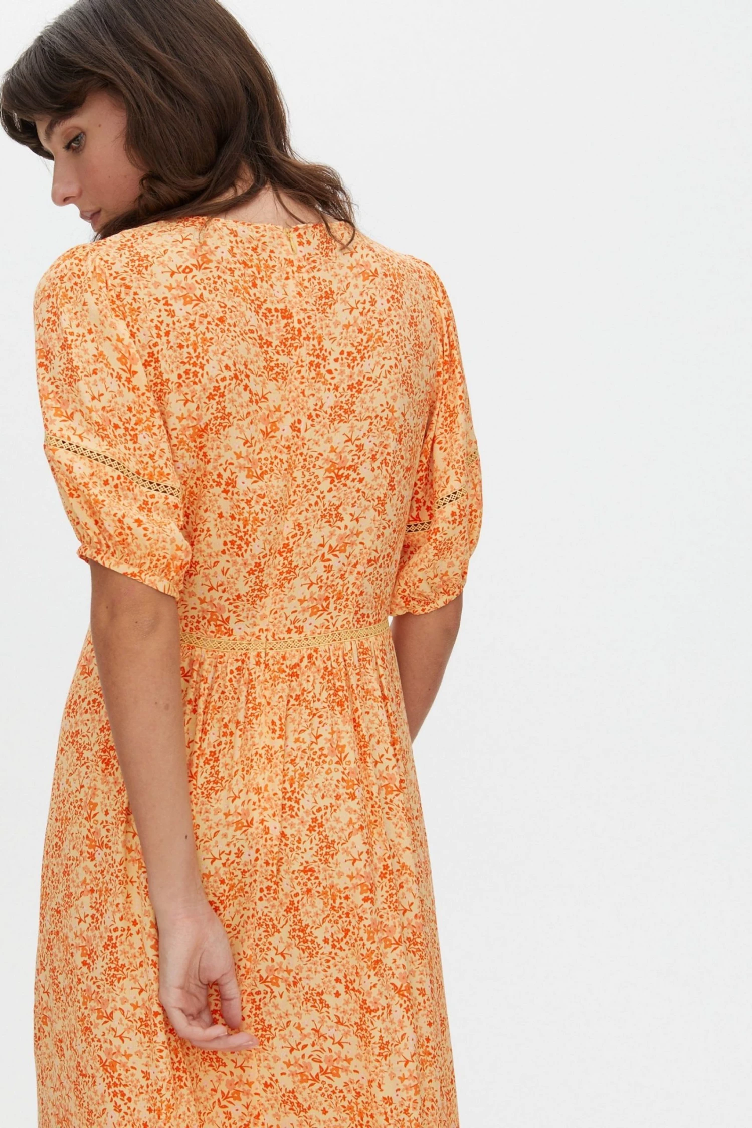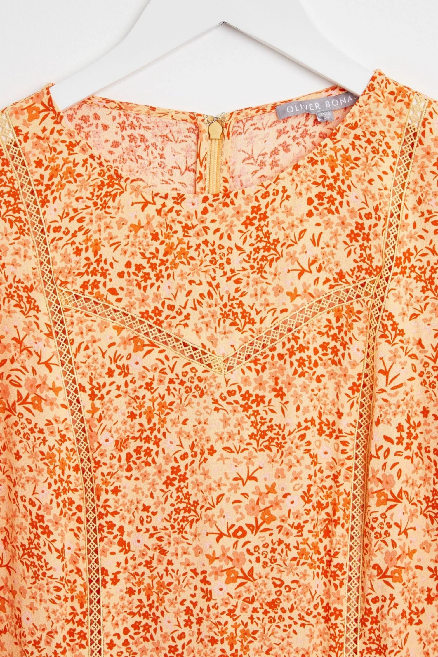 With a tiered skirt on a leaf pattern fabric, this tonal orange midi dress features stitch detail embellishments and short sleeves for a pretty and practical addition to your wardrobe.