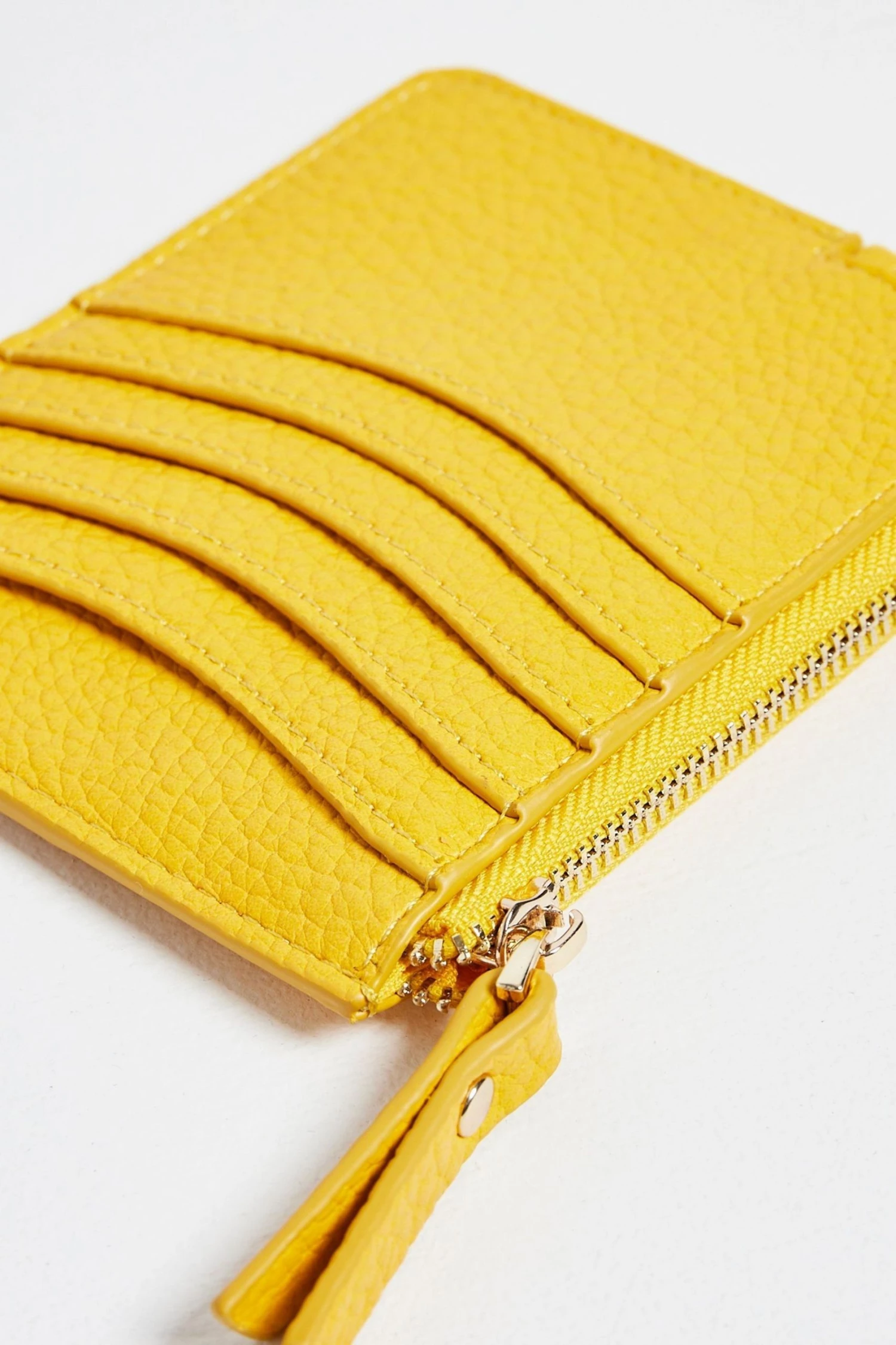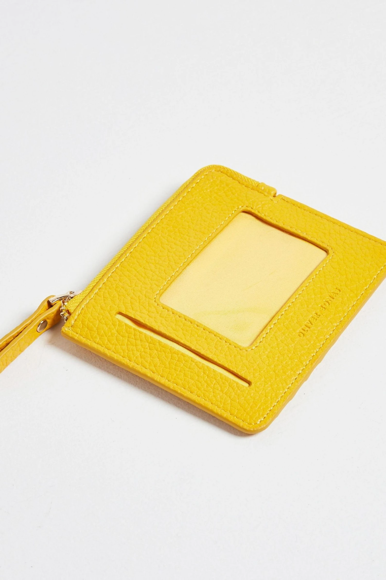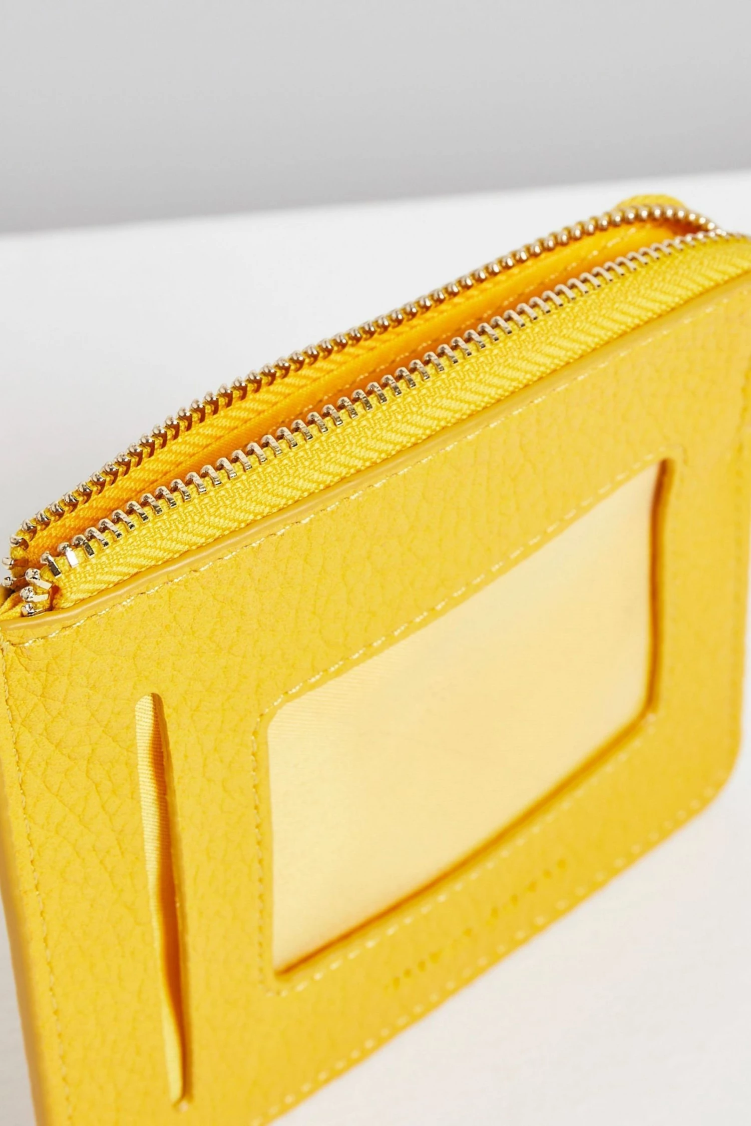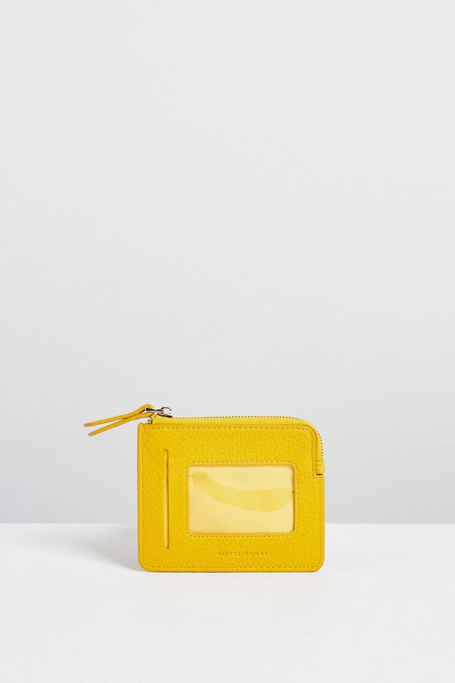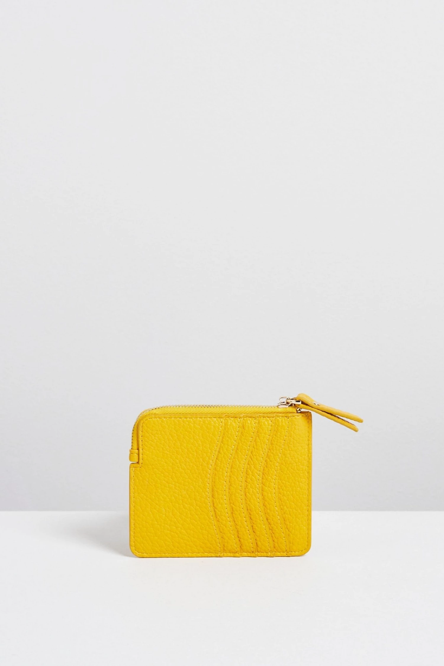 Make waves with the Rinnie Cardholder in a smooth yellow finish with a golden hardware, a zipped coin pocket, five card slots and a clear ID compartment.